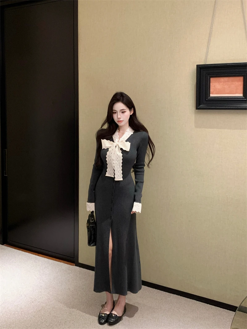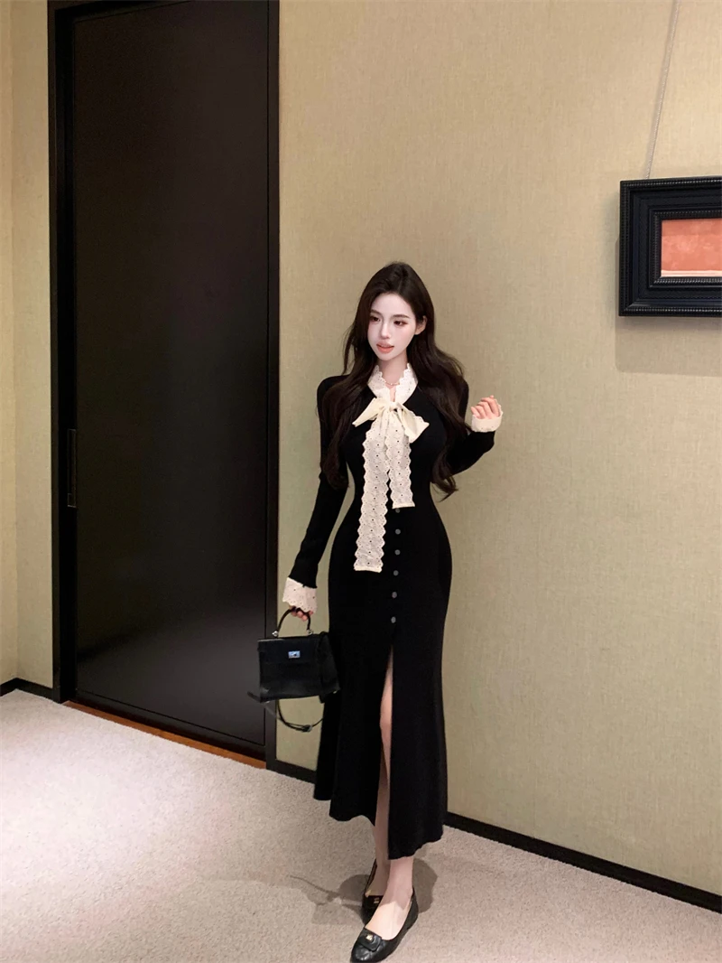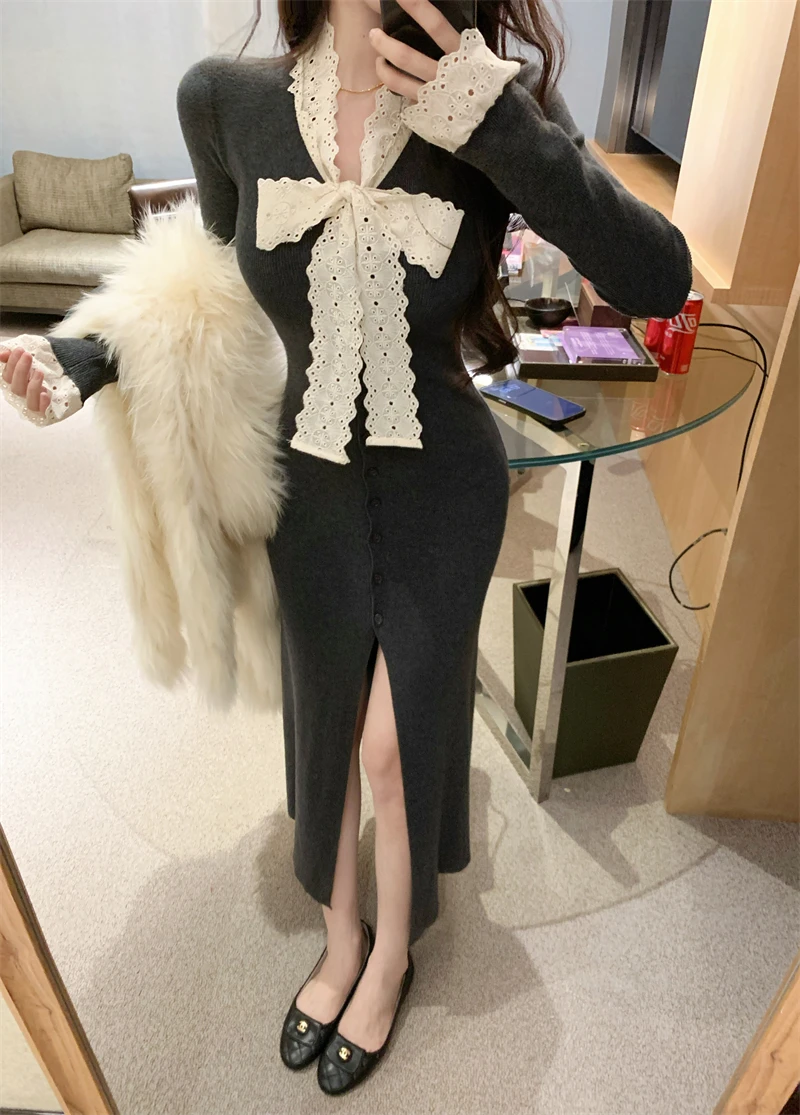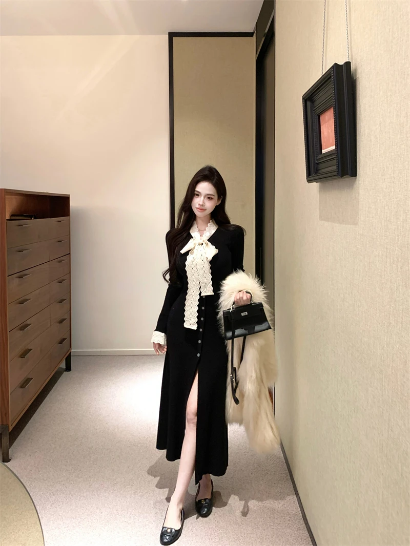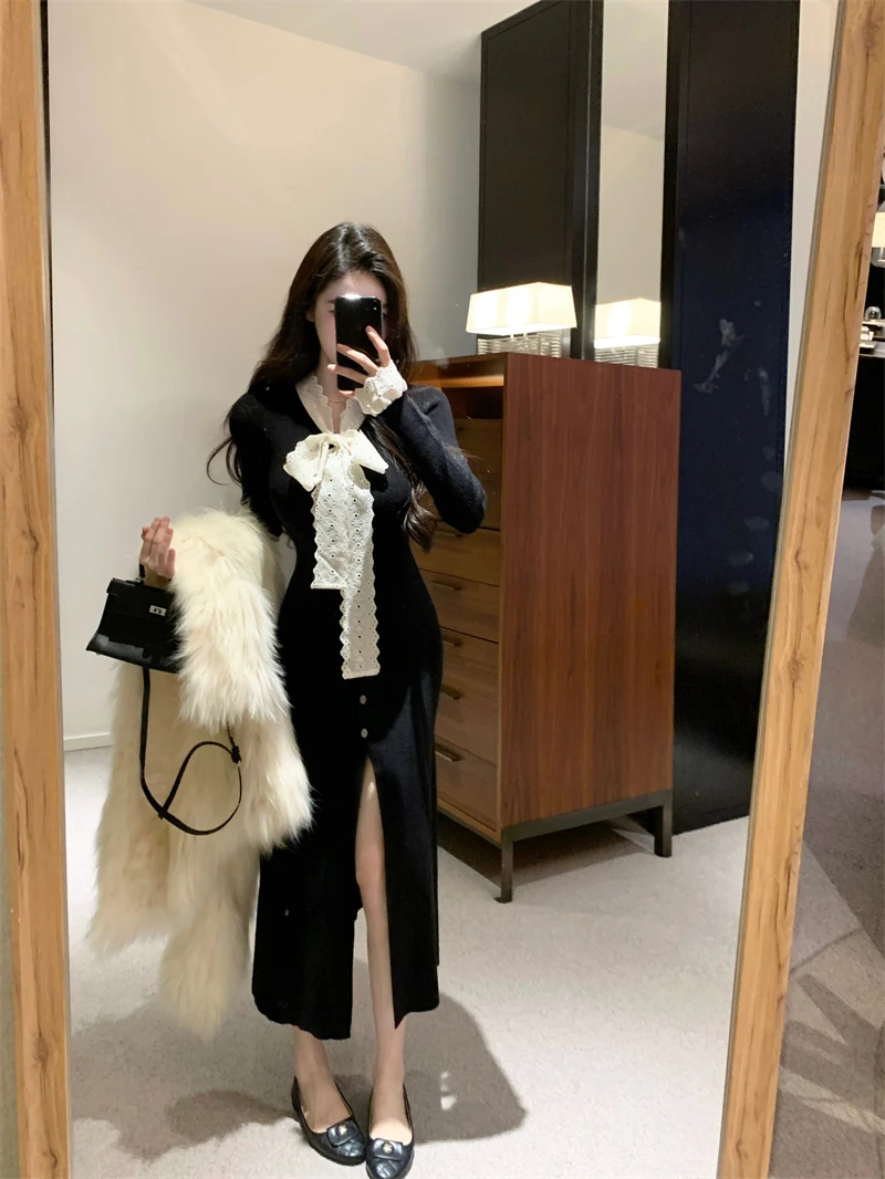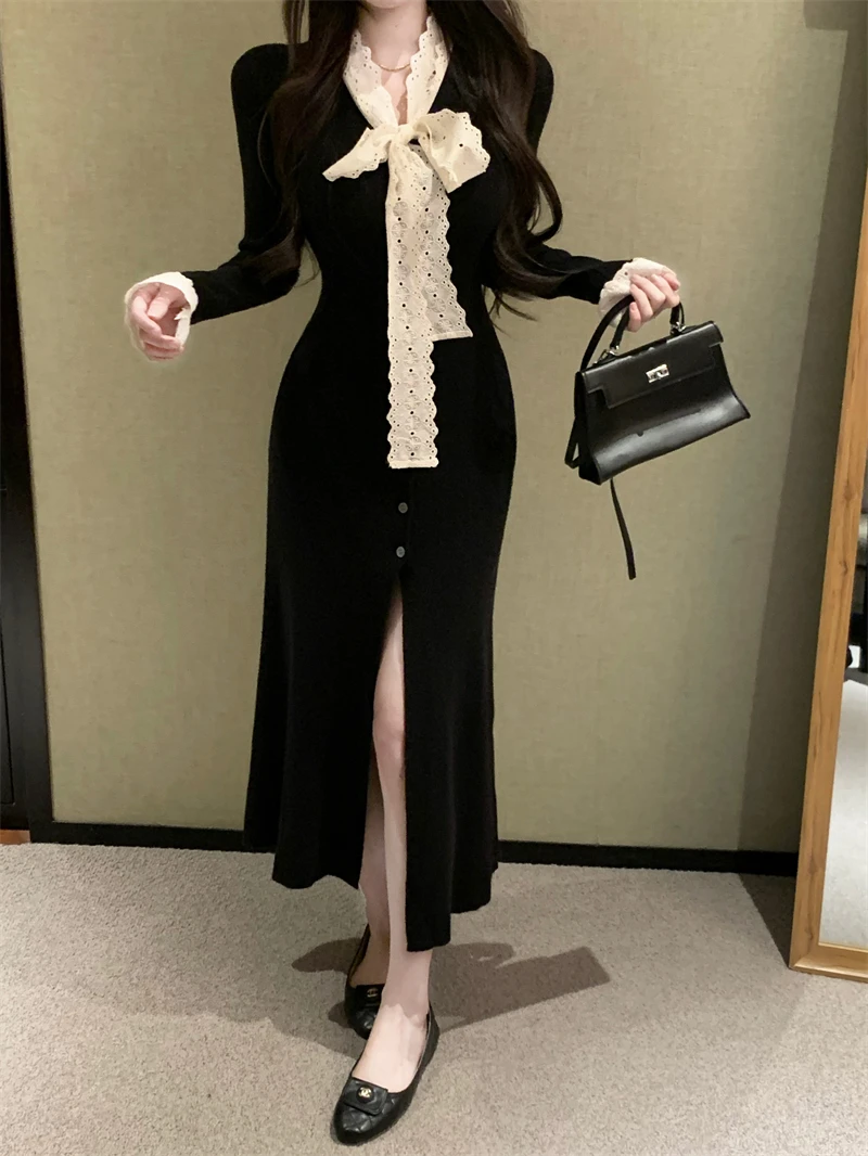Korean 2024 New Women's Patchwork Lace Bow Bandage Dress Autumn Winter Single Breasted Office Lady Slim Split Knitted Dress Chic