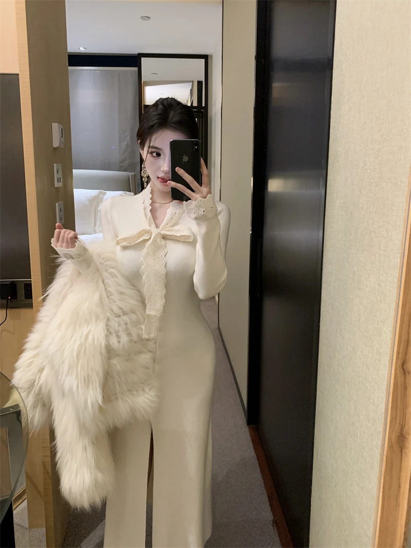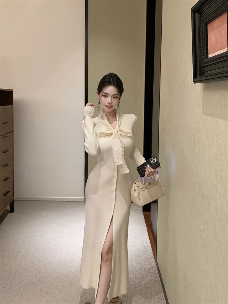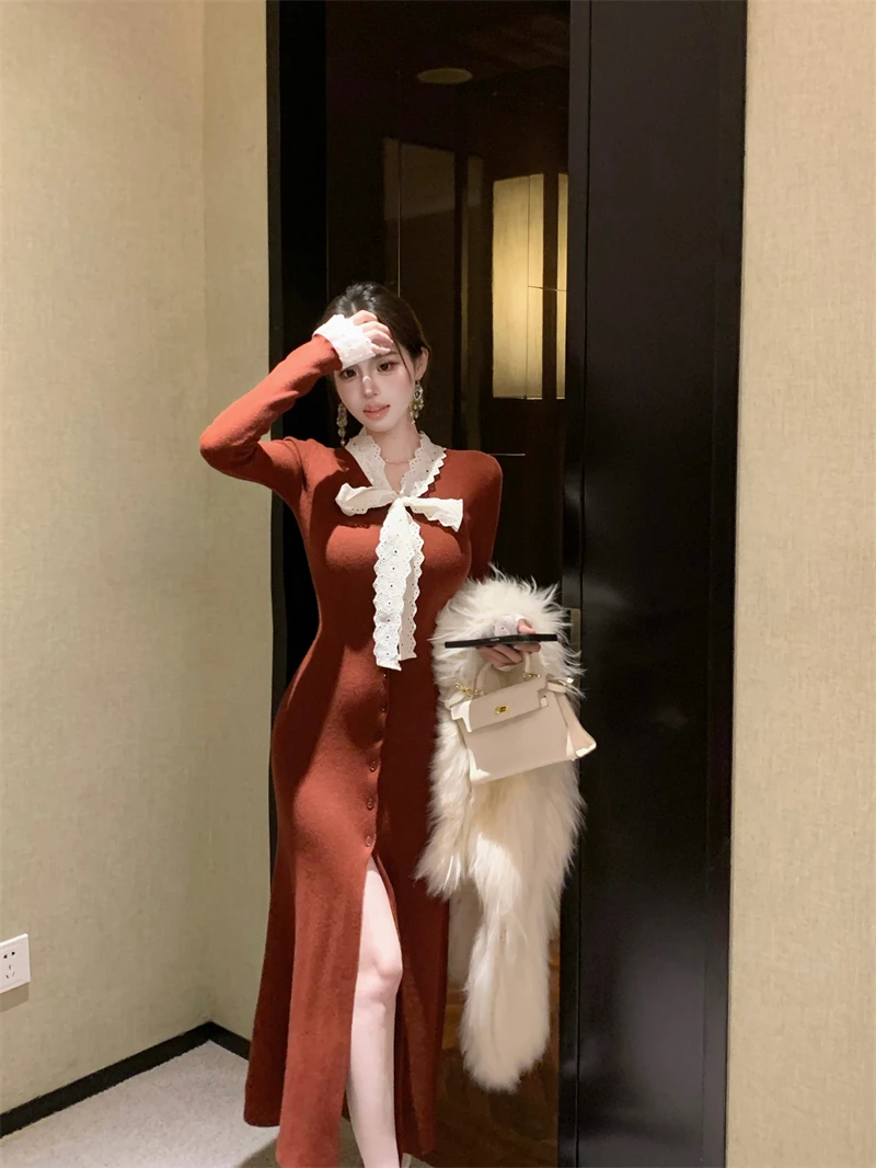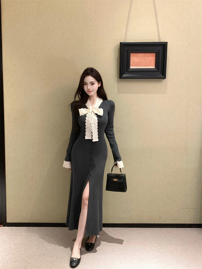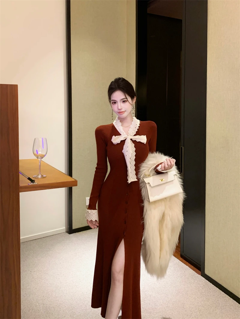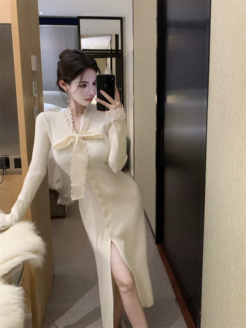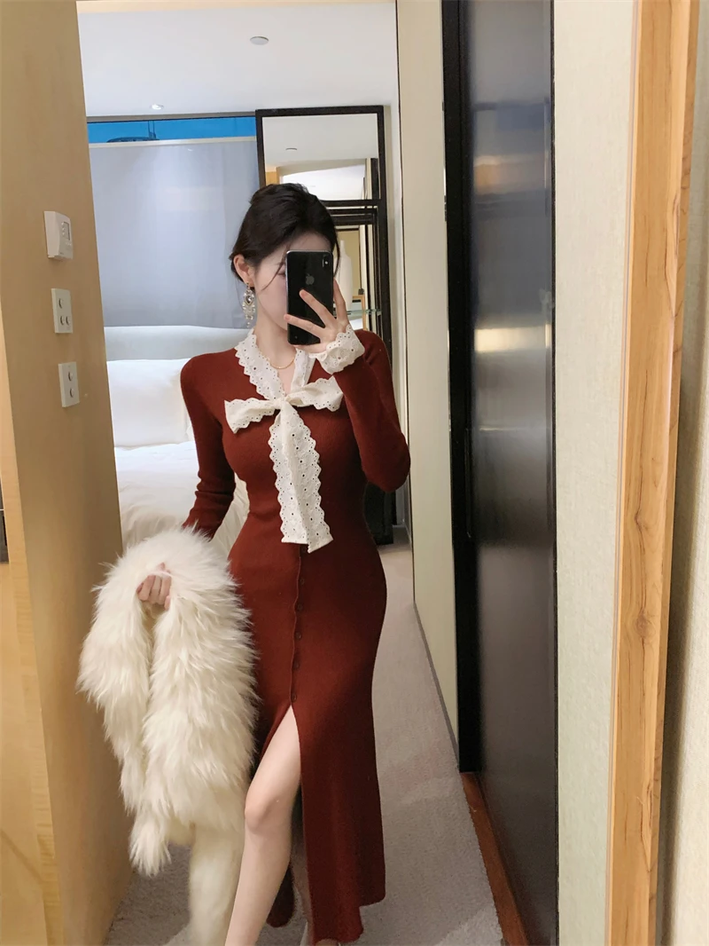 Korean 2024 New Women's Patchwork Lace Bow Bandage Dress Autumn Winter Single Breasted Office Lady Slim Split Knitted Dress Chic