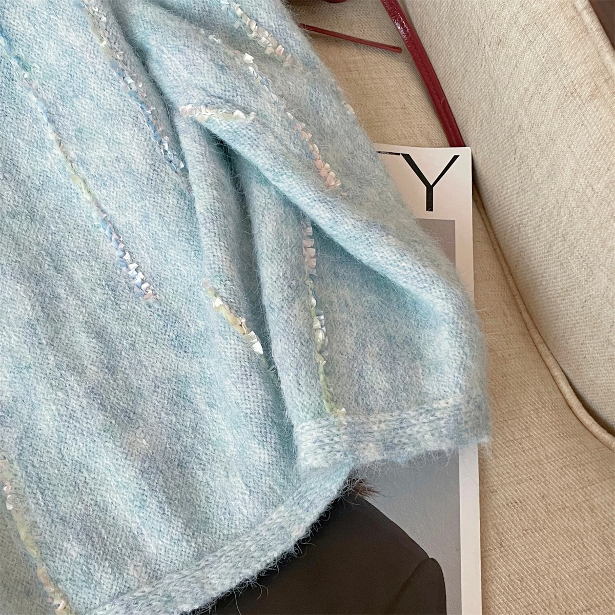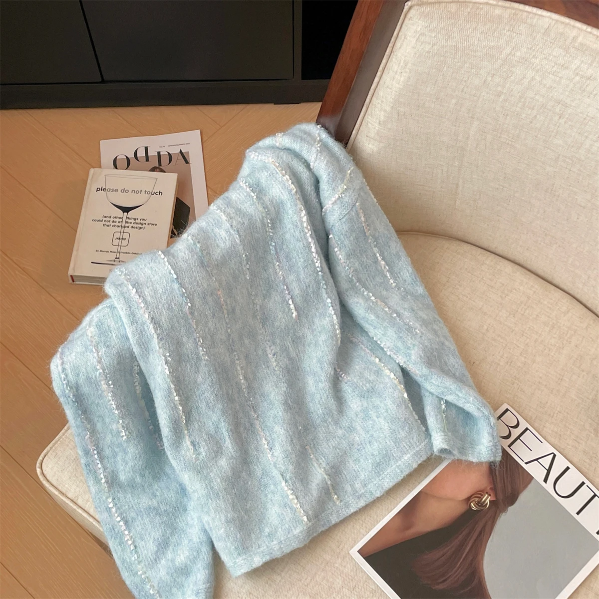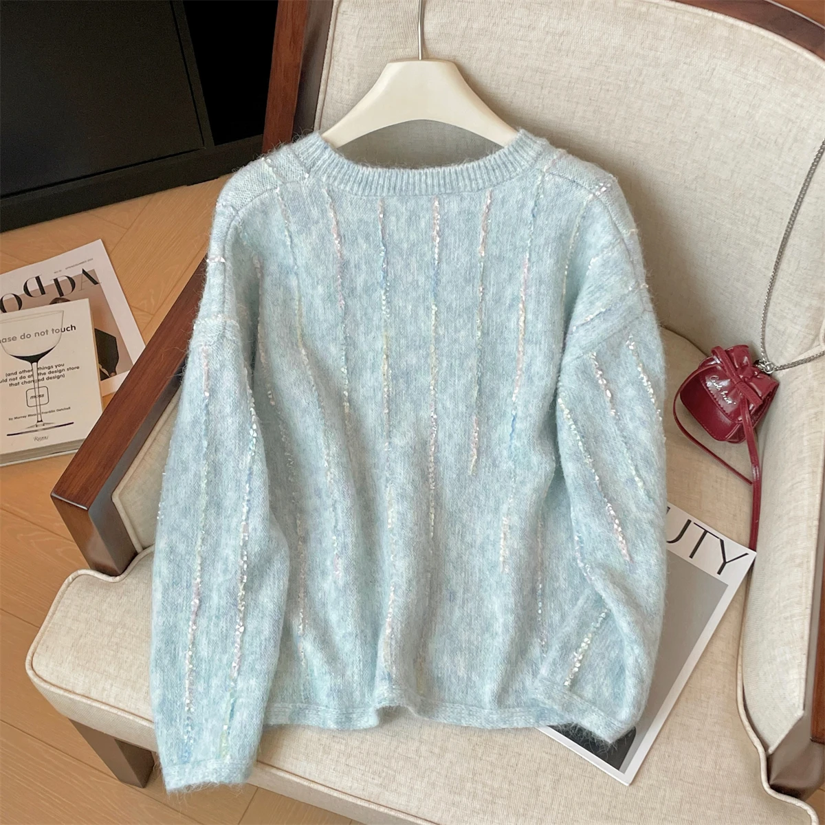 Korean Autumn Winter Beige Long Sleeves Loose Knit Crochet Sweater Women's Blue Round Neck Versatile Short Pullover Tops Popular
