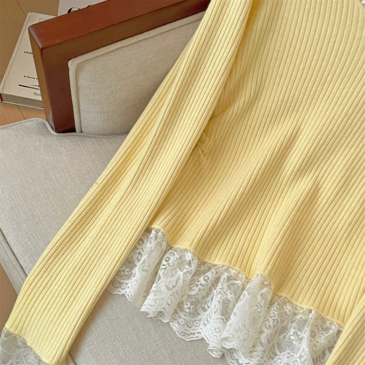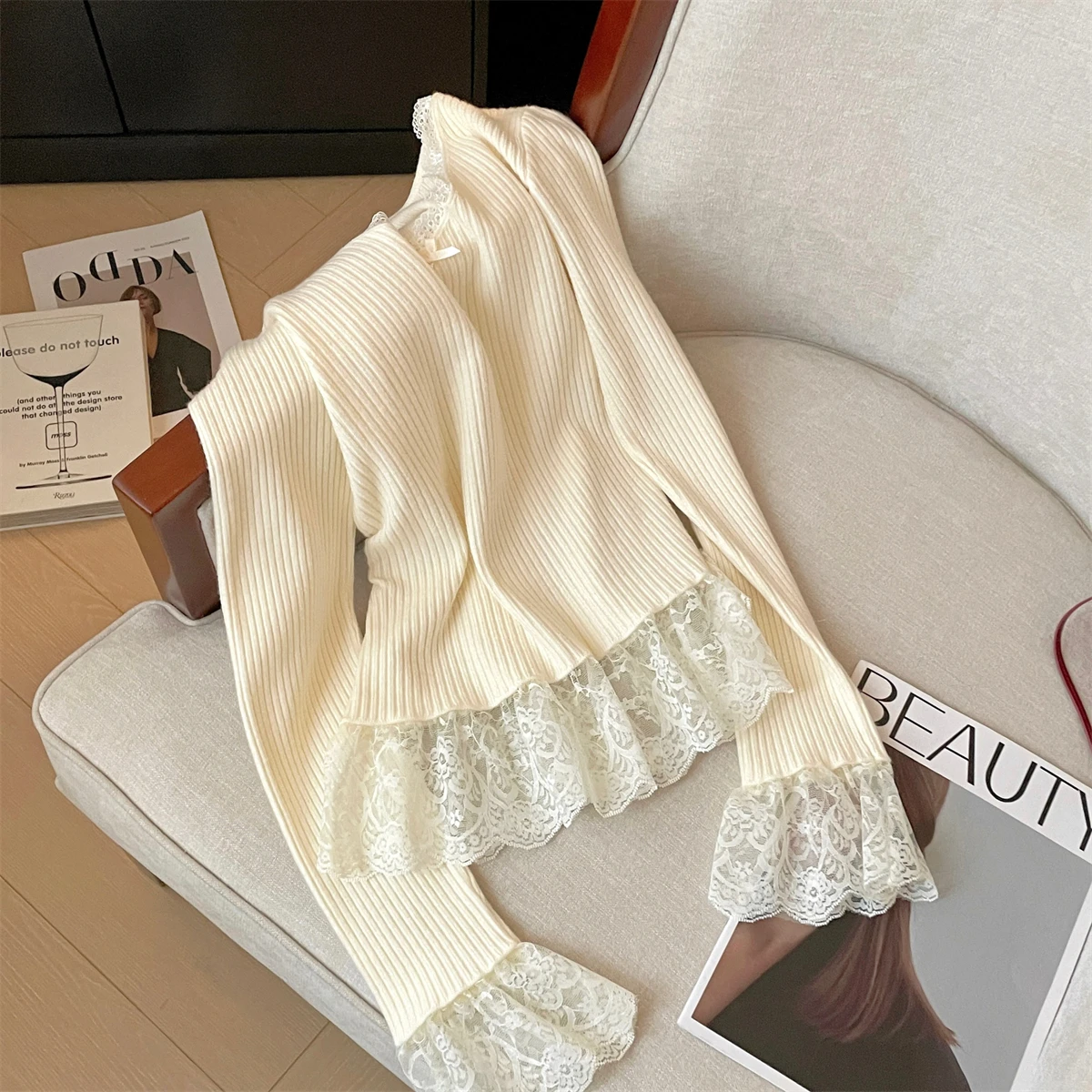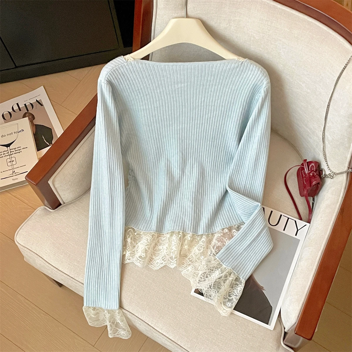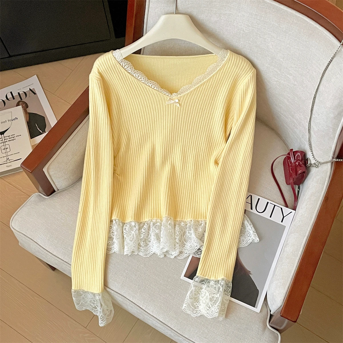 Korean Autumn Winter Sweet Patchwork Elegant Pullover Short Sweater Women's 2024 New V Neck Long Sleeved Knitted Tops Streetwear