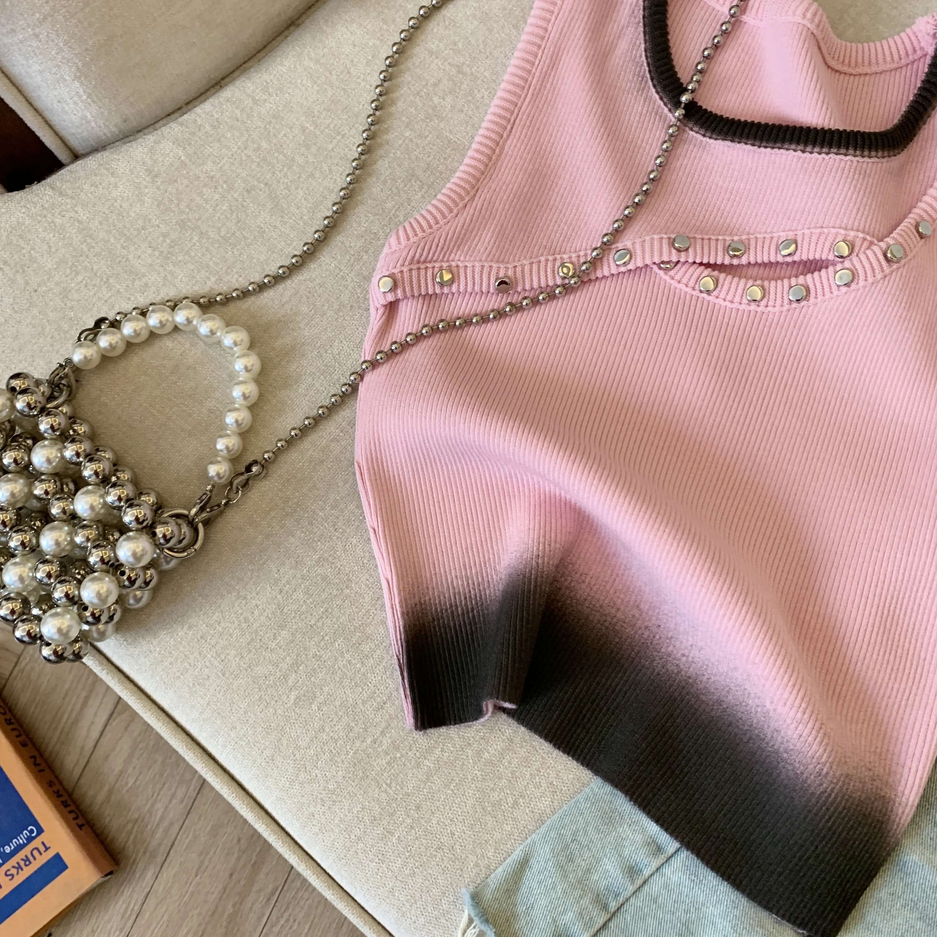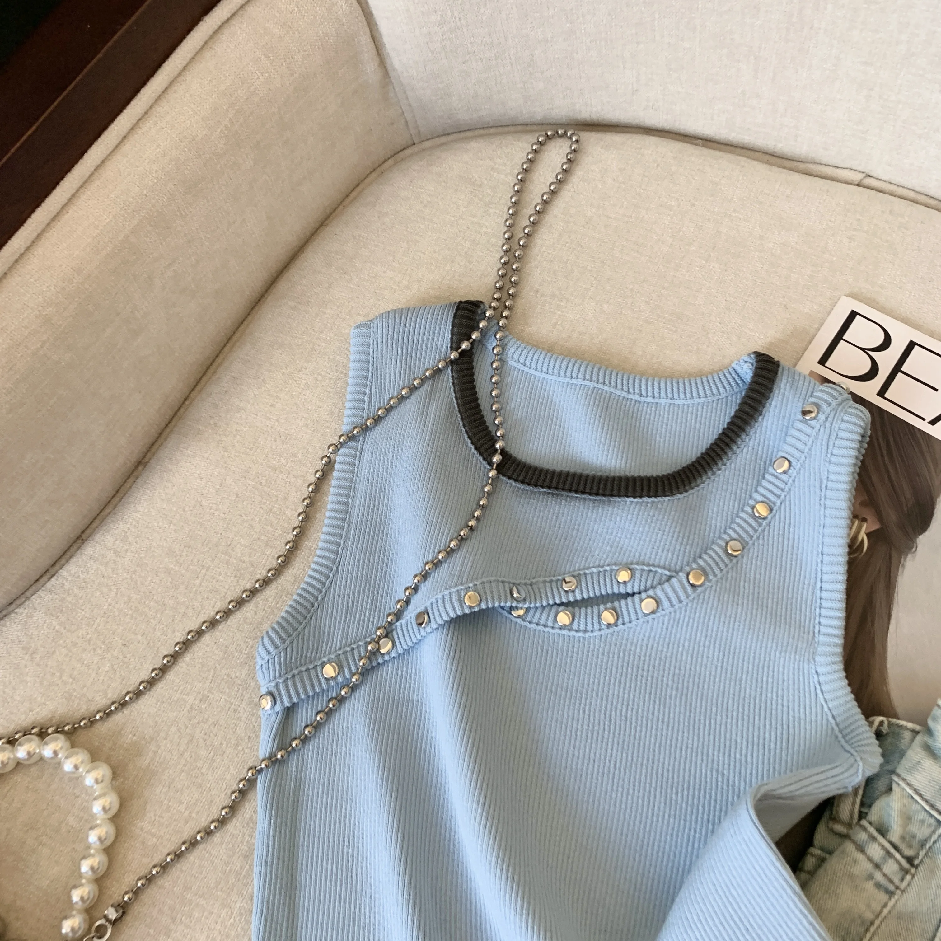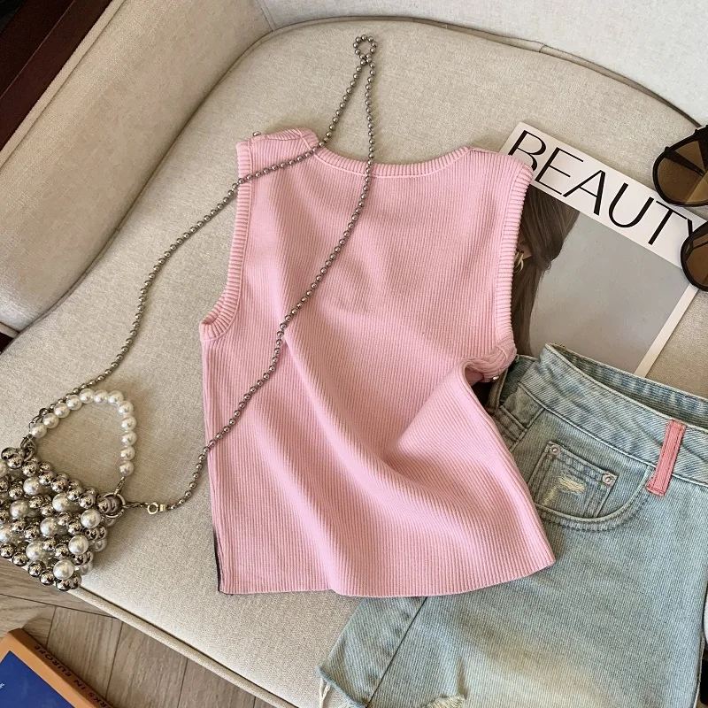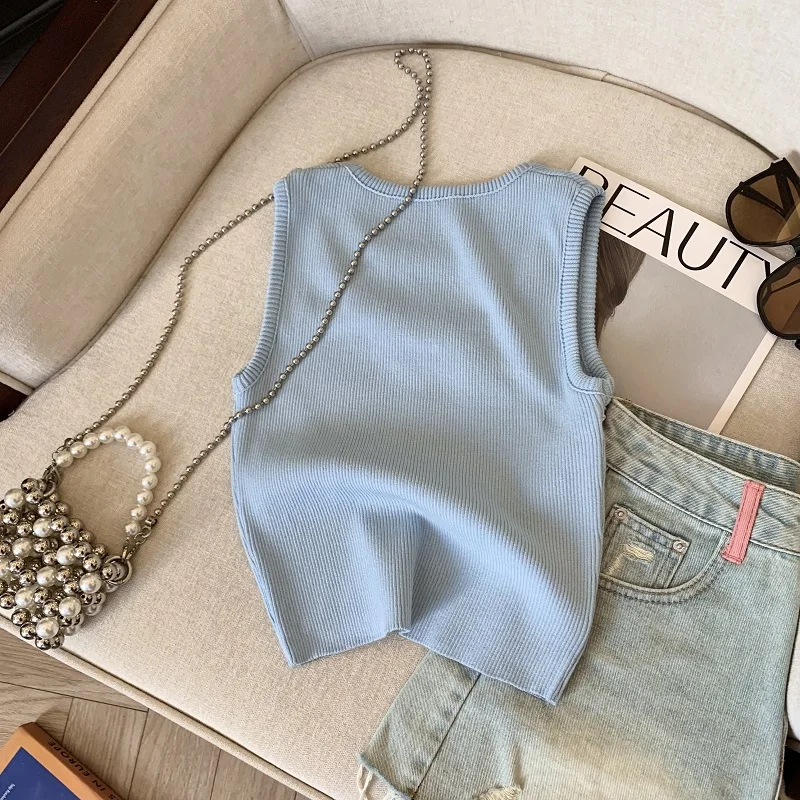 Korean Blue Pink Patchwork Hollow Out Slim Short Knitted Vest Summer Women Round Neck Sleeveless Holiday Pullover Tops 2025 Chic