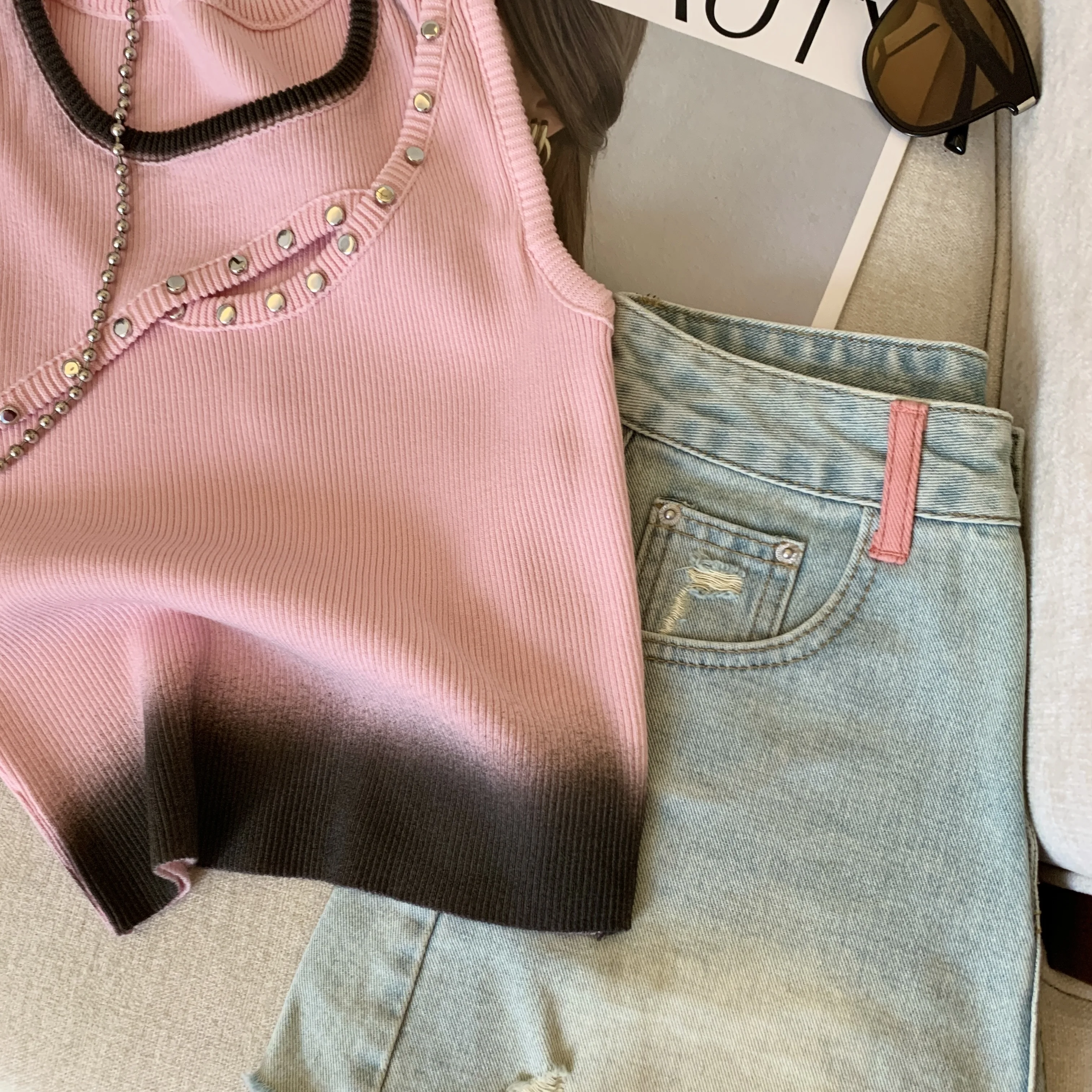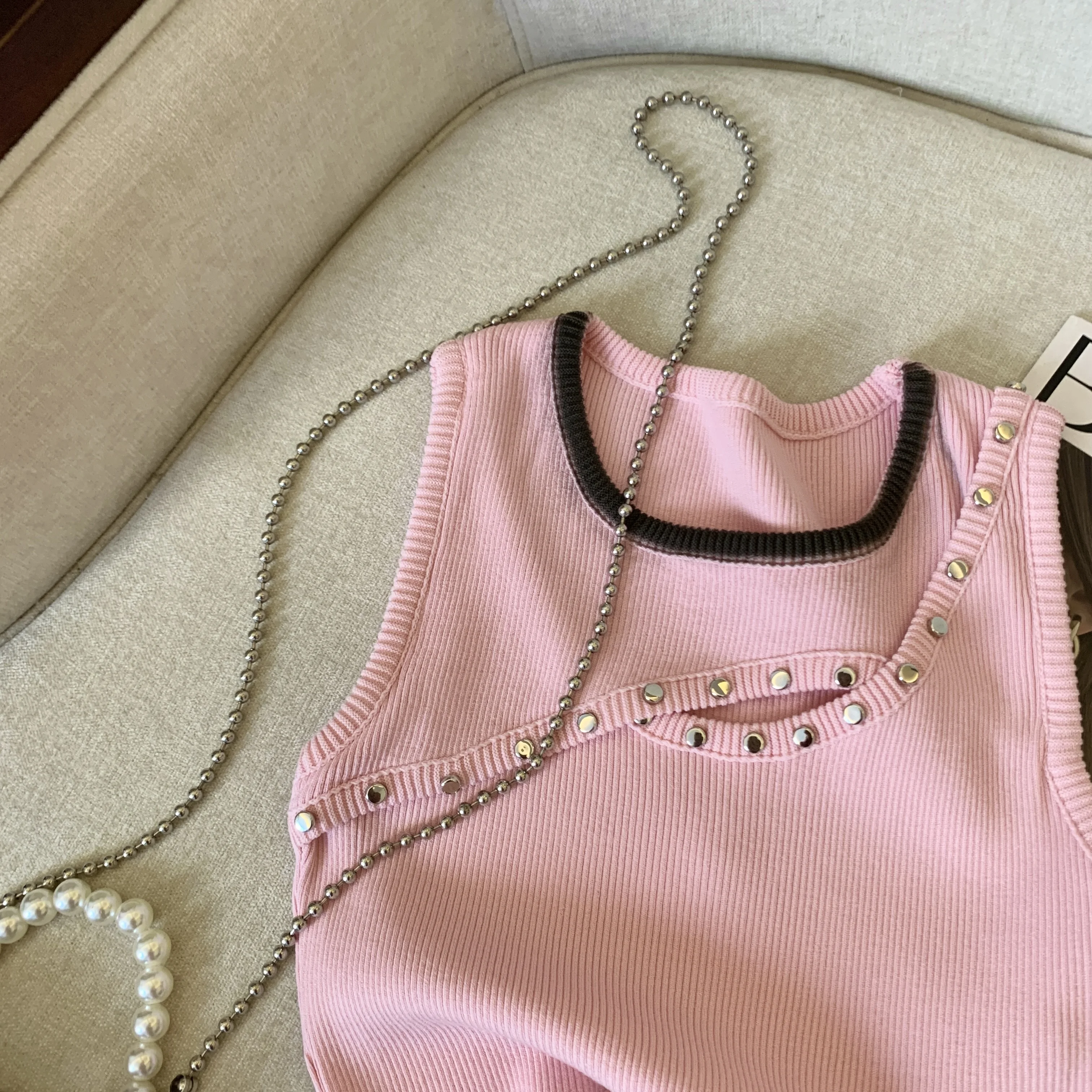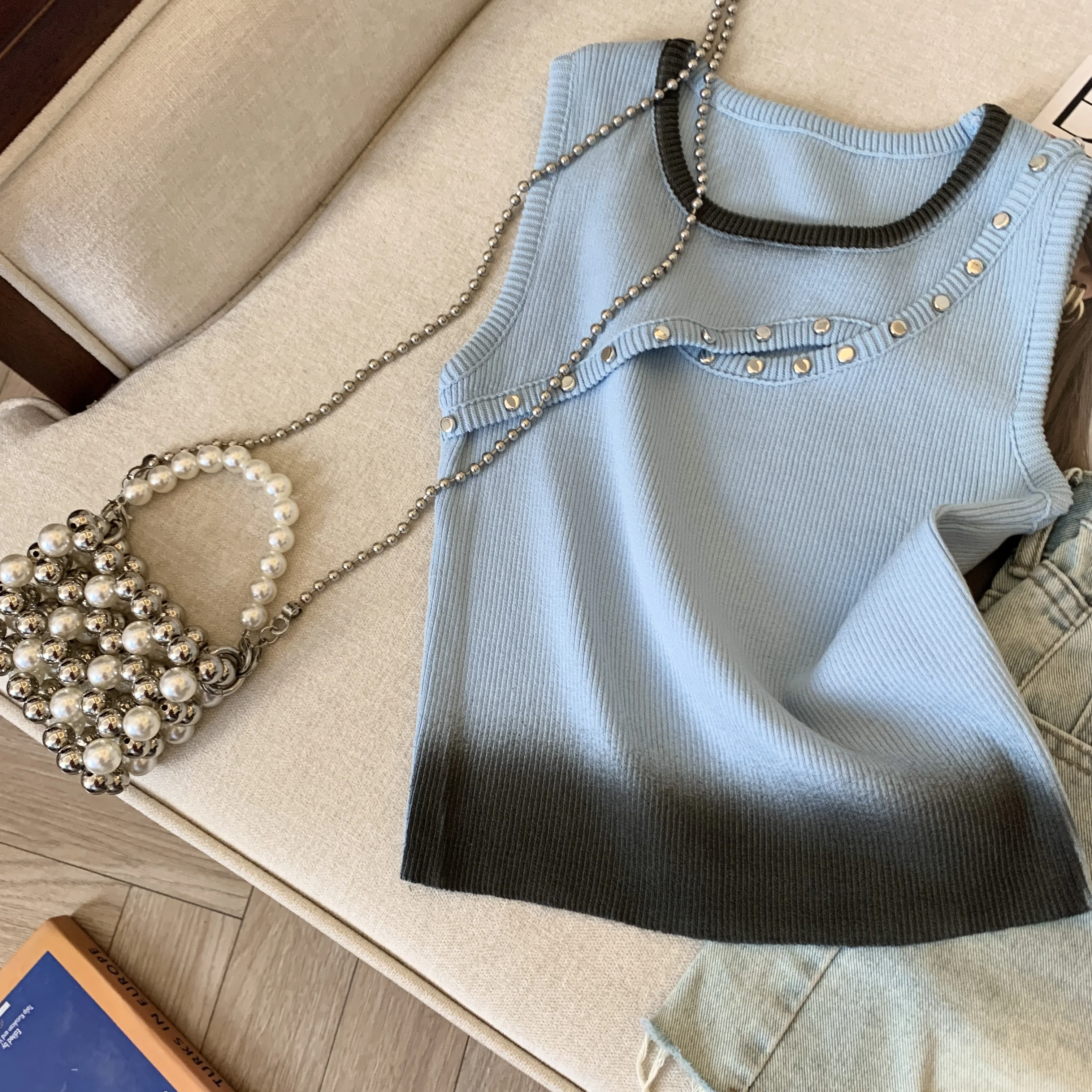 Korean Blue Pink Patchwork Hollow Out Slim Short Knitted Vest Summer Women Round Neck Sleeveless Holiday Pullover Tops 2025 Chic