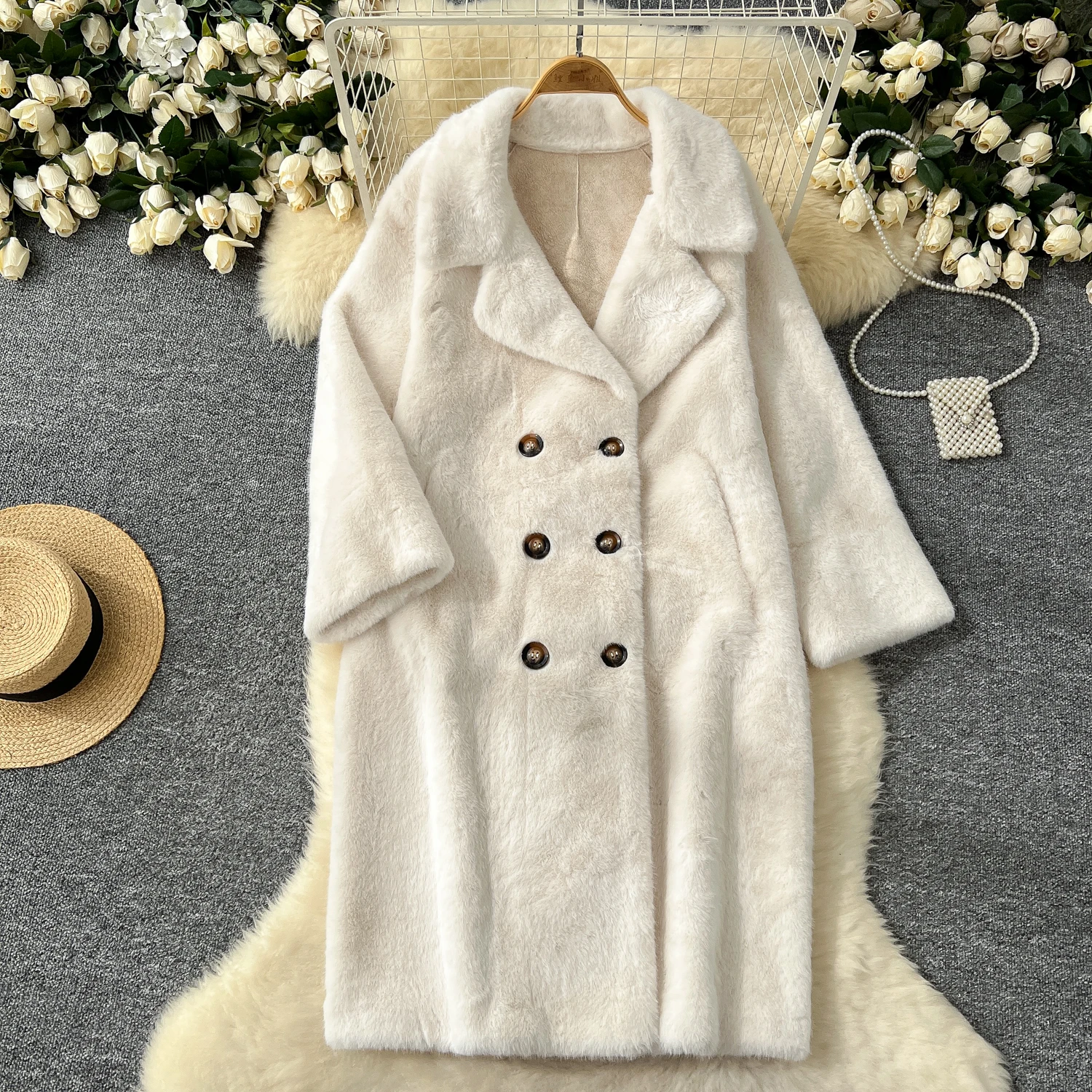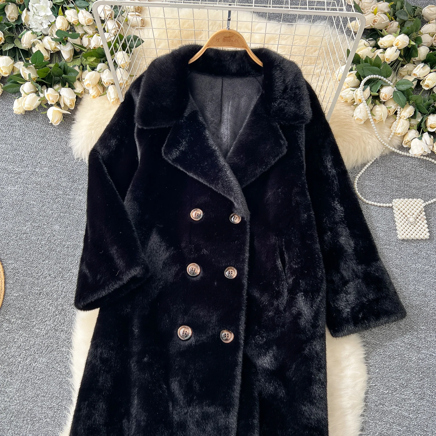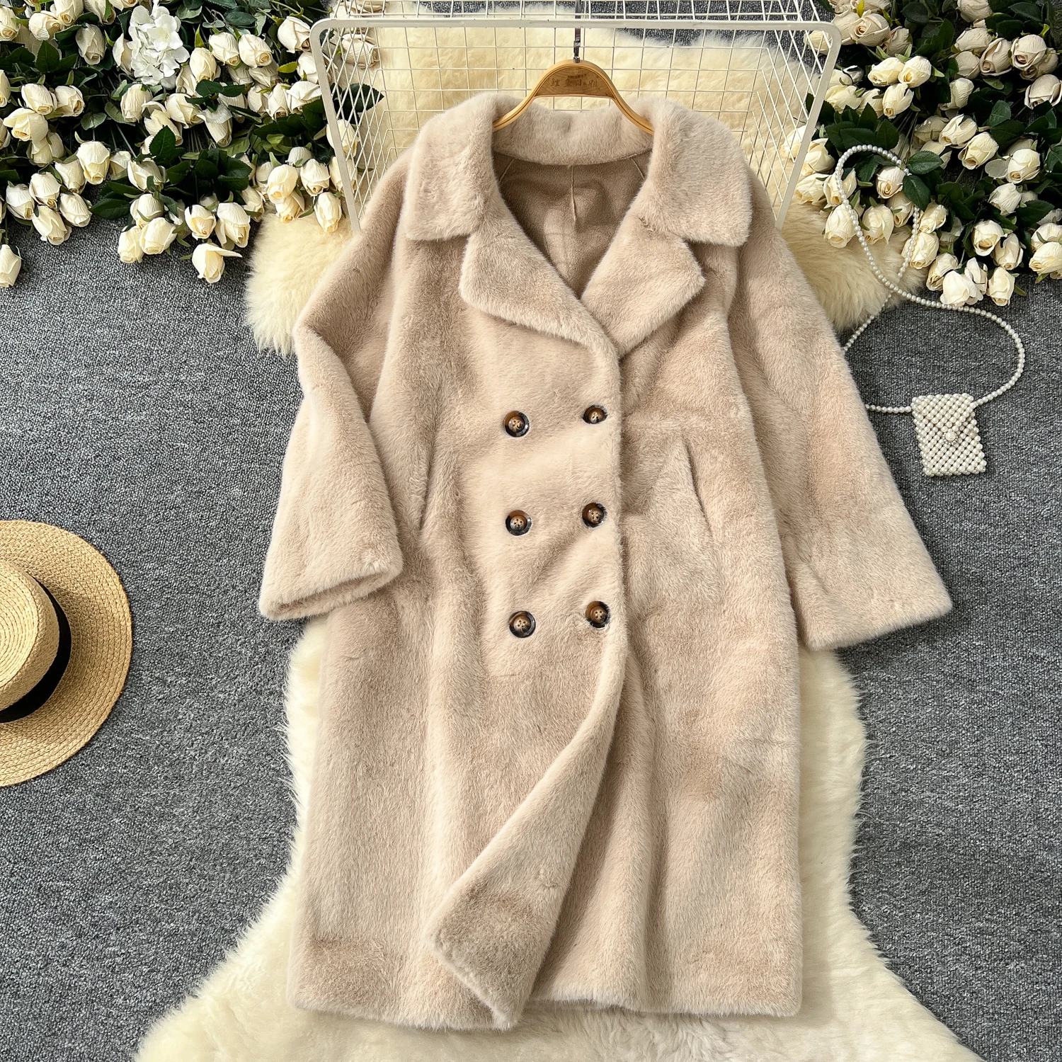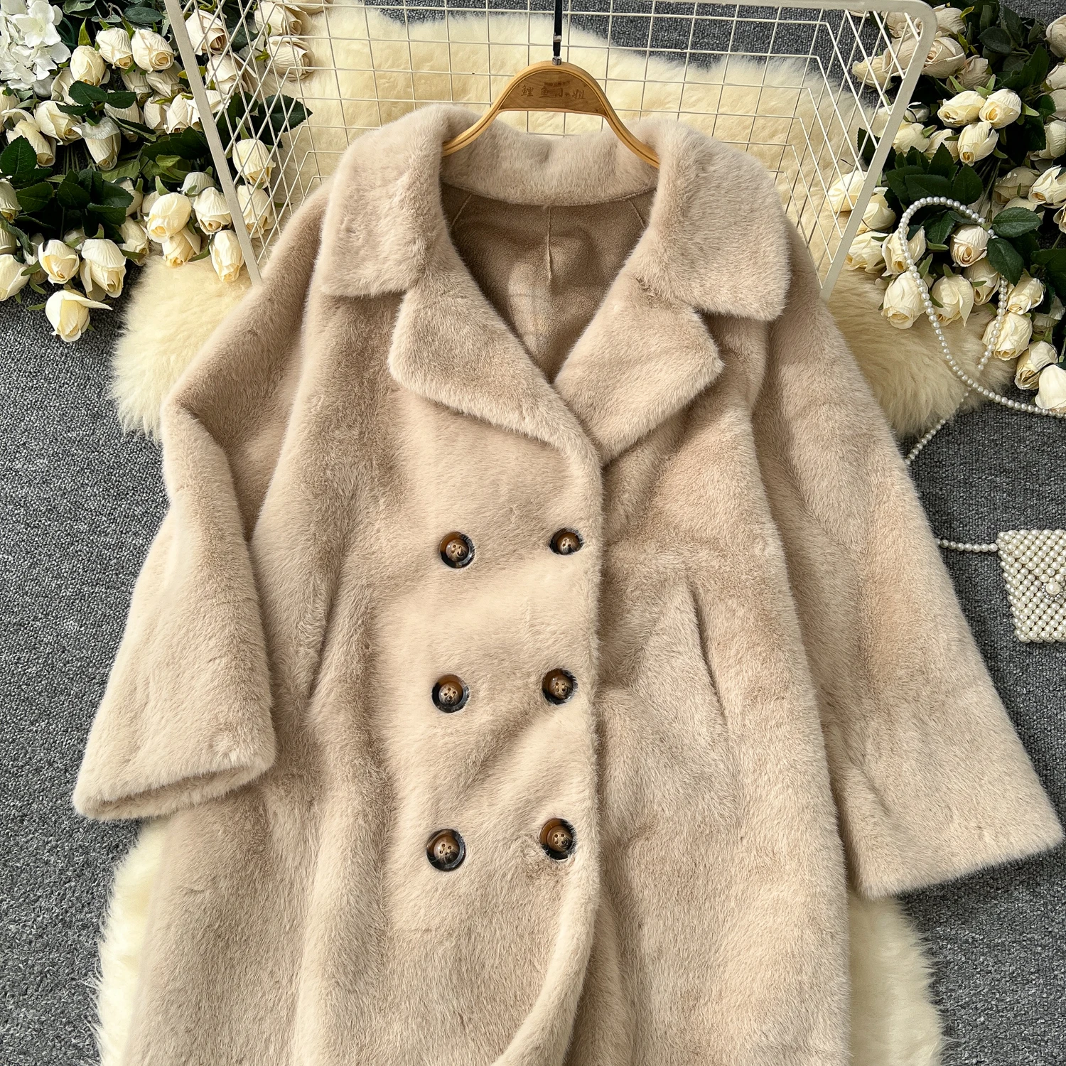 Korean Fashion 2024 Winter Solid Elegant Double-breasted Warm Imitation Mink Fur Coat Women Office Lady Thick Loose Long Jacket
