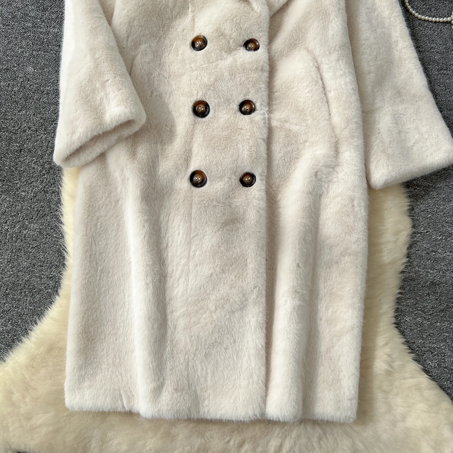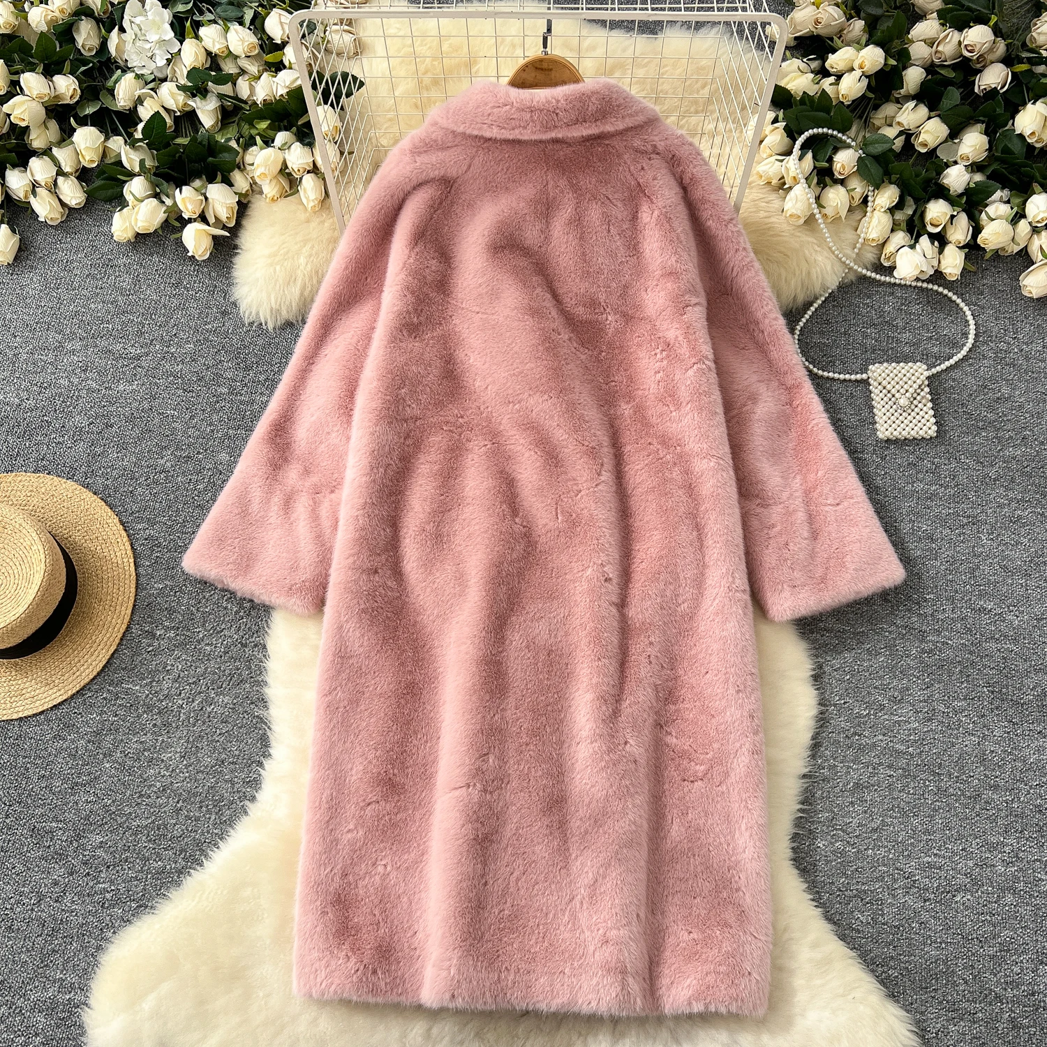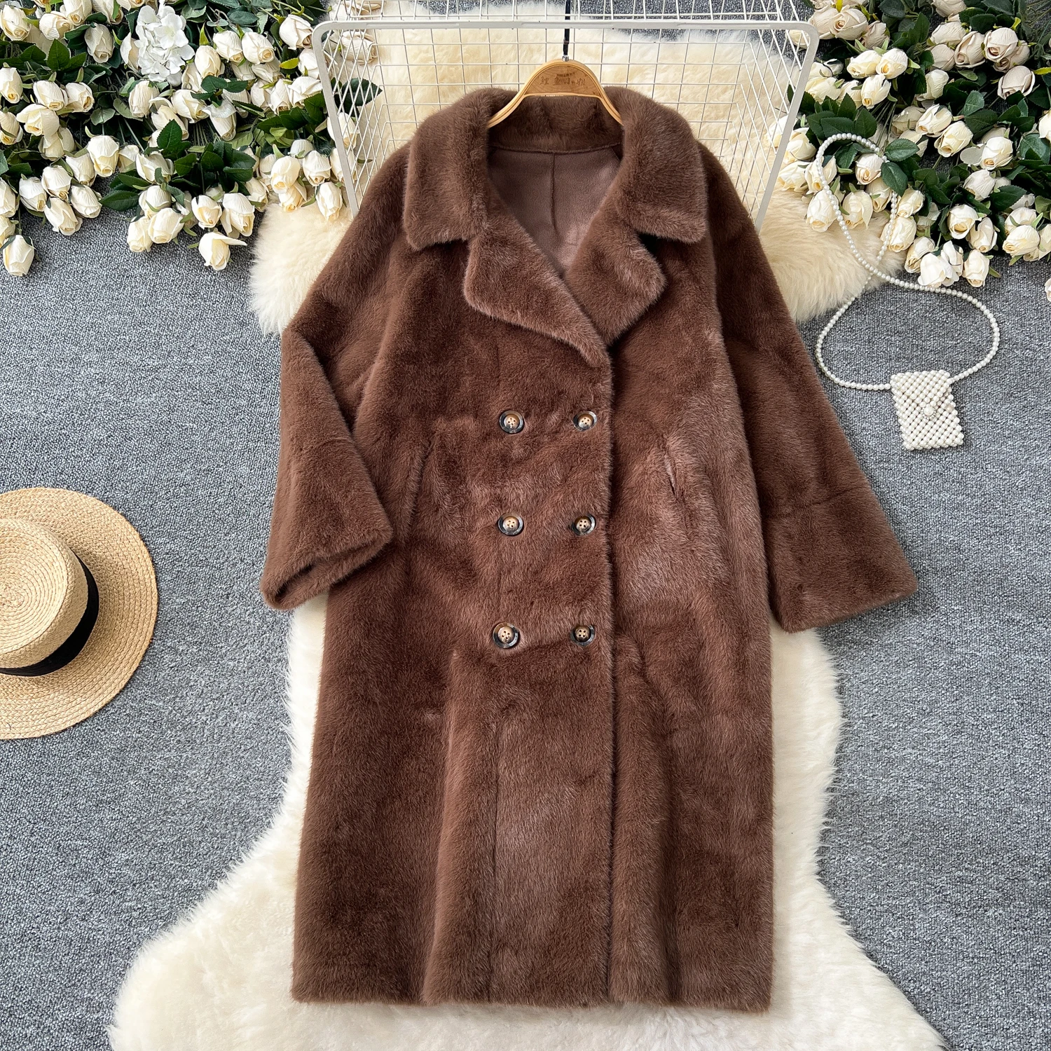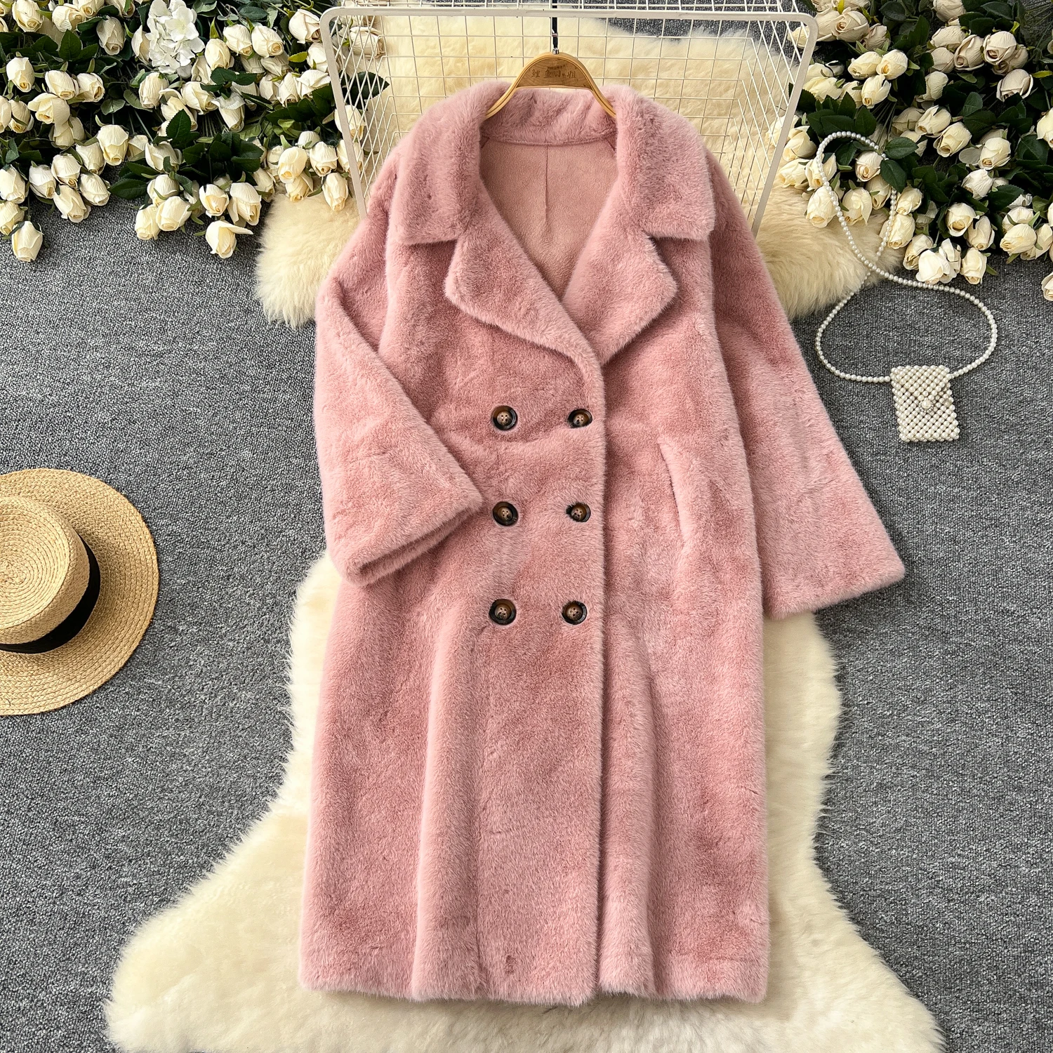 Korean Fashion 2024 Winter Solid Elegant Double-breasted Warm Imitation Mink Fur Coat Women Office Lady Thick Loose Long Jacket
