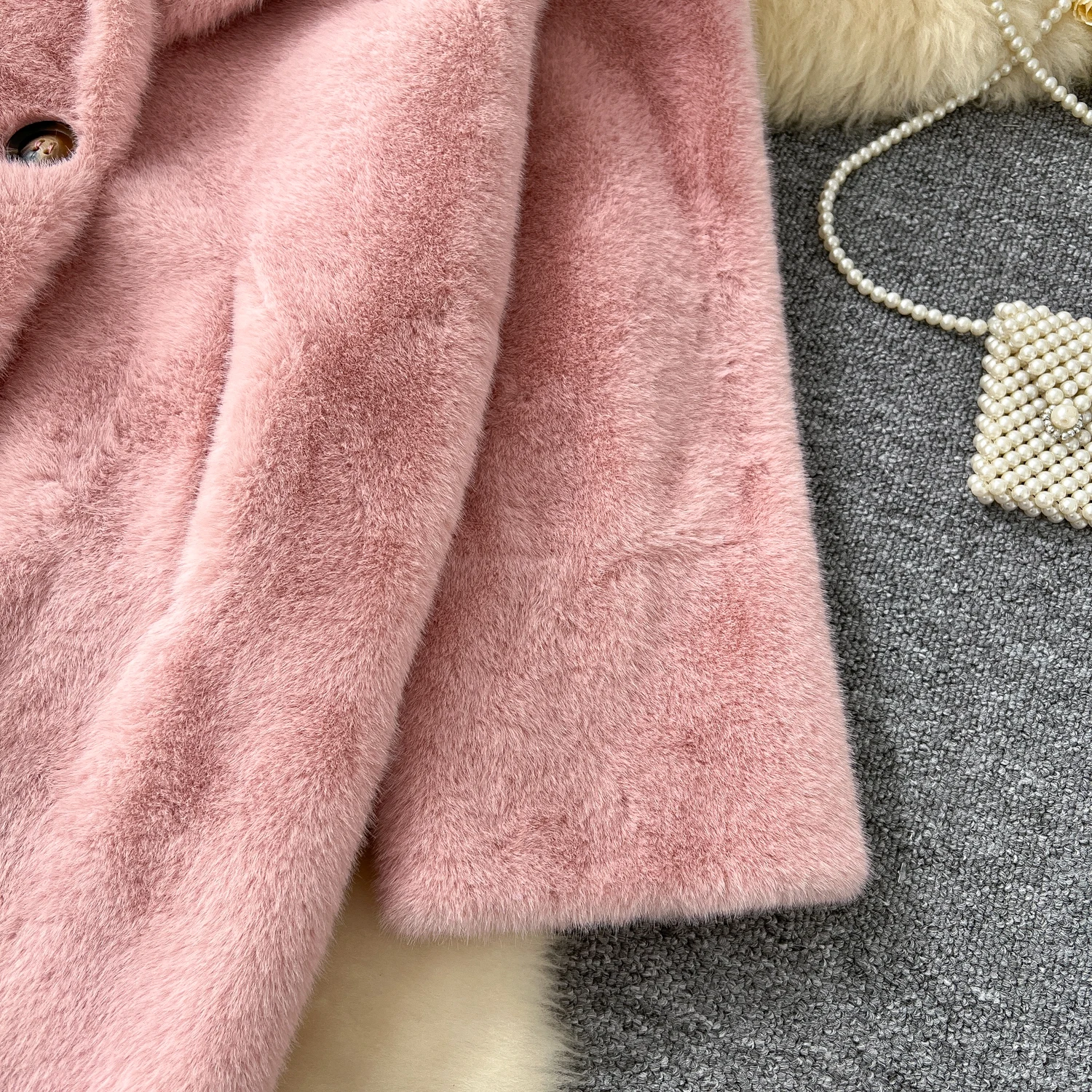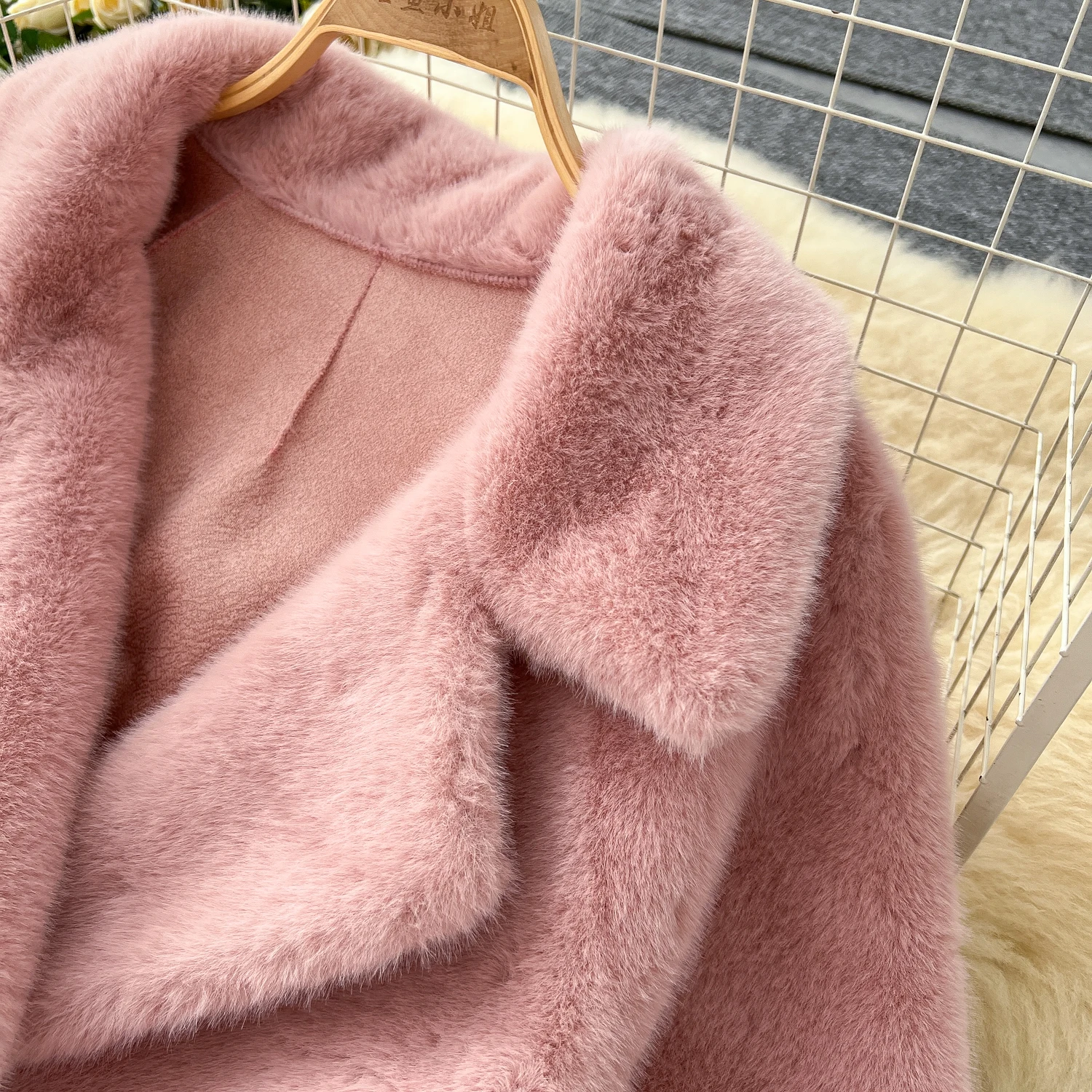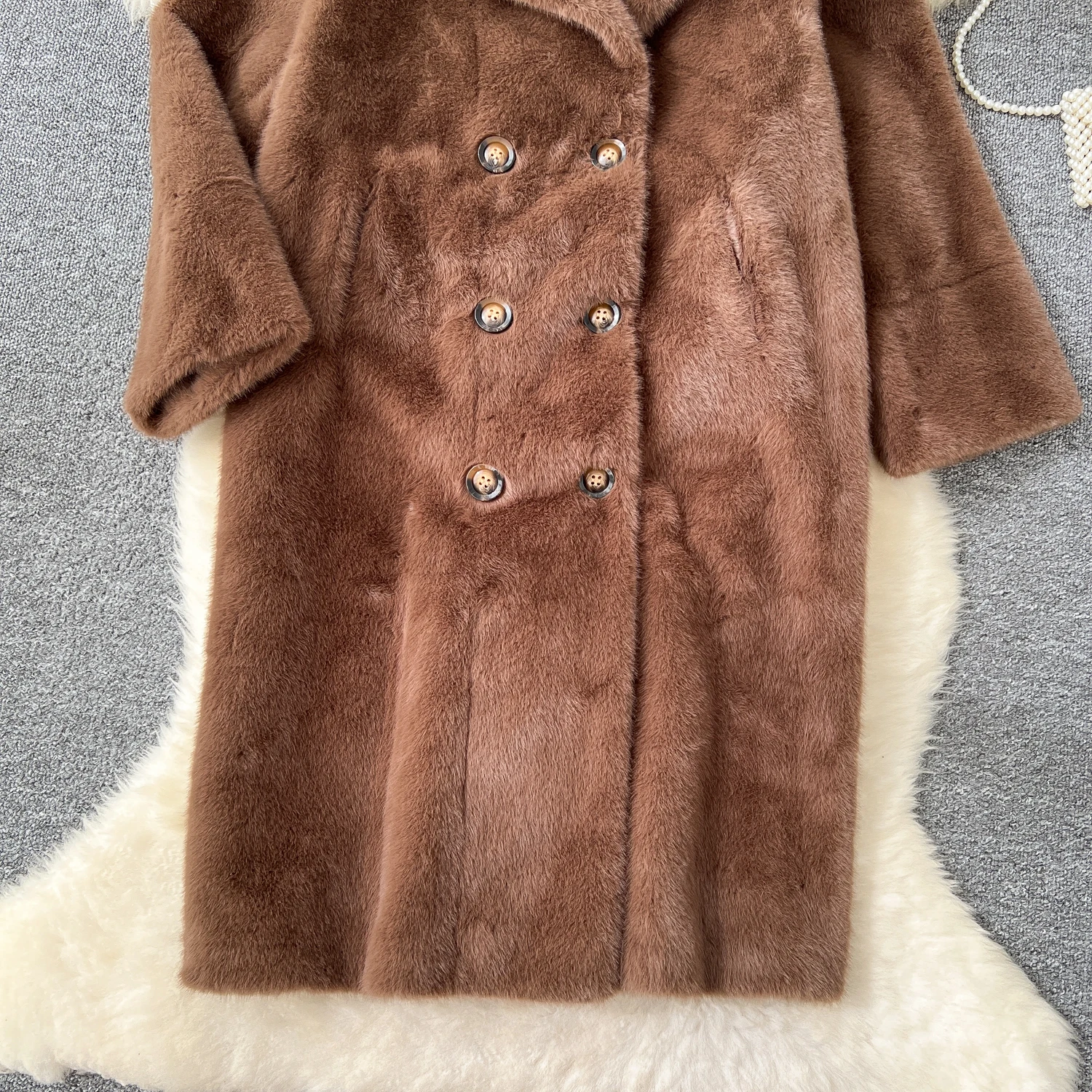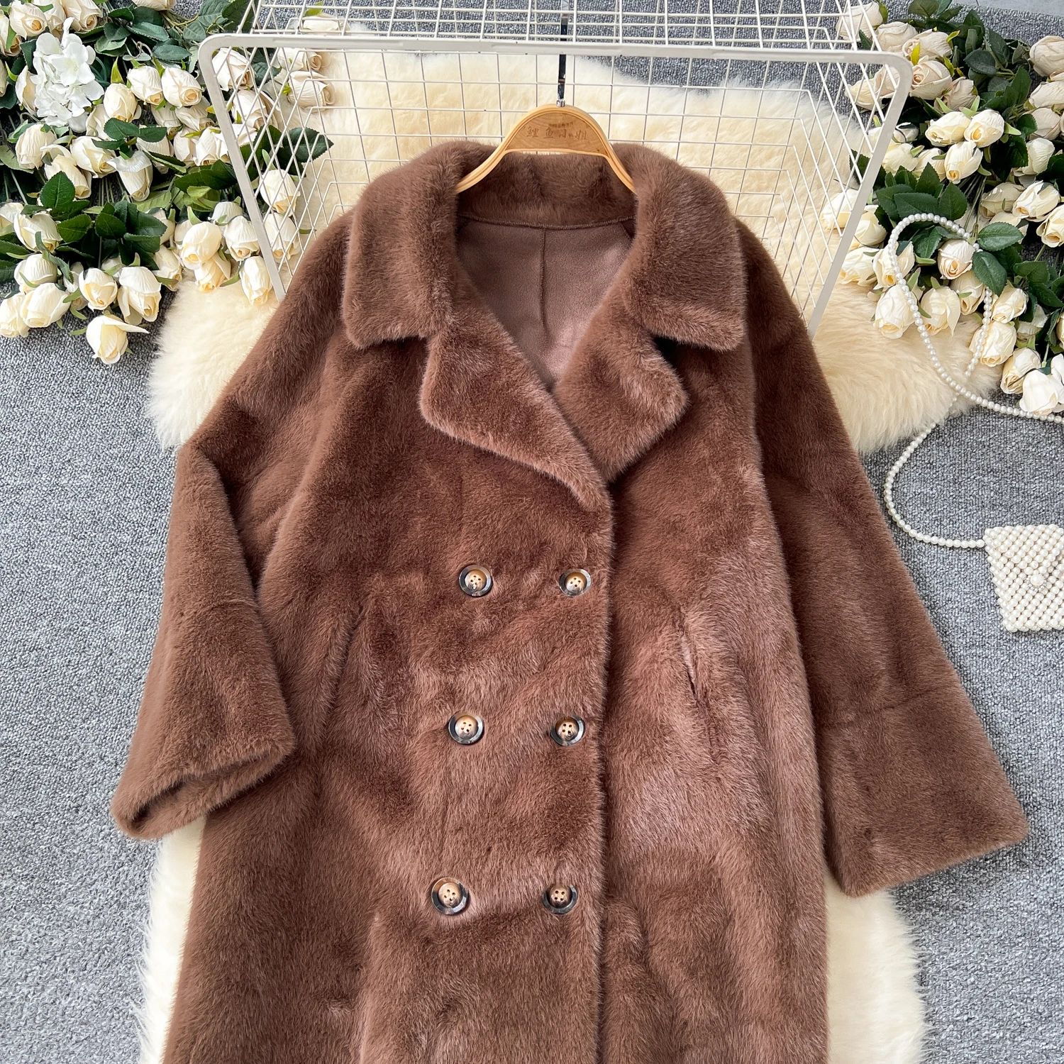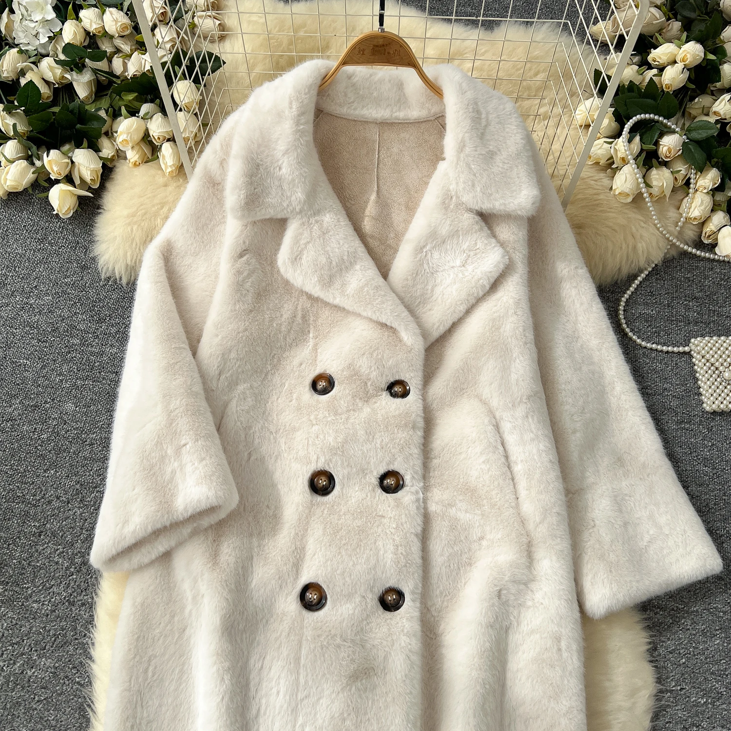 Korean Fashion 2024 Winter Solid Elegant Double-breasted Warm Imitation Mink Fur Coat Women Office Lady Thick Loose Long Jacket