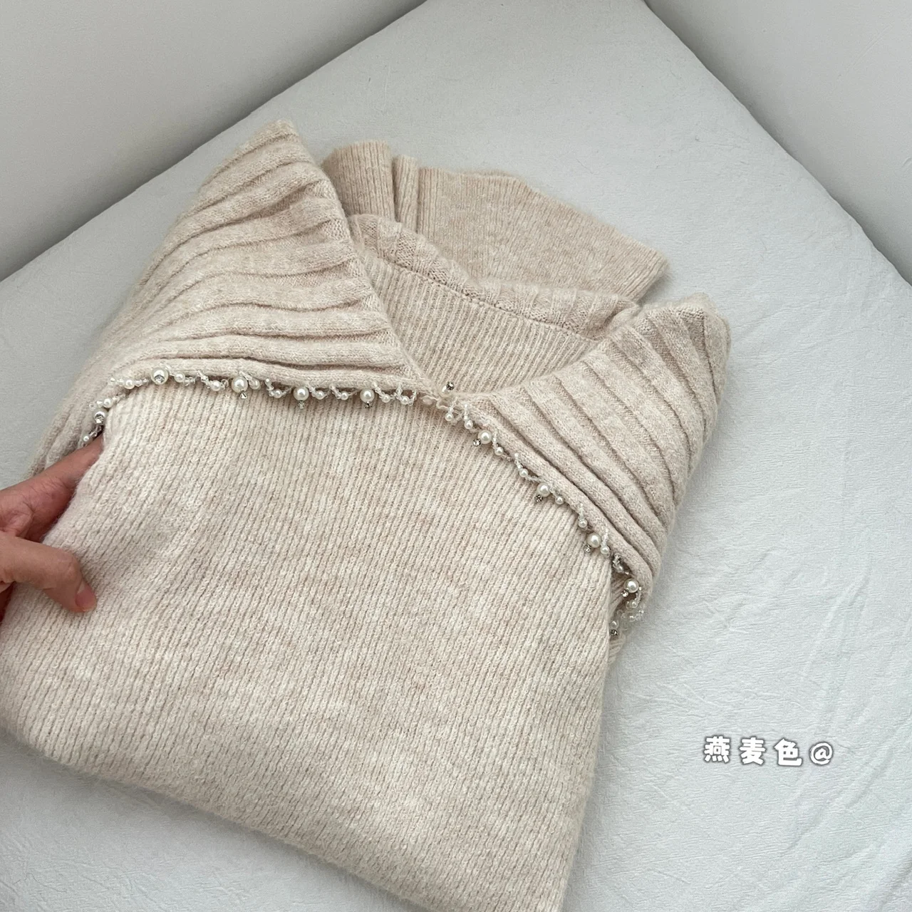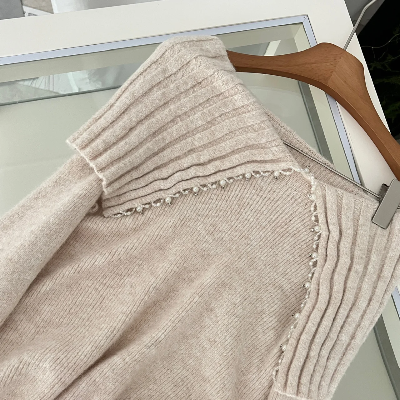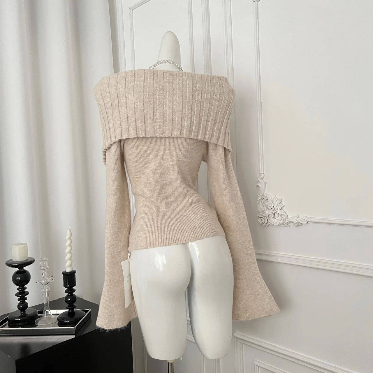 Korean Fashion Khaki Long Sleeve Versatile Sweater Women Autumn Winter Elegant Off Shoulder Pearl Knit Cotton Tops Popular Trend