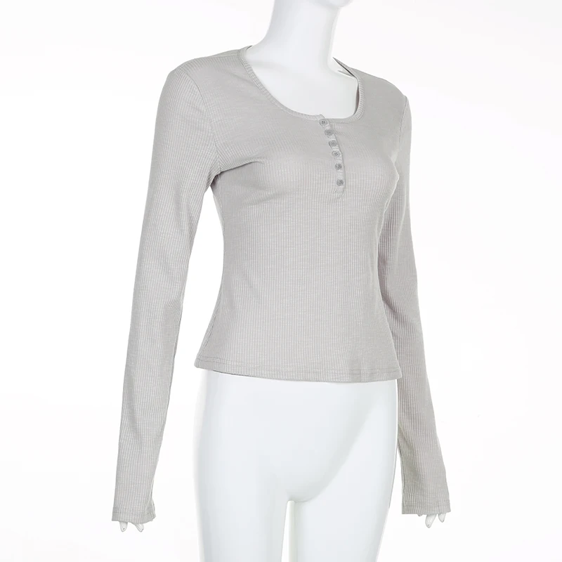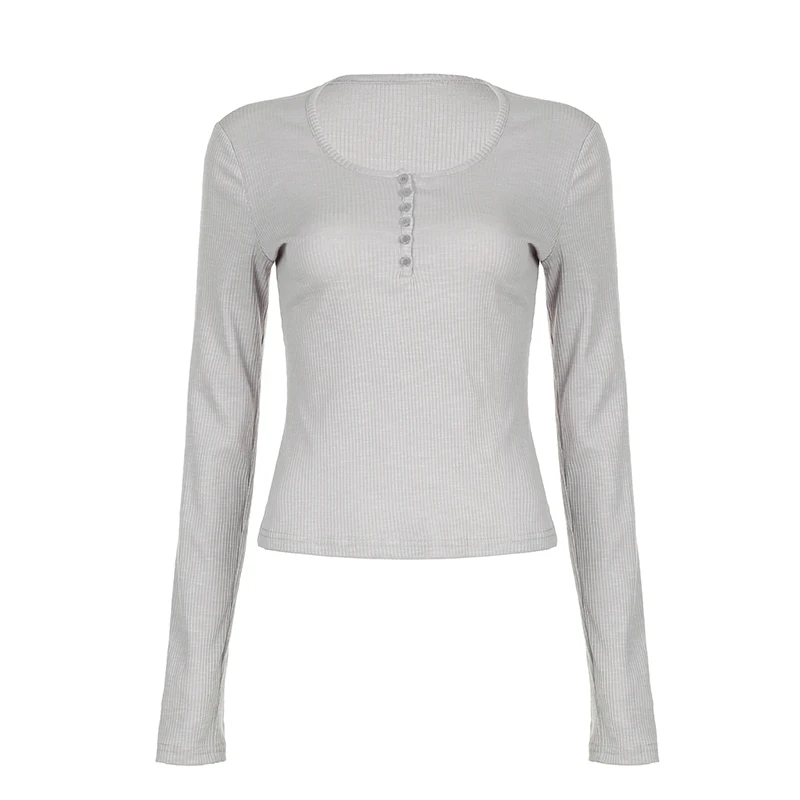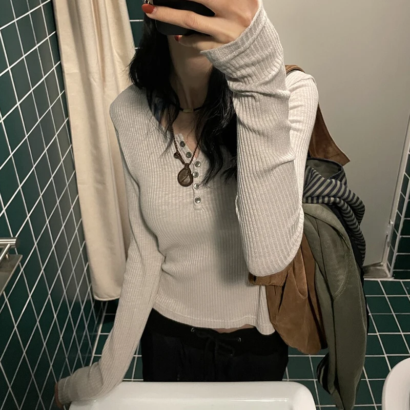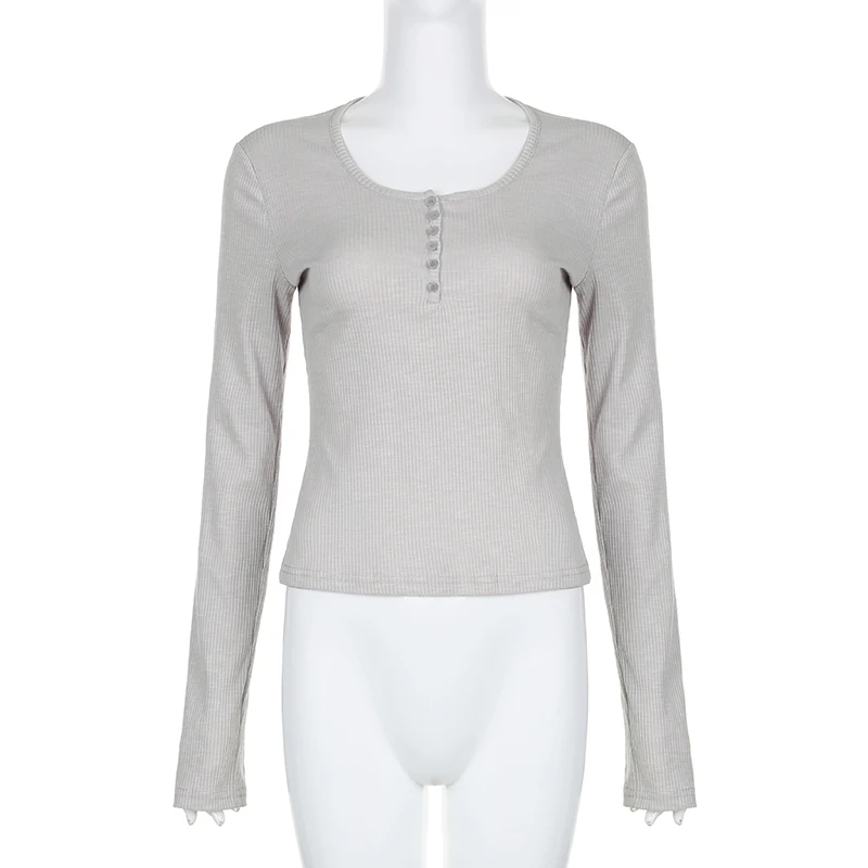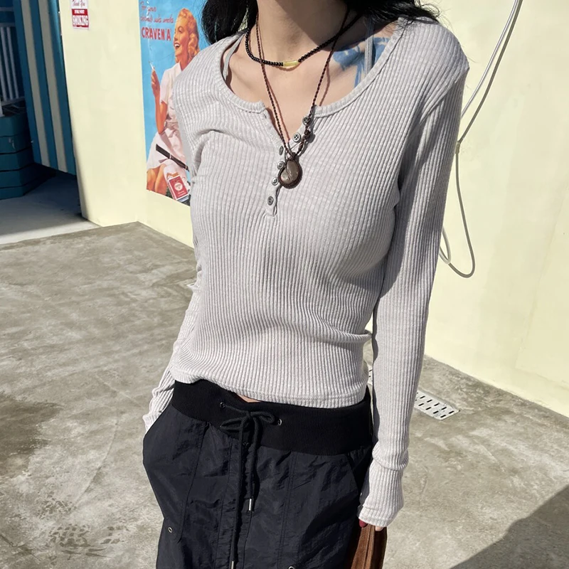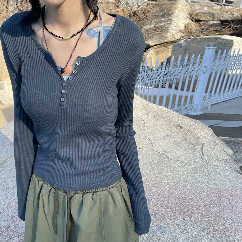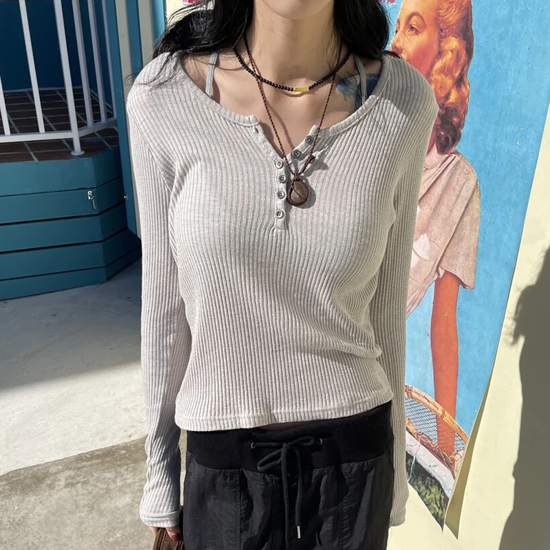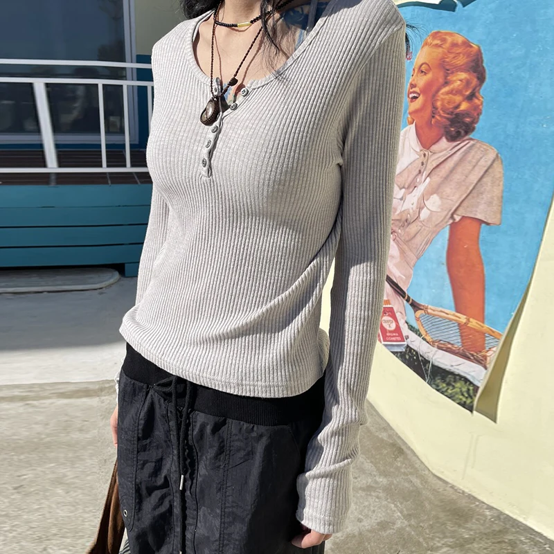 Korean Fashion Solid Buttons Autumn Tee Shirt Basic Casual Ribbed Knit Top Harajuku Women's T-shirt Long Sleeve Cloth