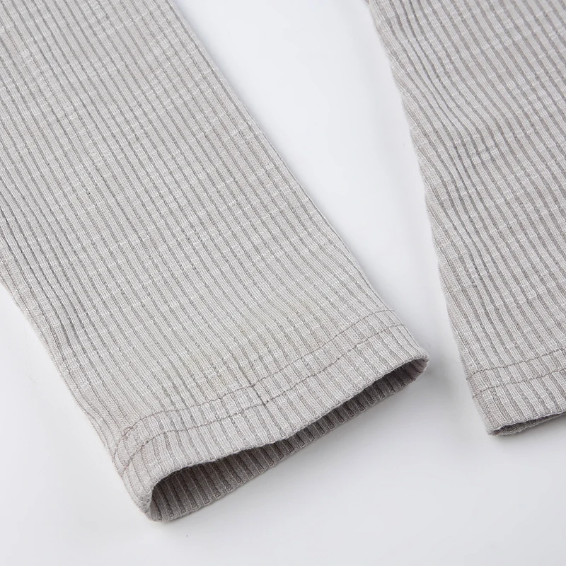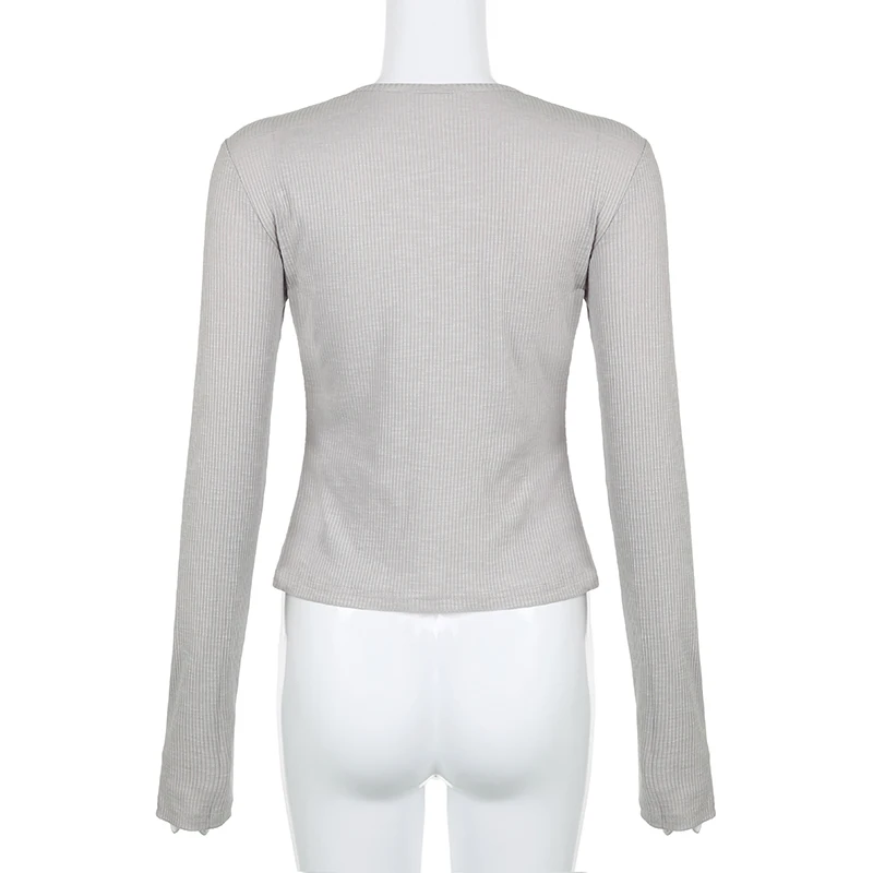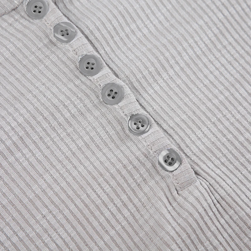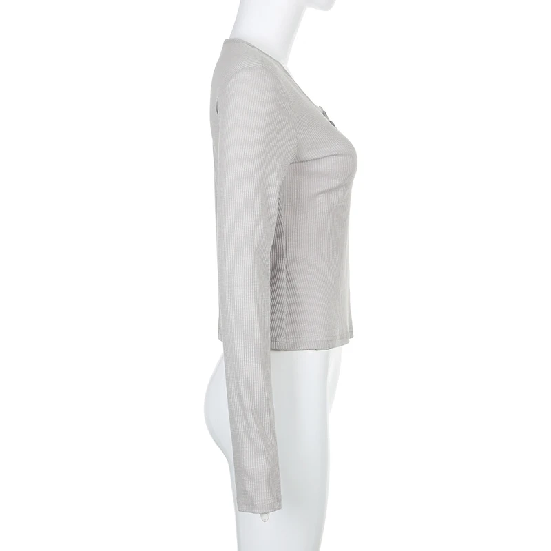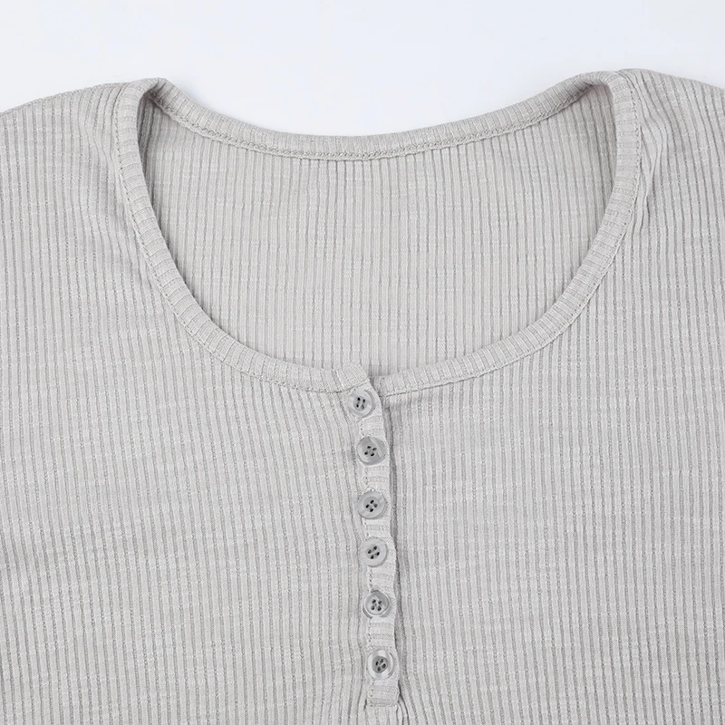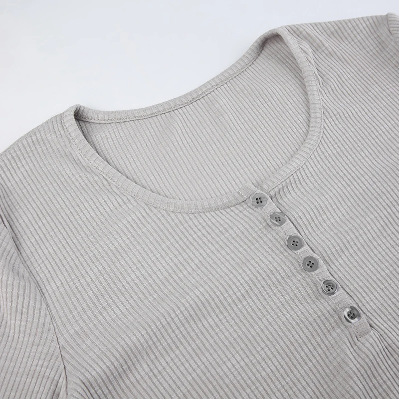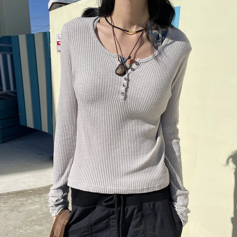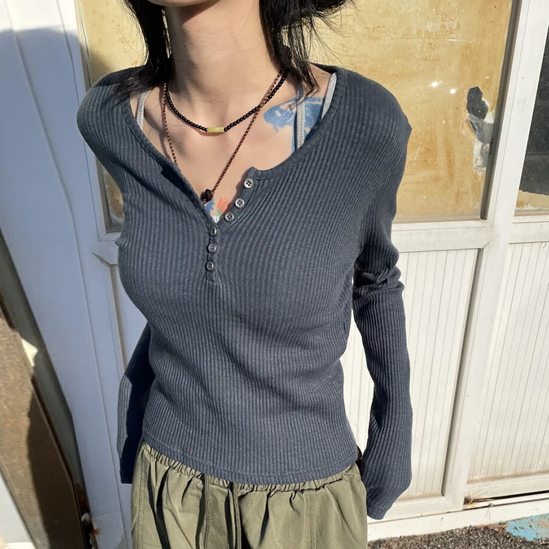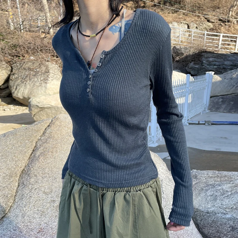 Korean Fashion Solid Buttons Autumn Tee Shirt Basic Casual Ribbed Knit Top Harajuku Women's T-shirt Long Sleeve Cloth