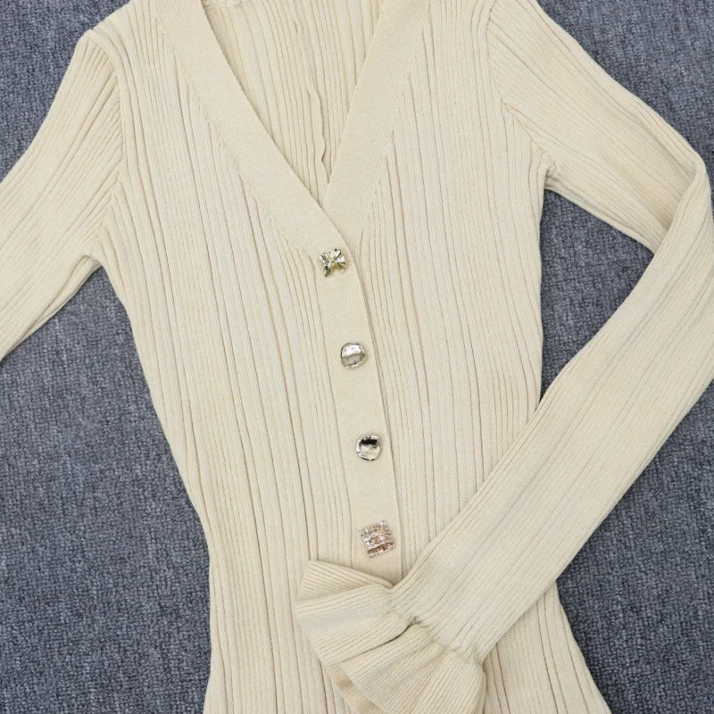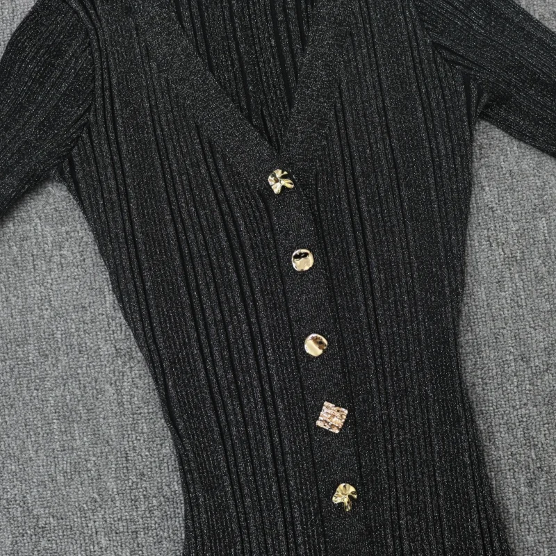 Korean Fashion Women's Black Beige Long Sleeve V Neck Knitted Dress 2024 Autumn Winter New Red Single Breasted Fishtail Dresses