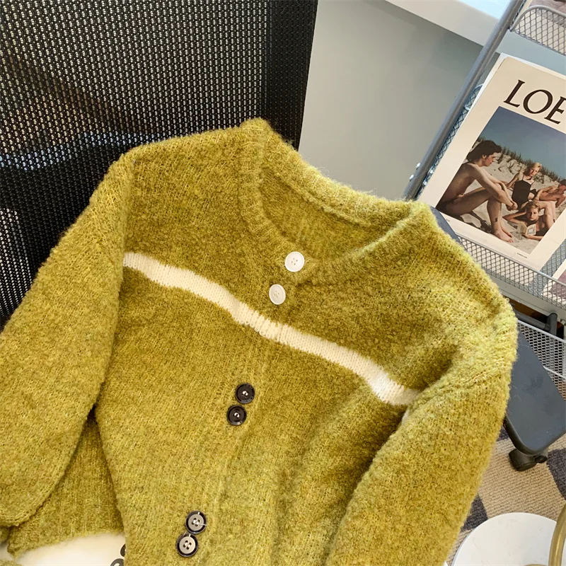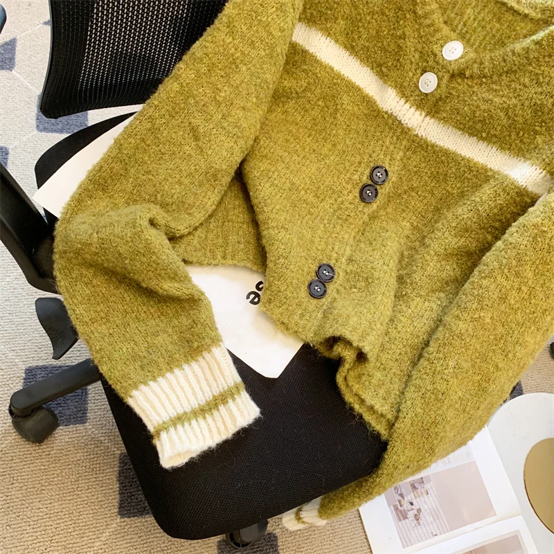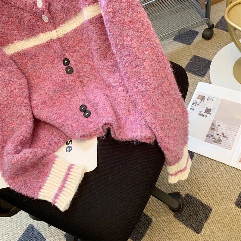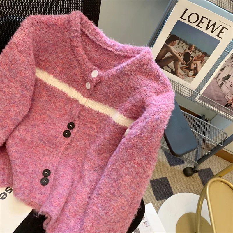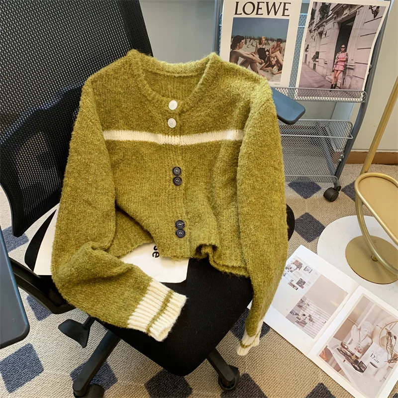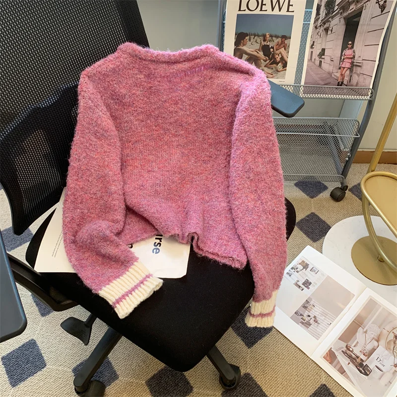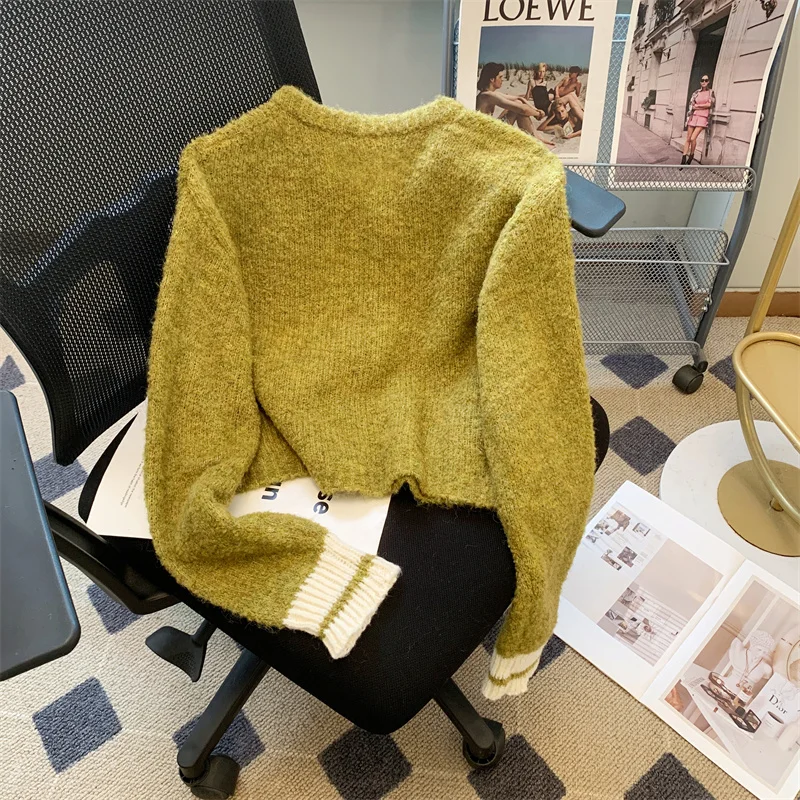 Korean Purple Patchwork Long Sleeved Short Sweater Women's New Green Casual Thick Loose Knit Pullover Top Autumn Winter 2024 Y2k