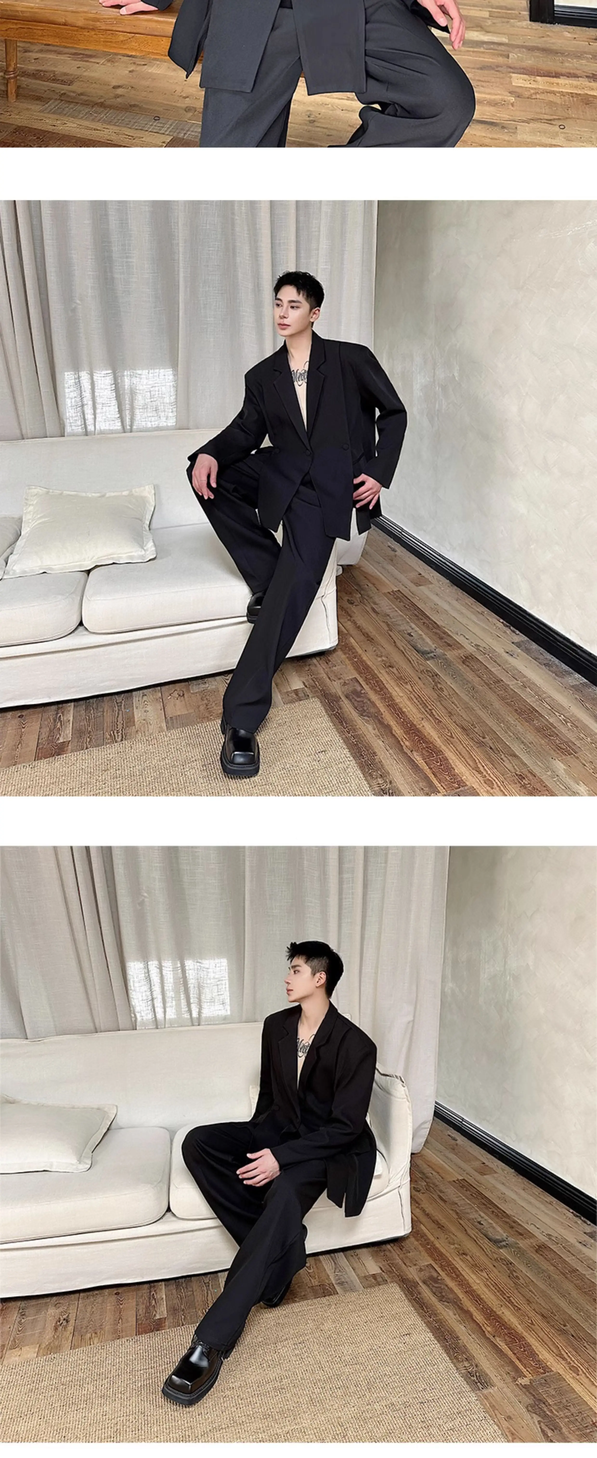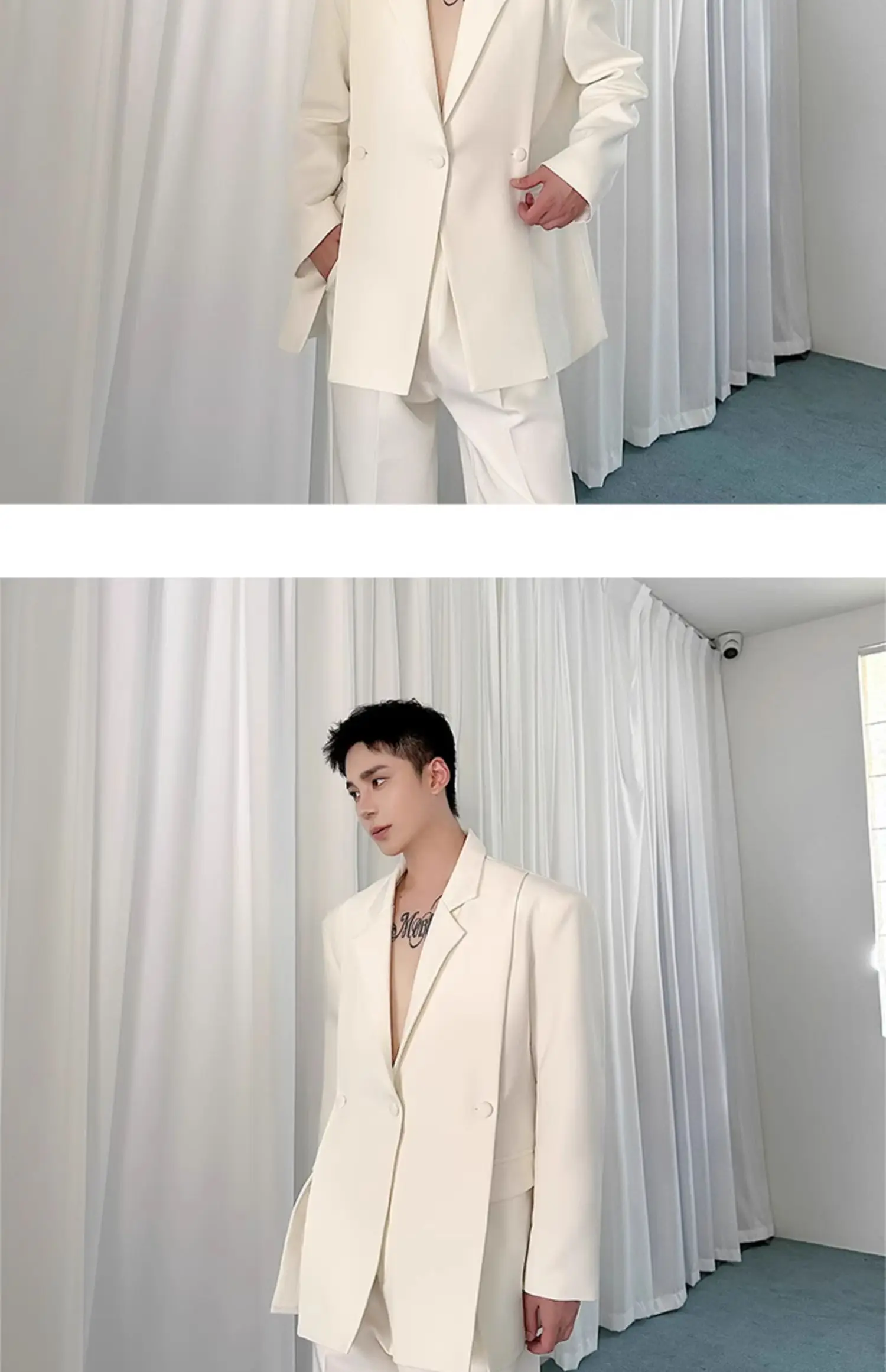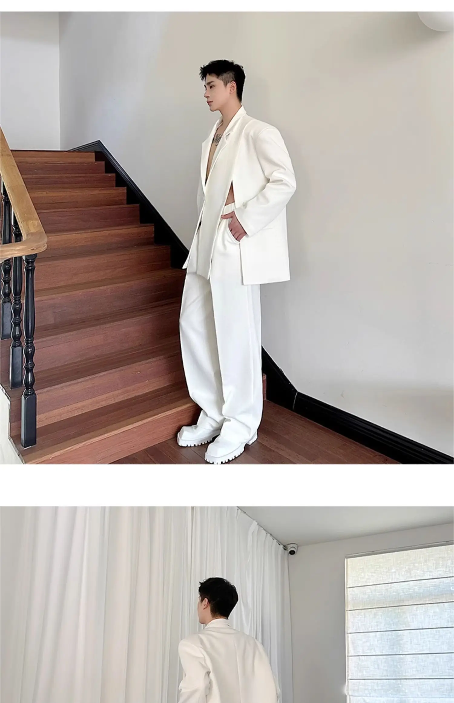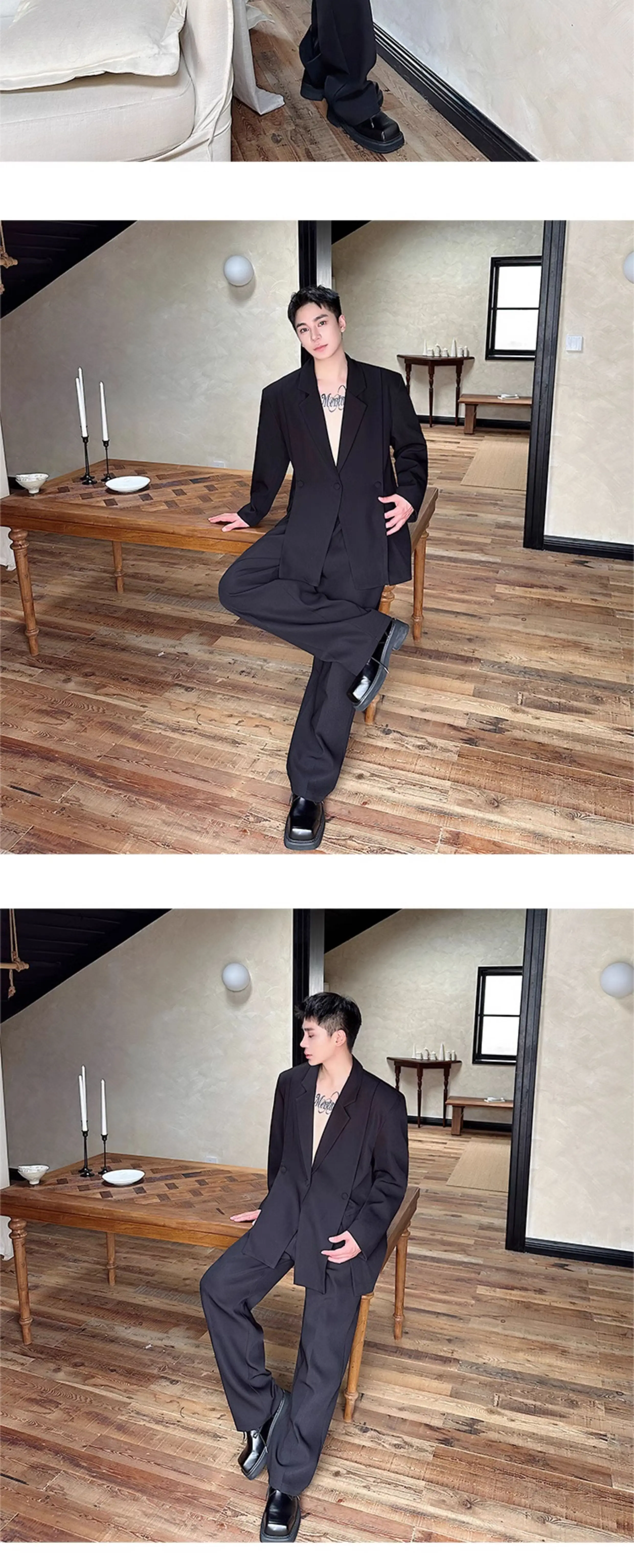 Korean Style Casual Male Two-Piece Set Slit Triple Breasted Solid Color Blazer Straight Leg Men's Pants Personalized 9C7239