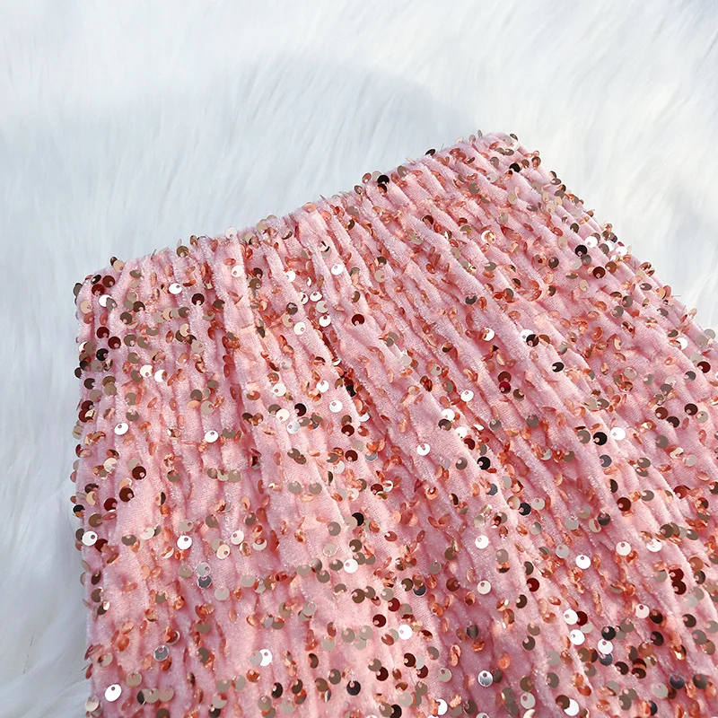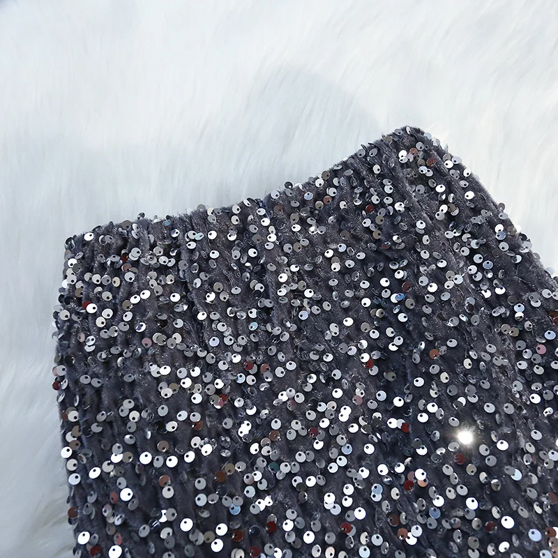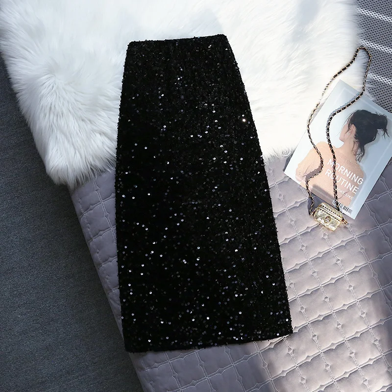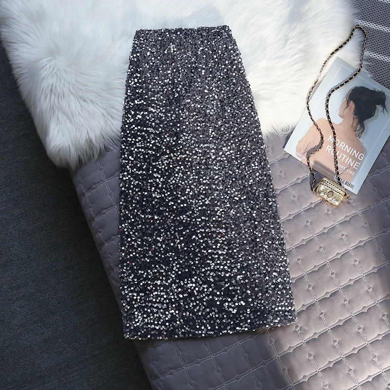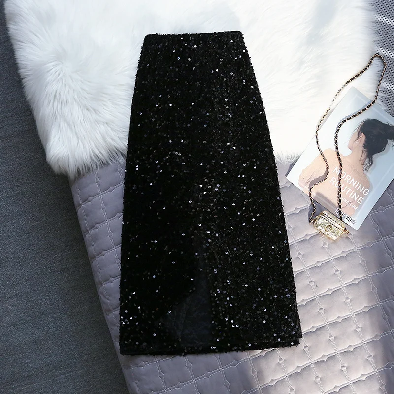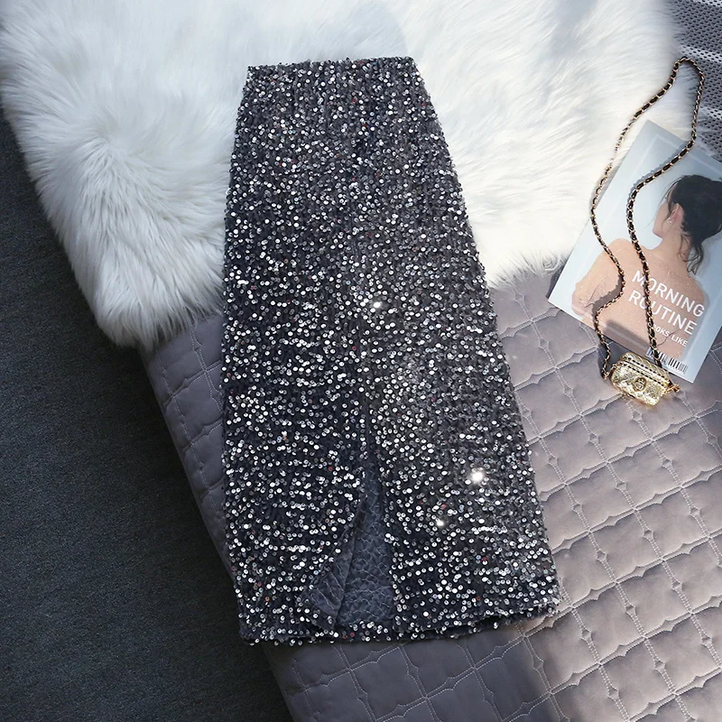 Korean Style Fashion Sequin Design Long Skirts For Women All Season Ladies Casual Streetwear All Match Sexy Split Midi Skirt