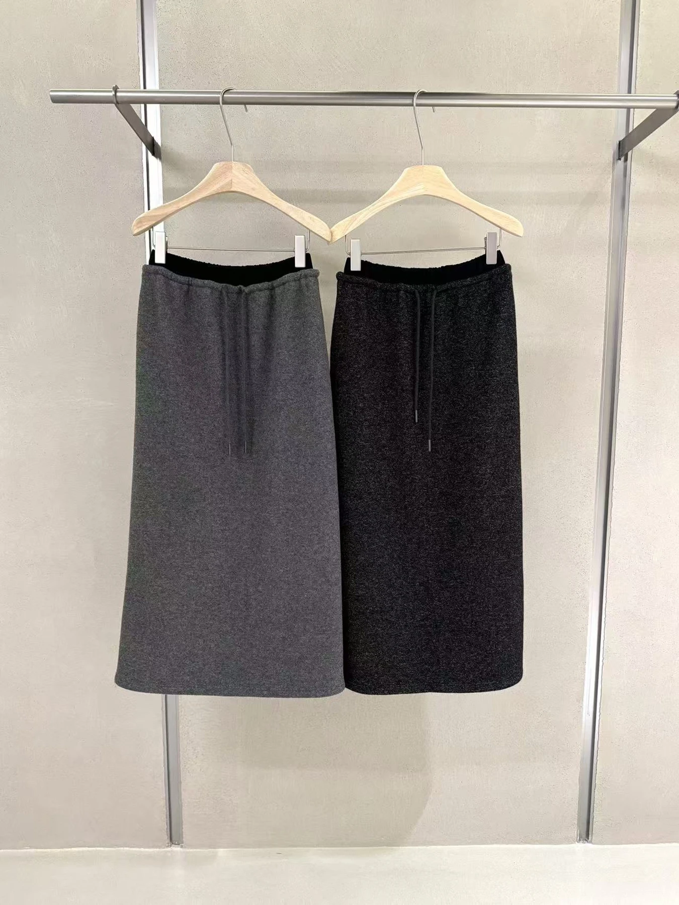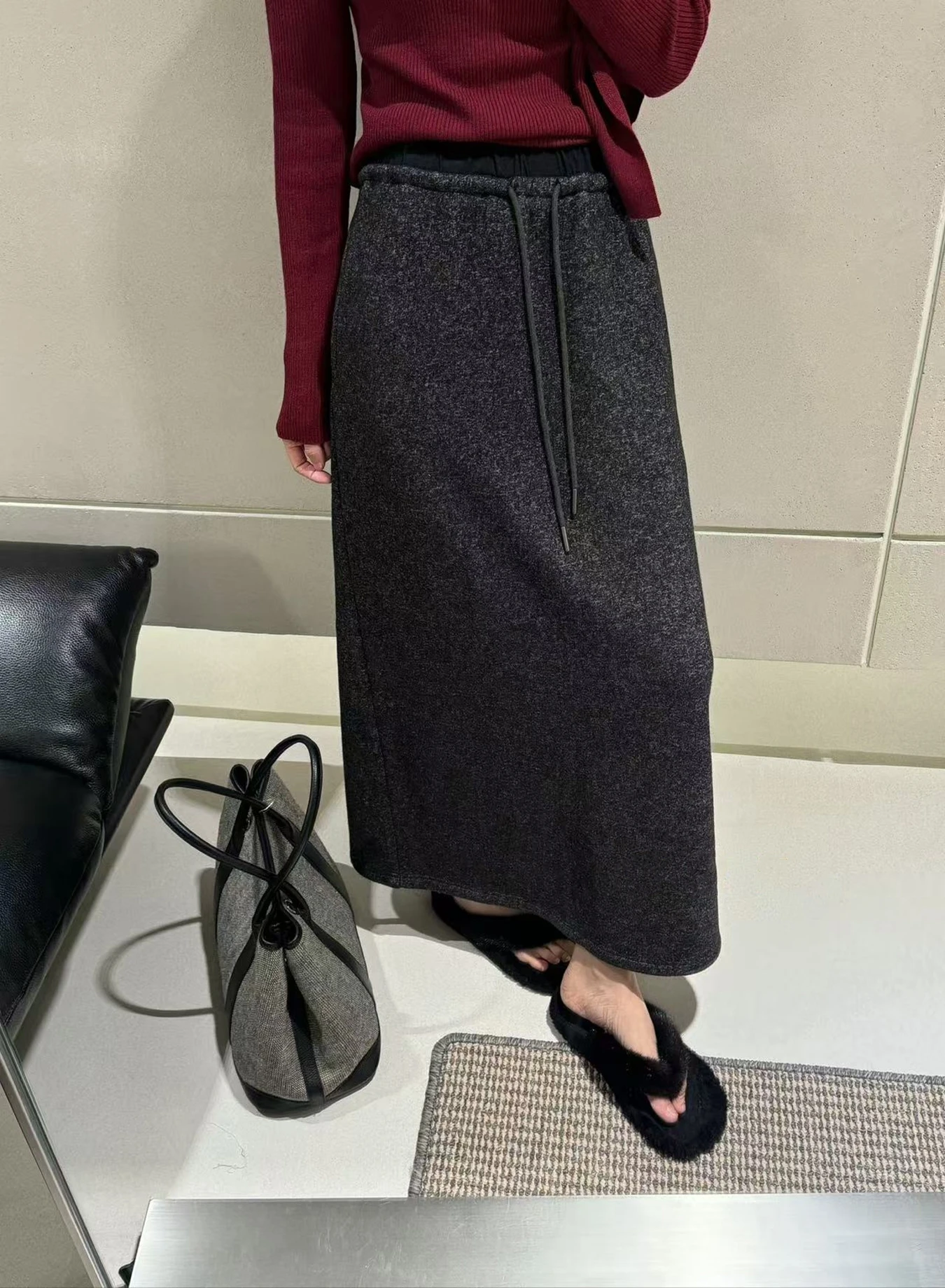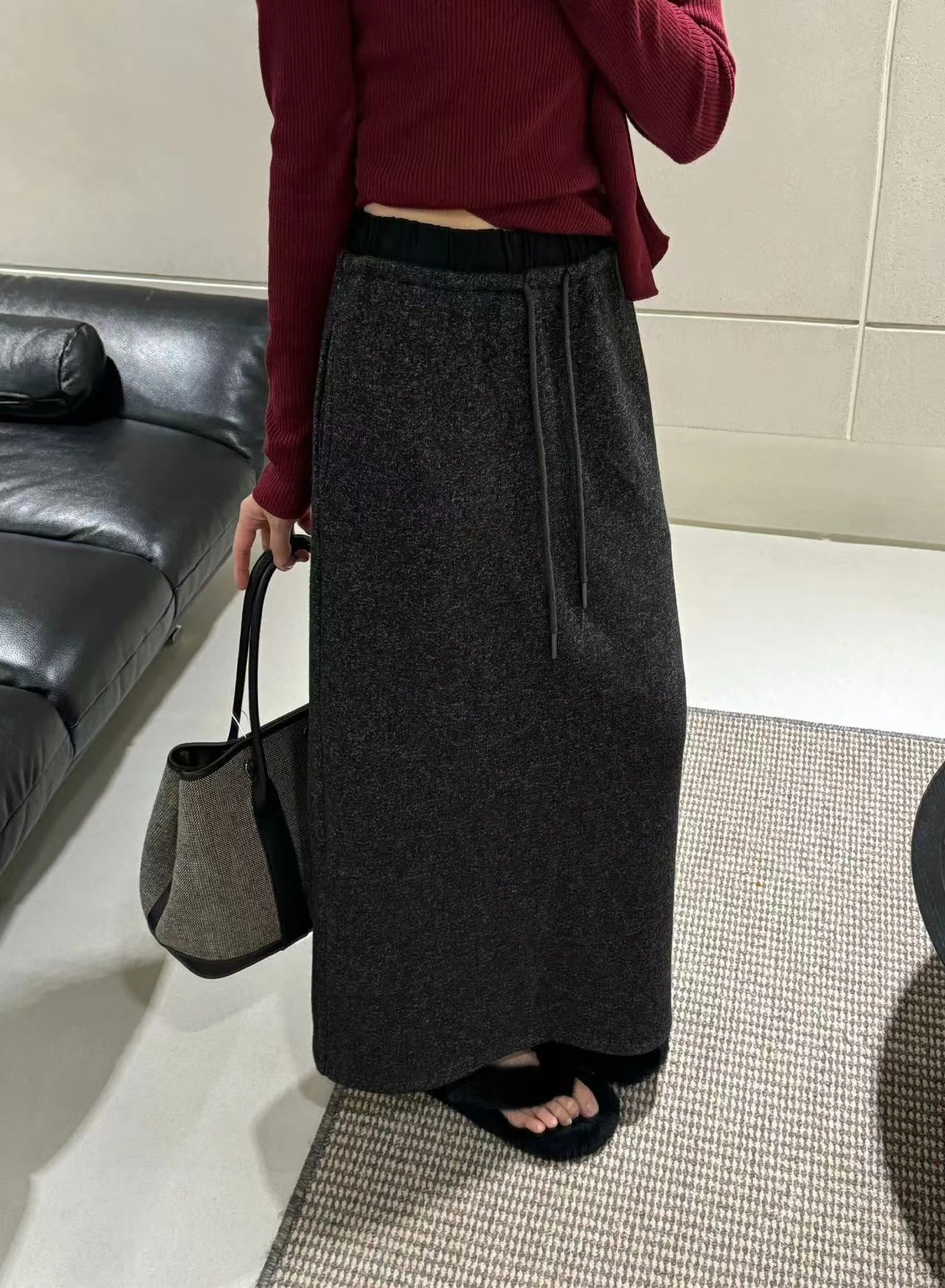 Korean Style Woman Black Elegant High Waisted Straight Woolen Skirts Autumn Winter Casual Simple Grey Drawstring Lace-up Skirt