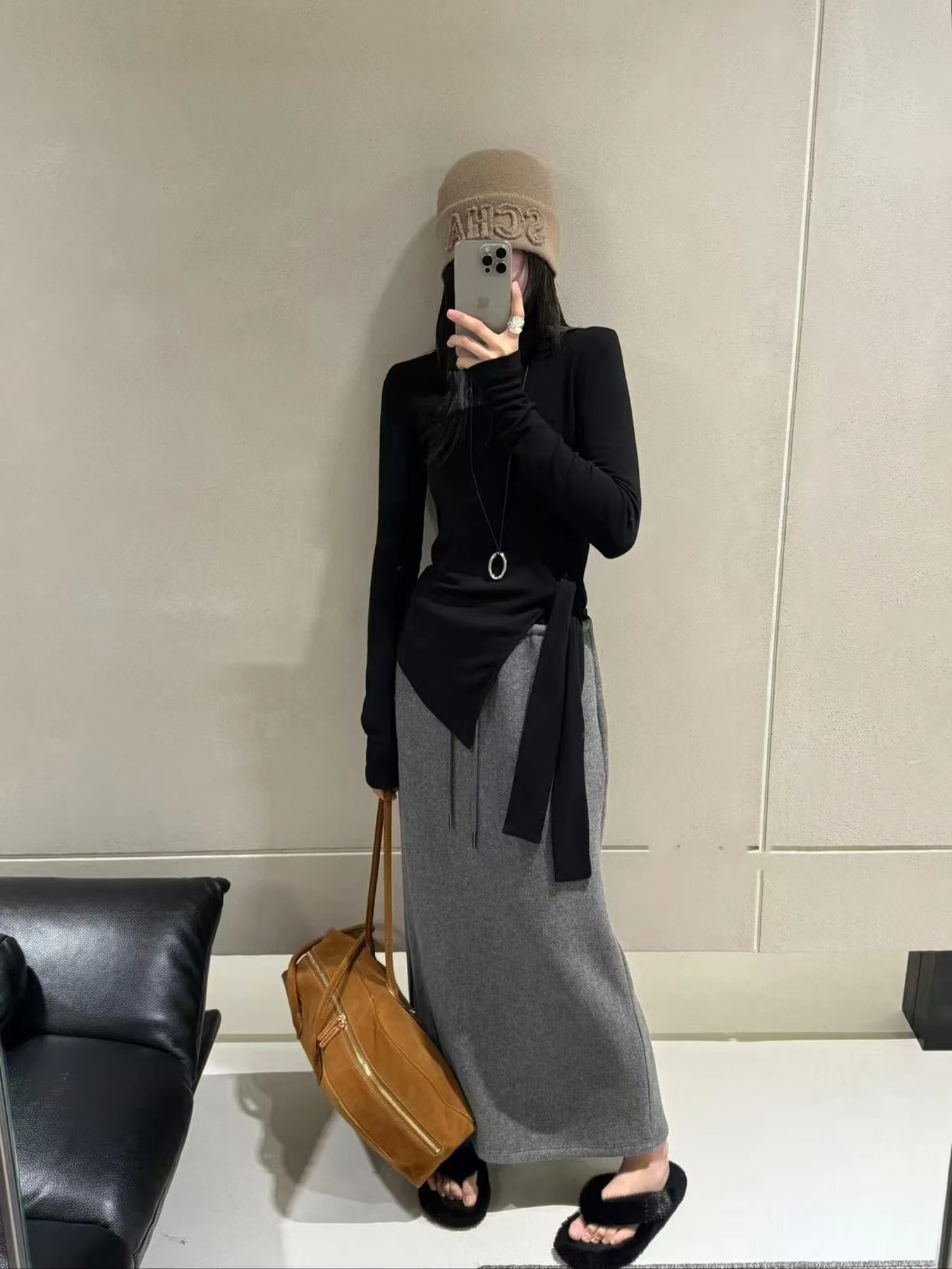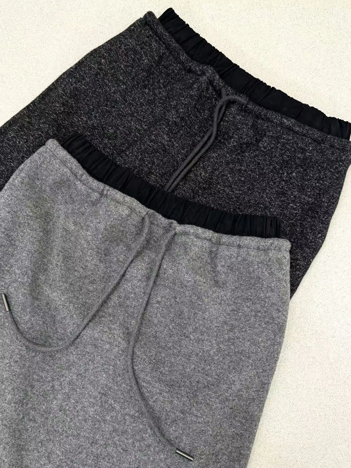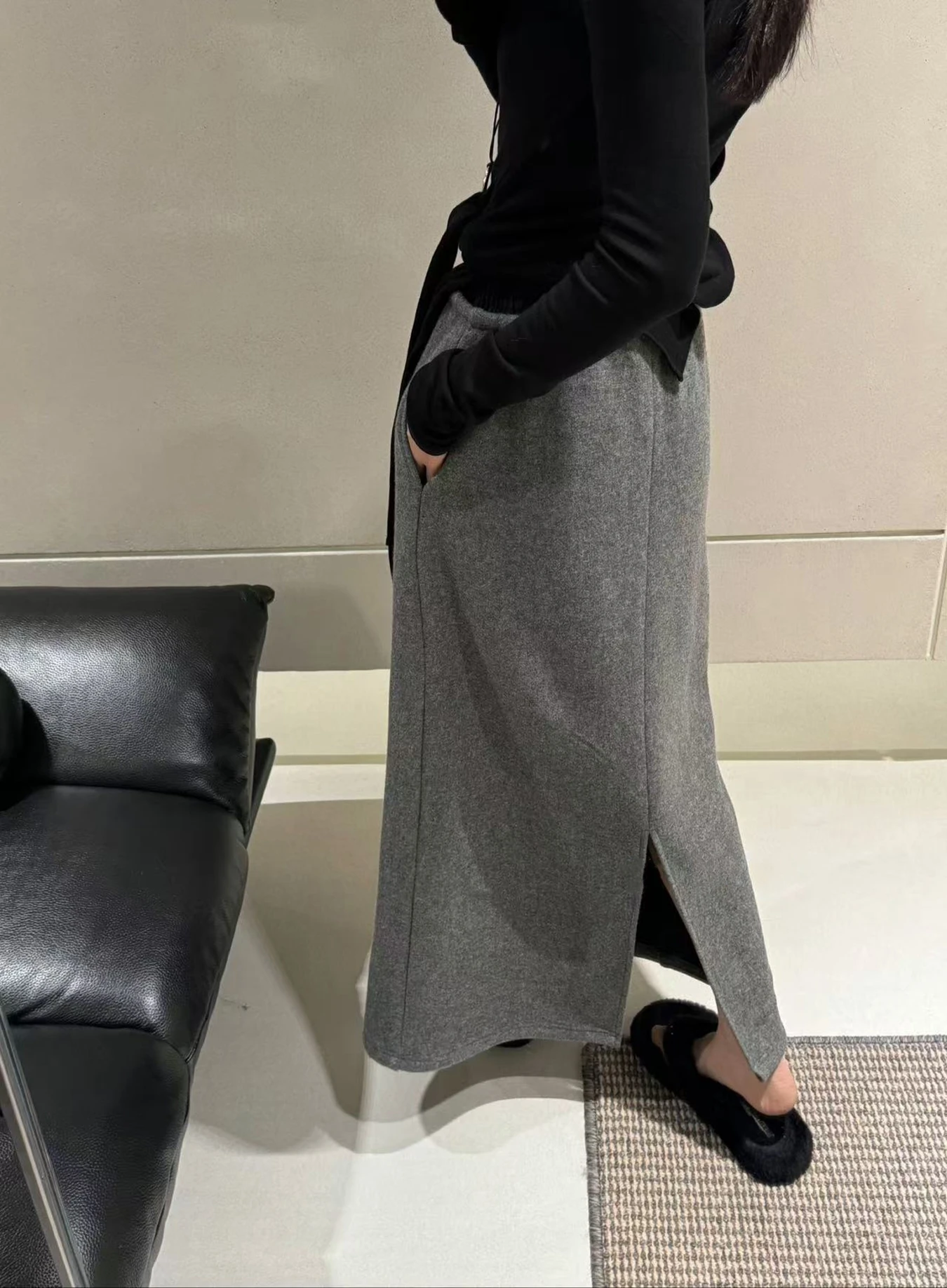 Korean Style Woman Black Elegant High Waisted Straight Woolen Skirts Autumn Winter Casual Simple Grey Drawstring Lace-up Skirt