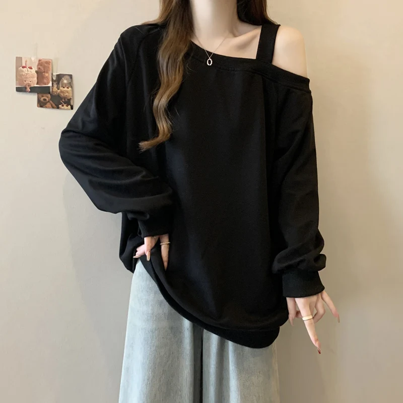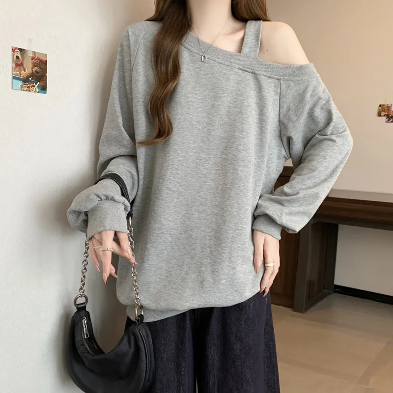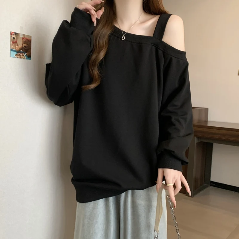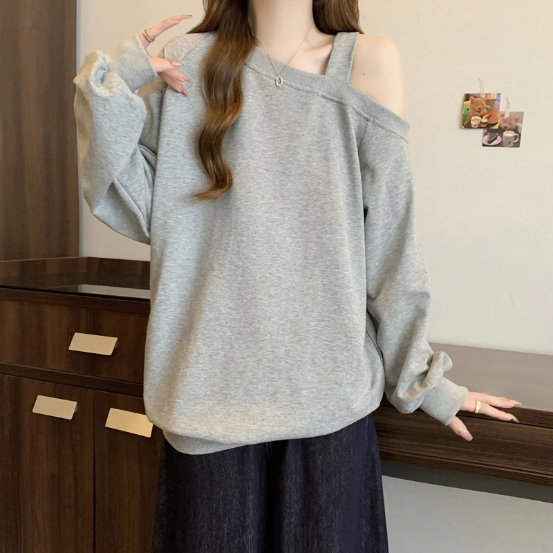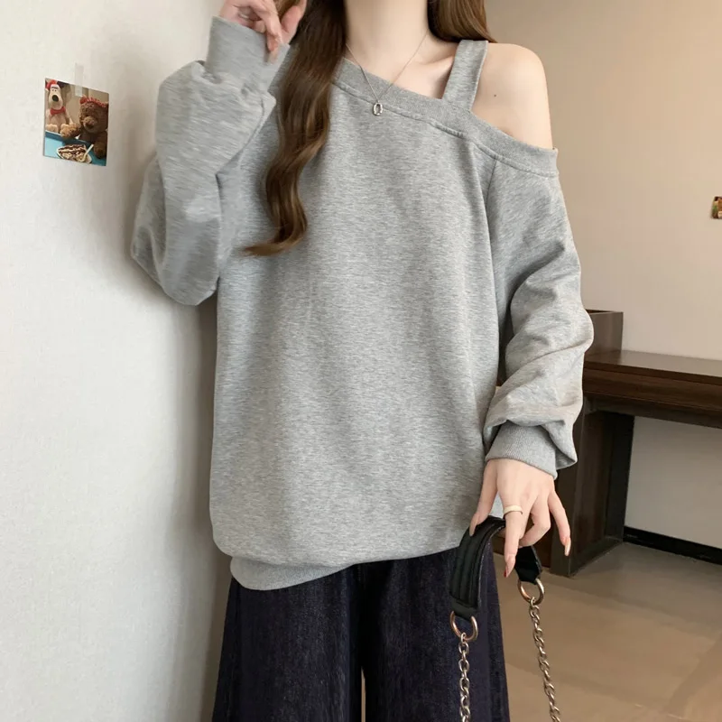 Korean Version Casual Women's Autumn Winter New Grey Versatile Long Sleeved Cotton Tops Black Off Shoulder Velvet Sweatershirt