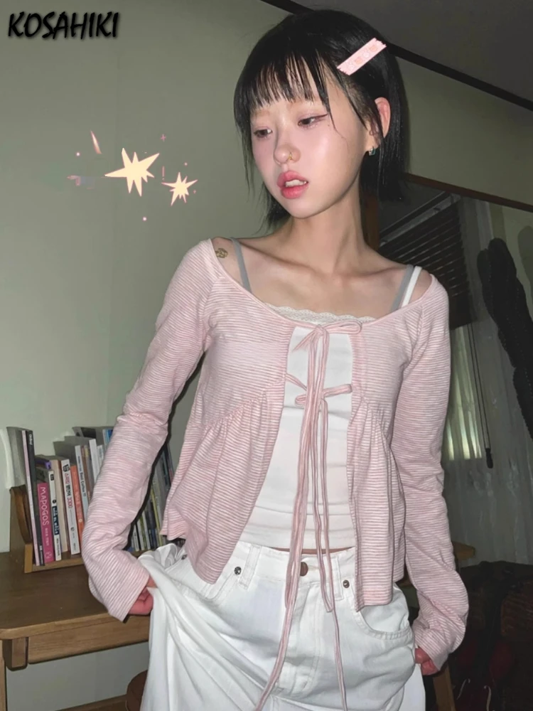 Korean Women Bandage Bow Cardigans Vintage Fairy Y2k Aesthetic Striped Coat Streetwear Fashion Casual Chic Fairy Cardigan Femme