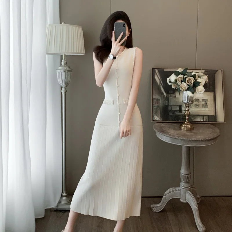 Korean Women's Black Knit Round Neck Sleeveless Office Lady Dress Summer Retro Fashion Beige Pearl Temperament Long Dress Trendy