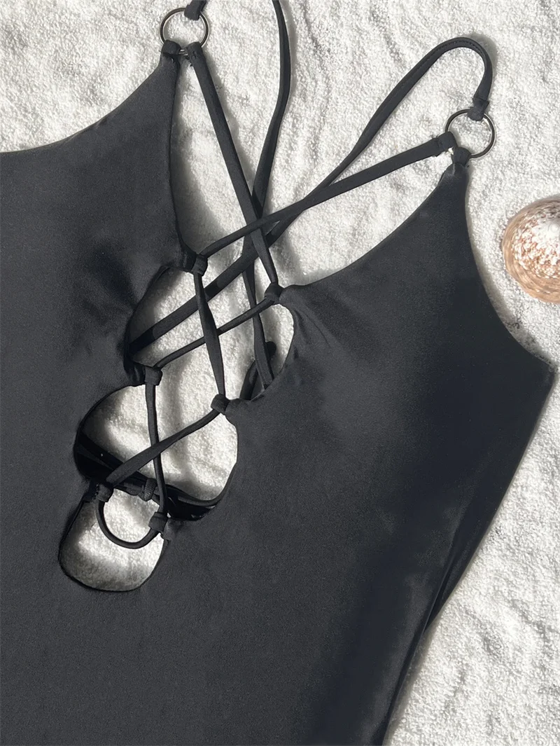 Lace Up One Piece Swimsuit Women 2025 Black Drawstring Monokini Sexy Hollow Out Swimwear Halter Bathing Suit