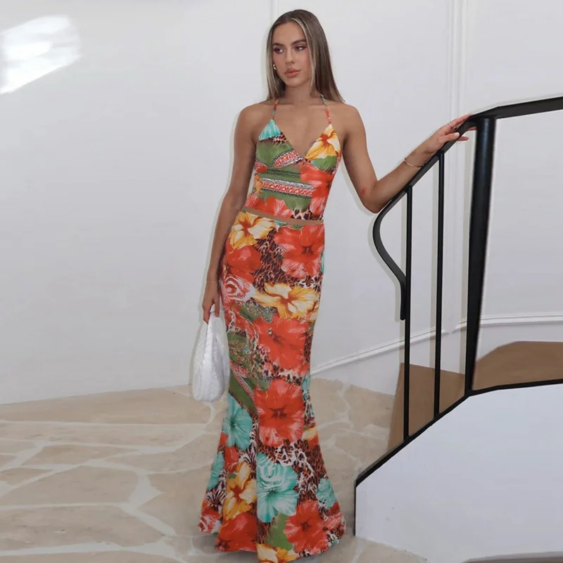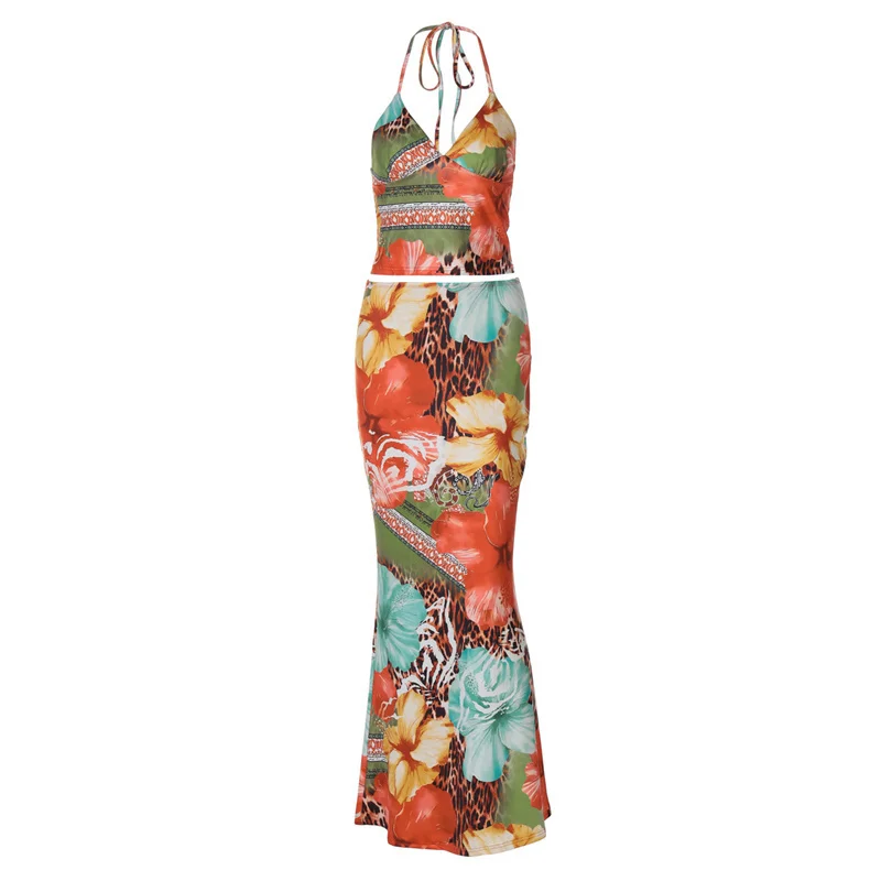 Leopard Print Sexy 2 Piece Sets Women Summer Fashion Lace-up Halter Crop Tops And Maxi Skirt Female Party Two Piece Set
