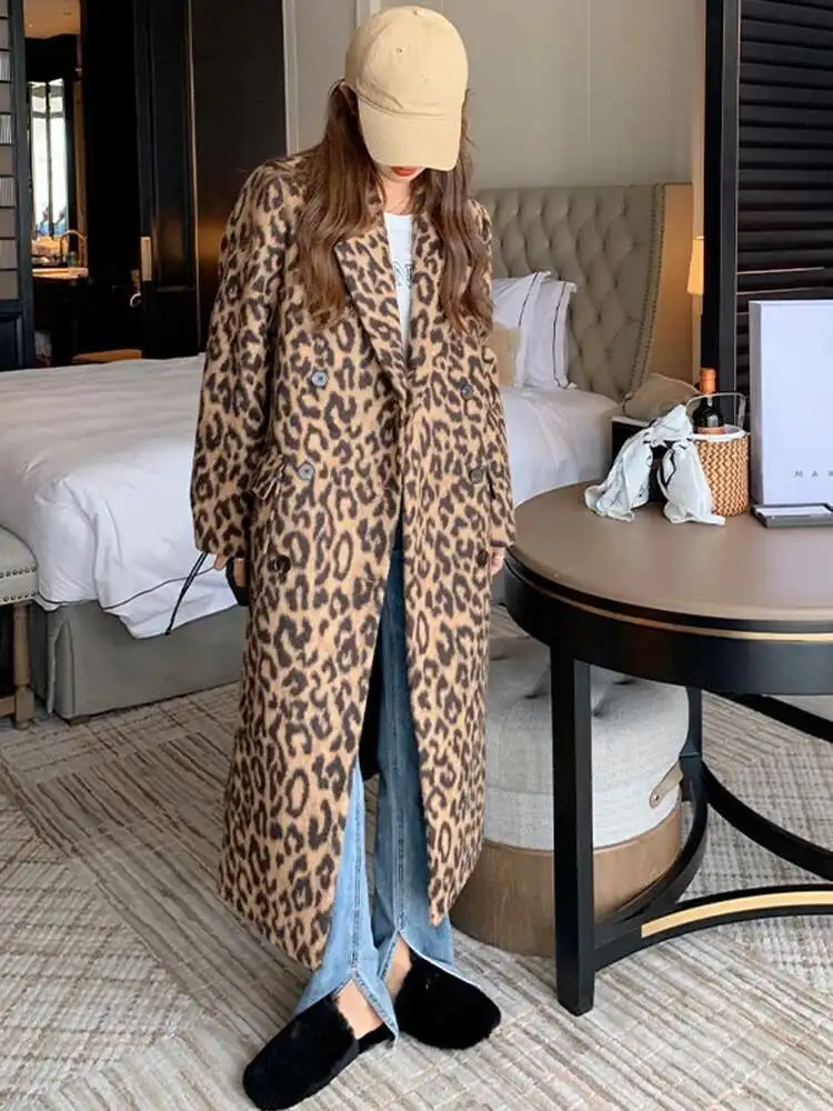 Leopard Print Thick Big Size Long Woolen Coat New Lapel Long Sleeve Women Jacket Fashion Tide Autumn Winter 2025 1DH8599