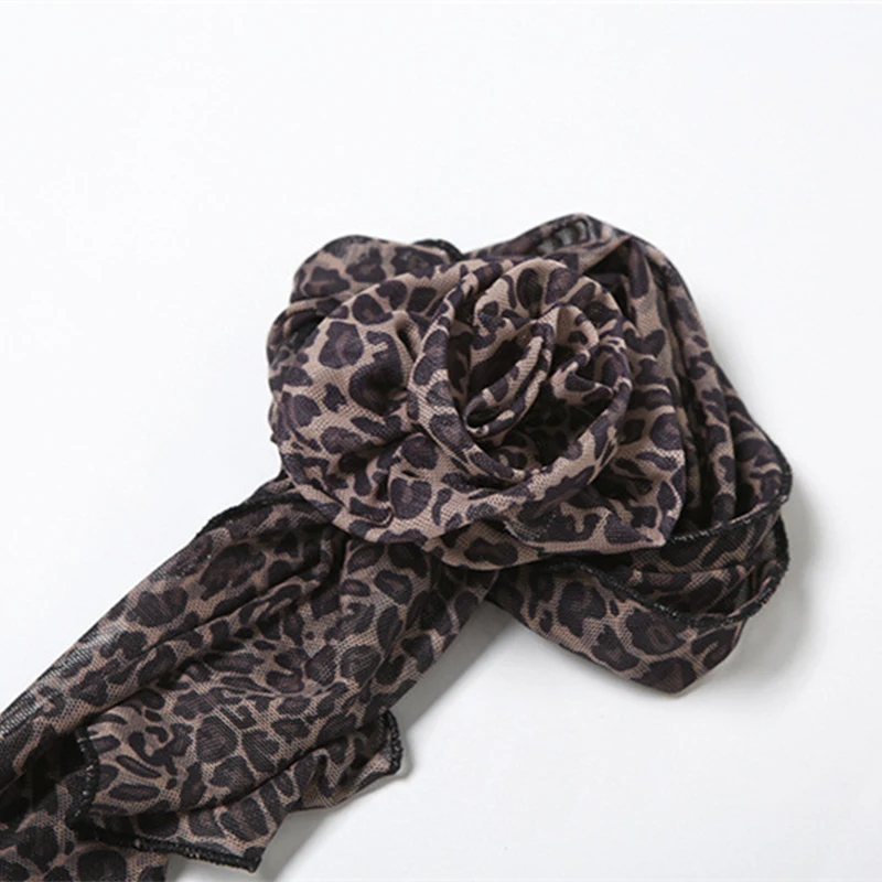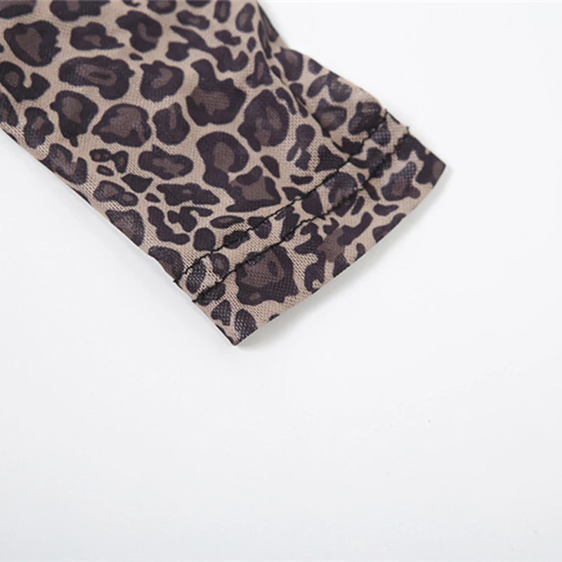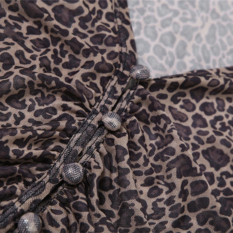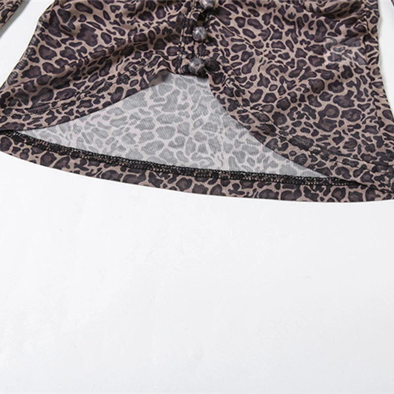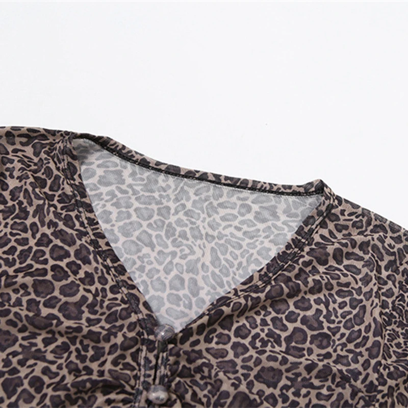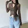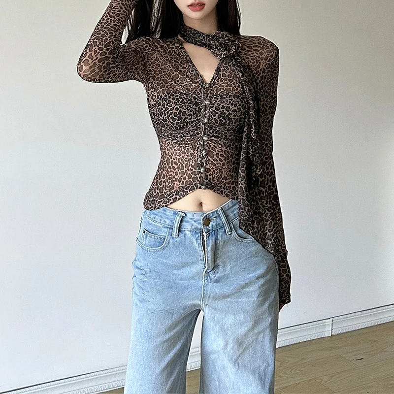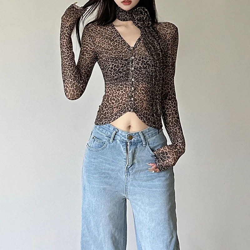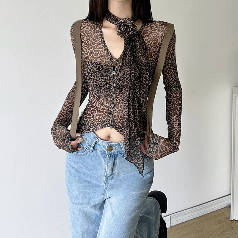 Leopard Tops Women Grunge Clothes See Through V Neck Long Sleeve Button T Shirts with Scarf y2k Clothing Streetwear