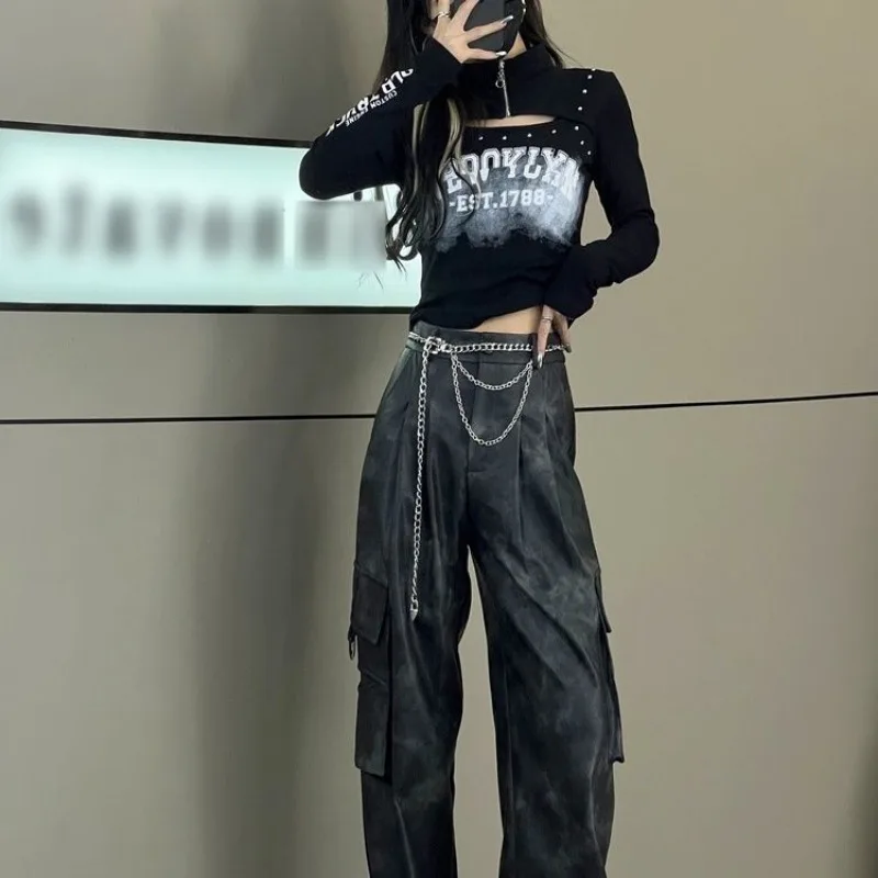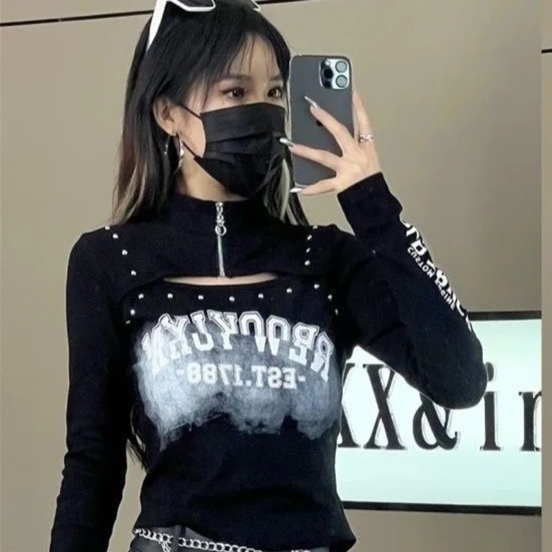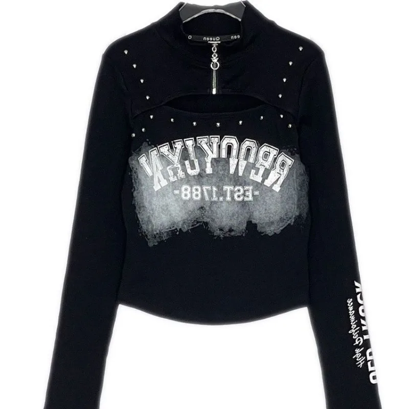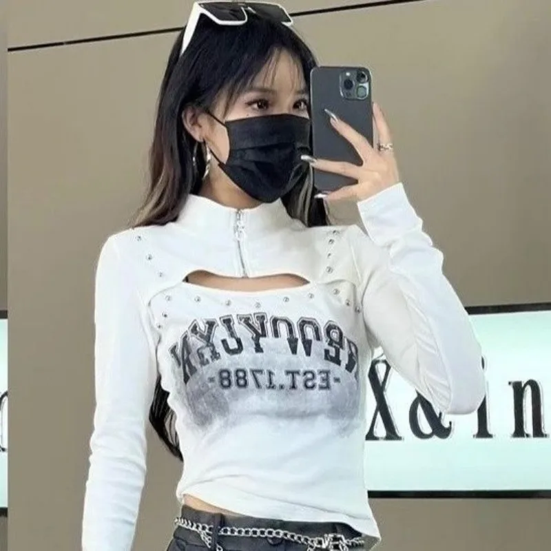 Letter Shirts for Women Half Zipper Hollow Out Sexy Tshirts 2023 Ropa Mujer Rivet Casual Crop Tops Chic Harajuku Y2k T Shirt