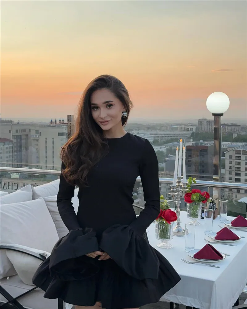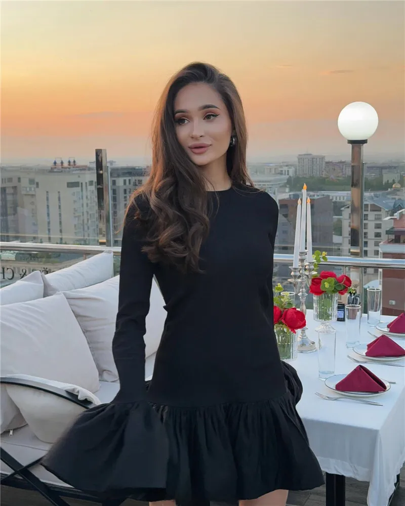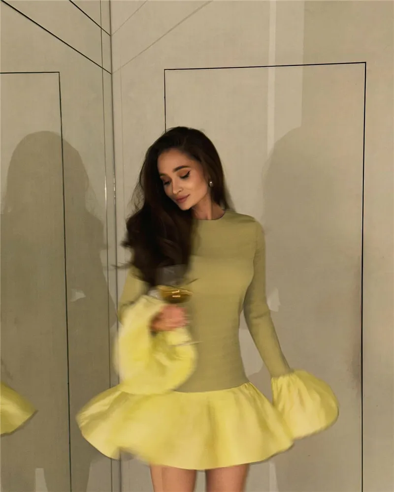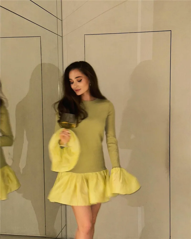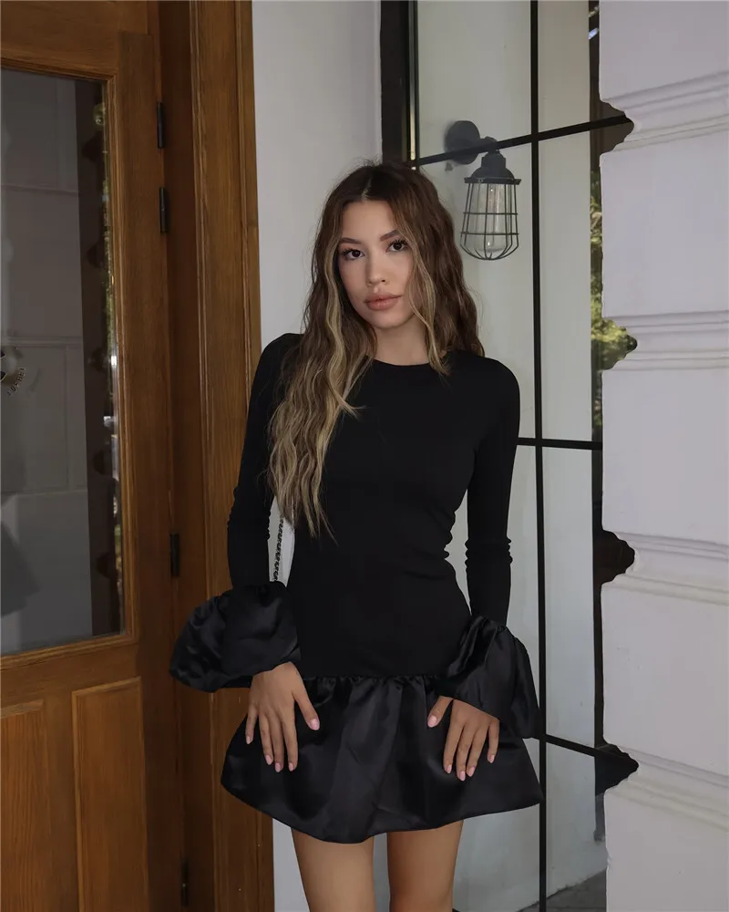 Long Flare Sleeve Knitted Sexy Mini Dress For Women Autumn Winter New Patchwork O Neck A-line Knit Puffy Dress Elegant