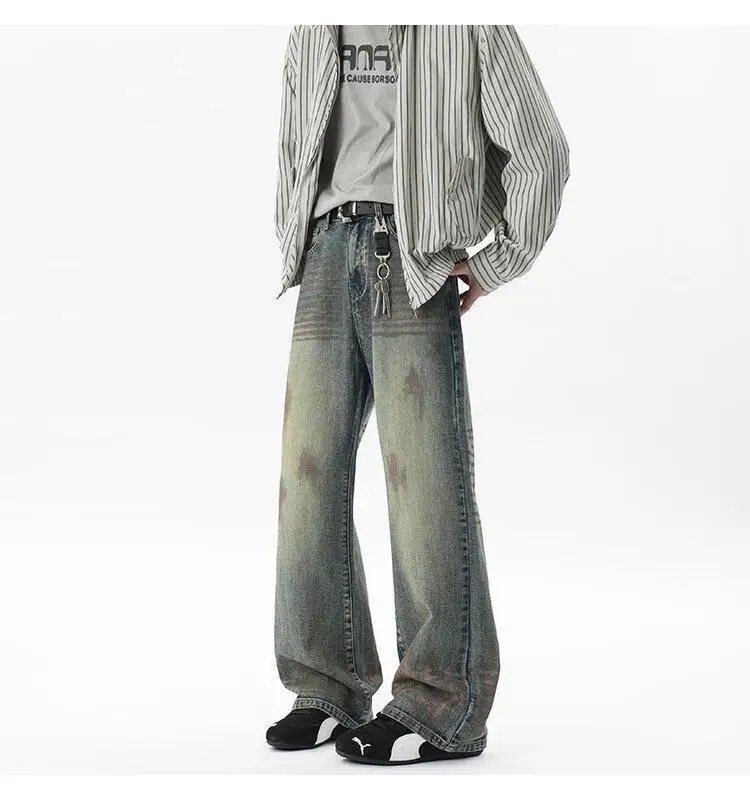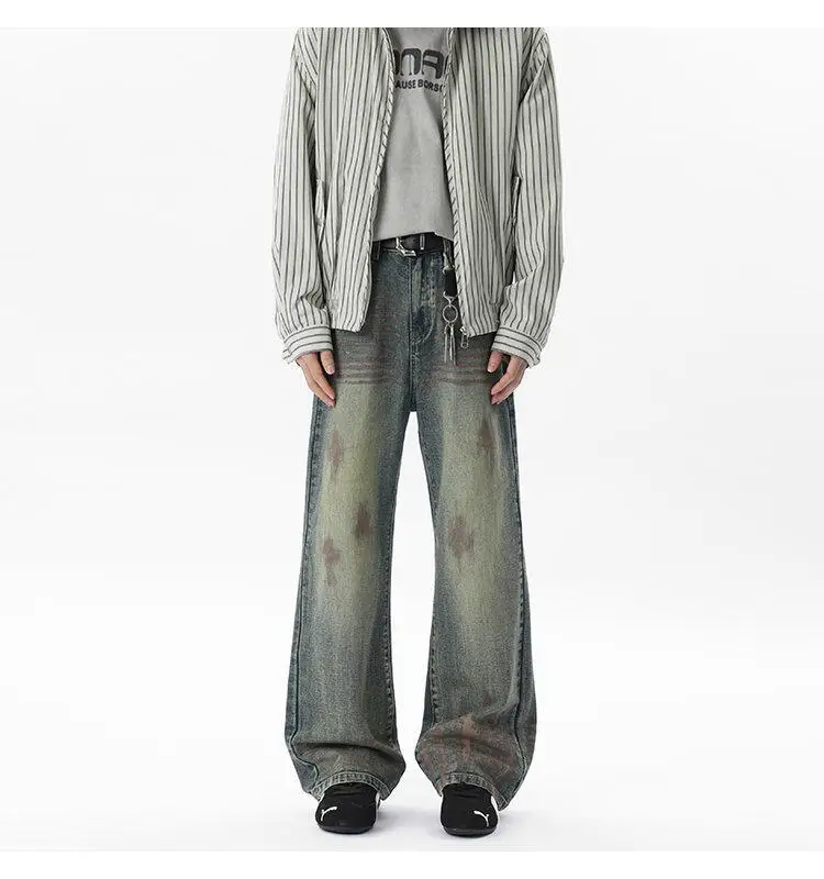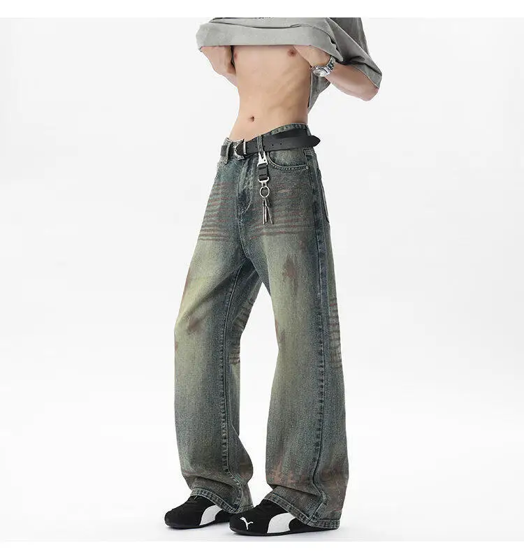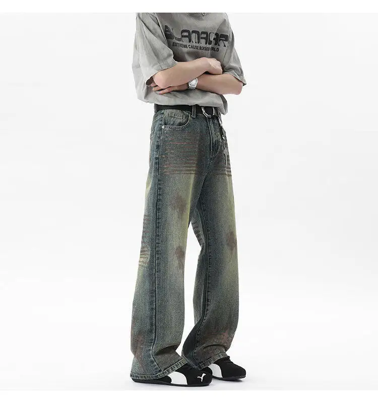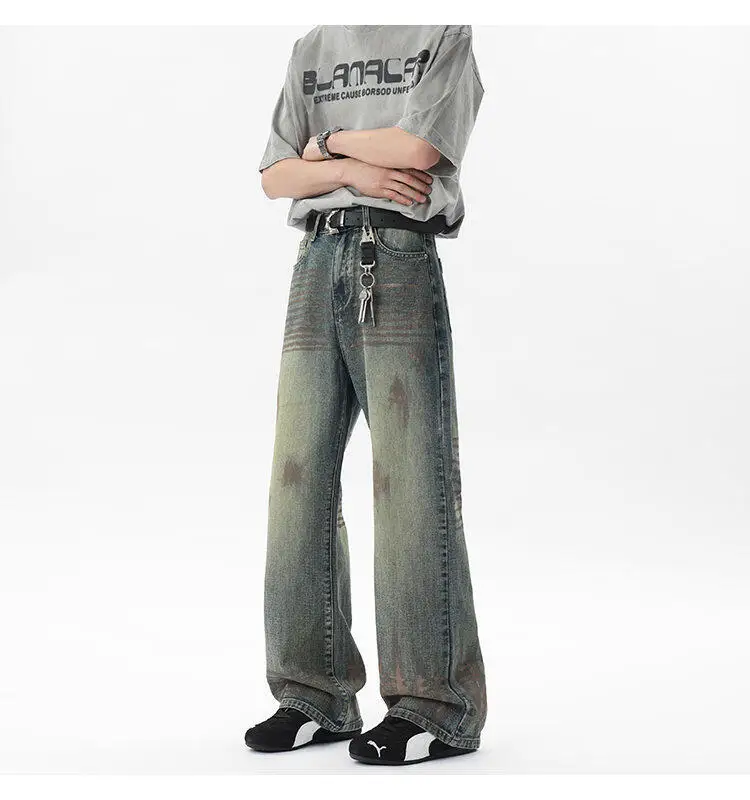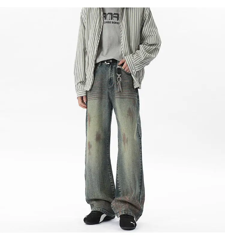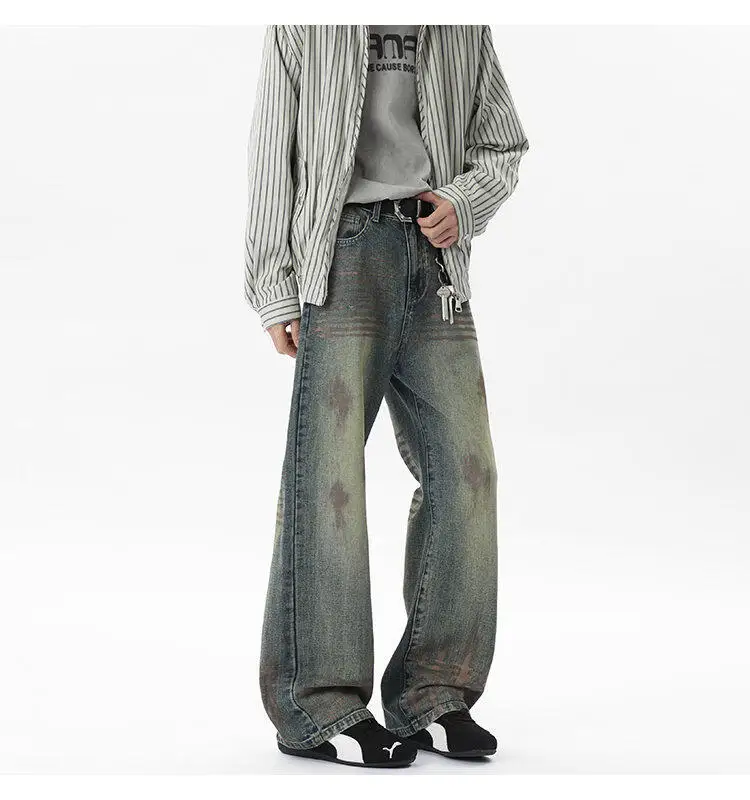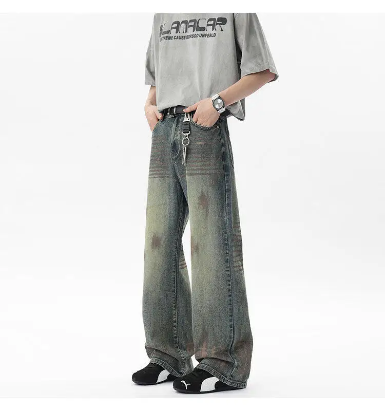 Male Jeasn Splashed Ink Glitter Design New American Style Straight Wide Leg Worn-out Stylish Men's Summer Bottoms 9W1854