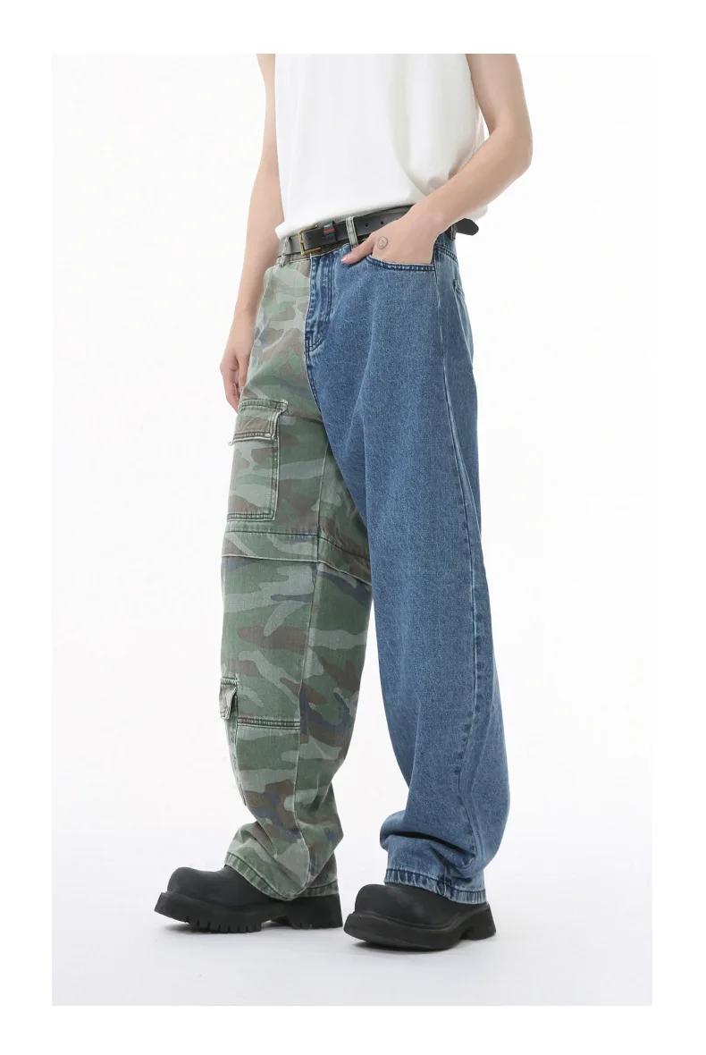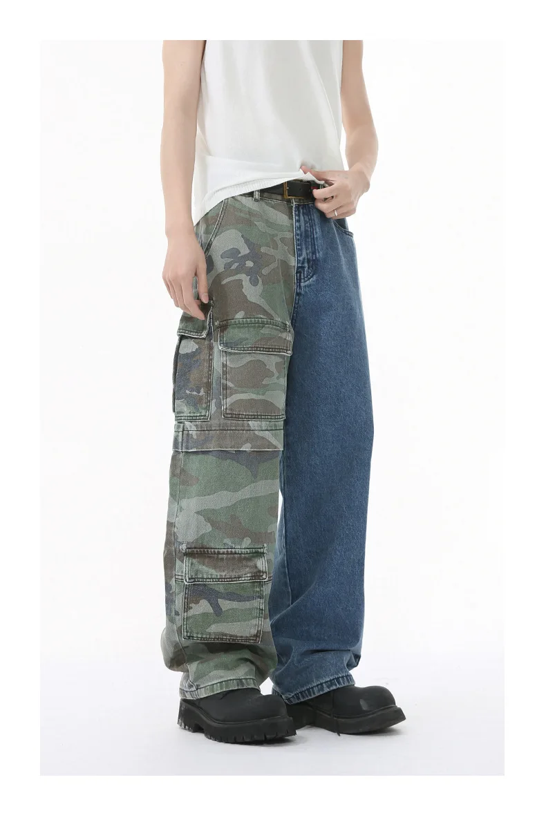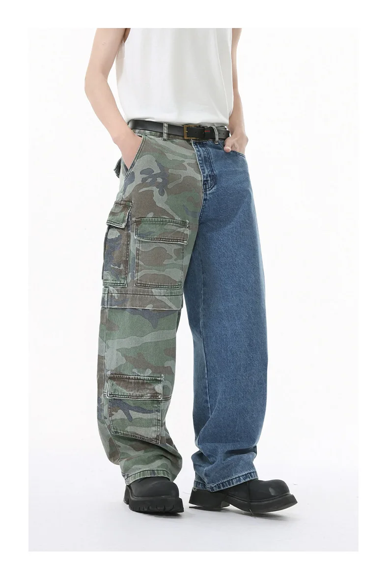 Men Jeans Niche Personalized Camouflage Splicing Two Color Fashion Multi Pockets Loose High Street Denim Pants 9W1679