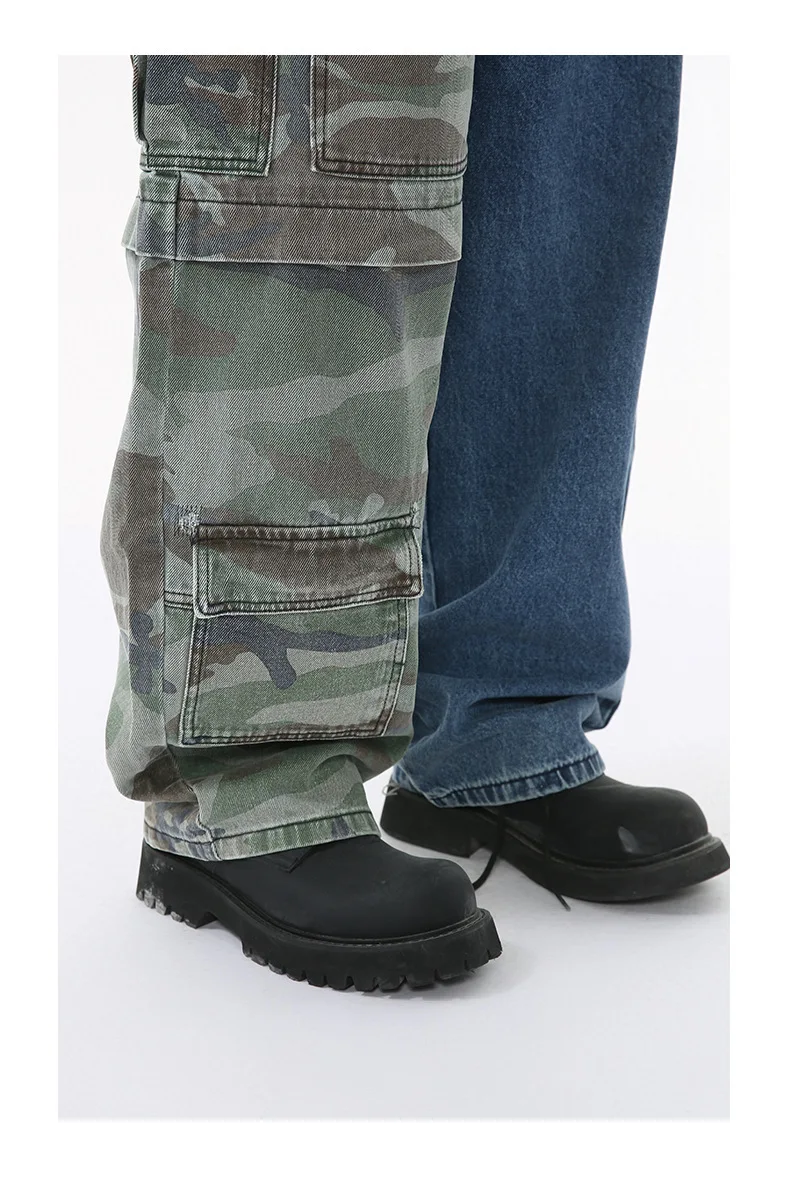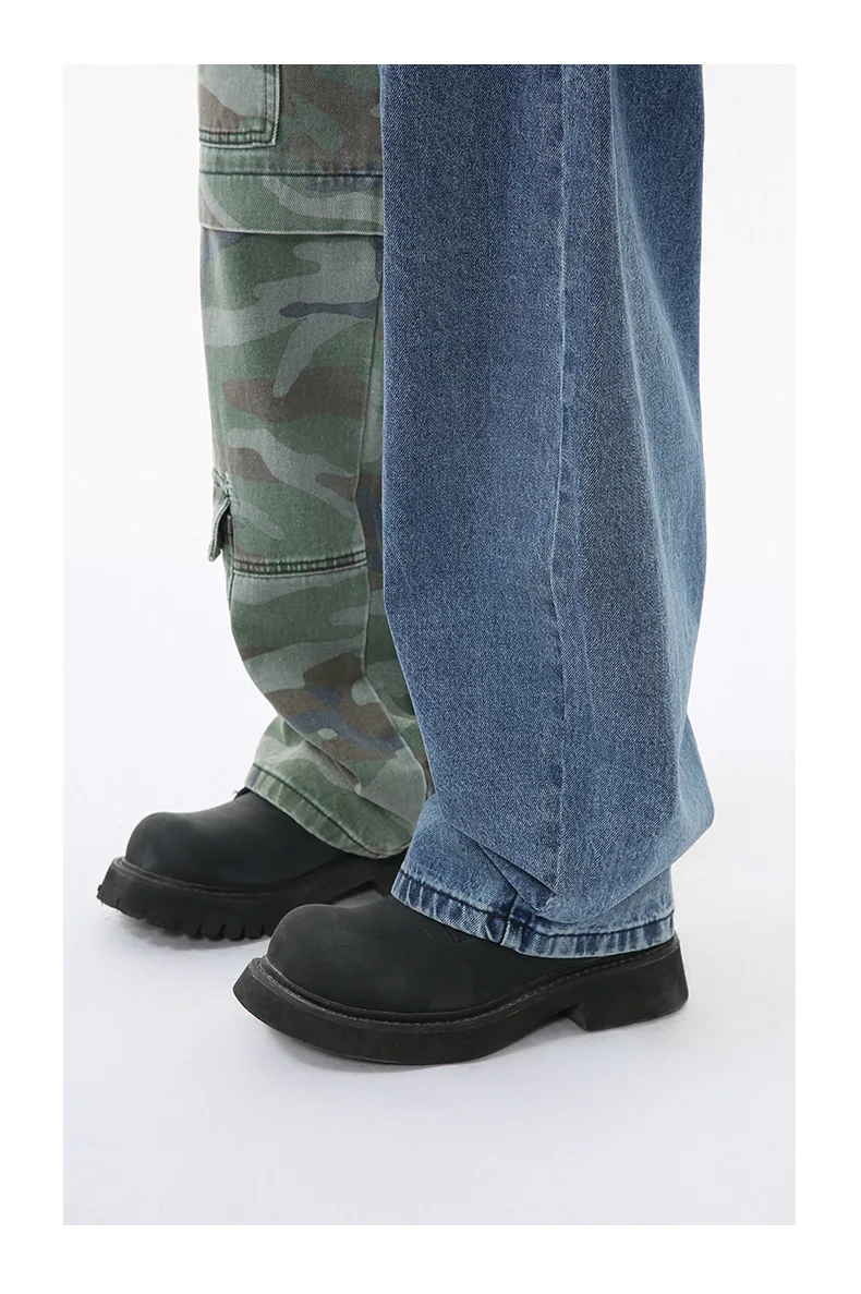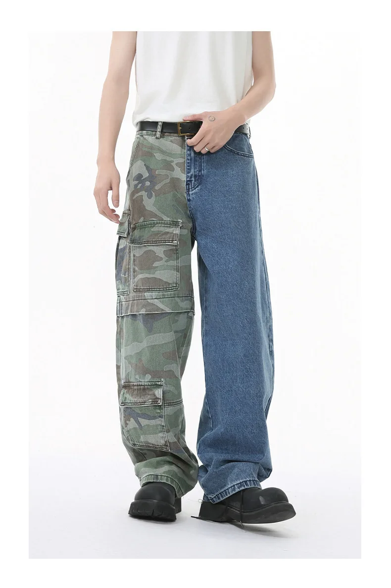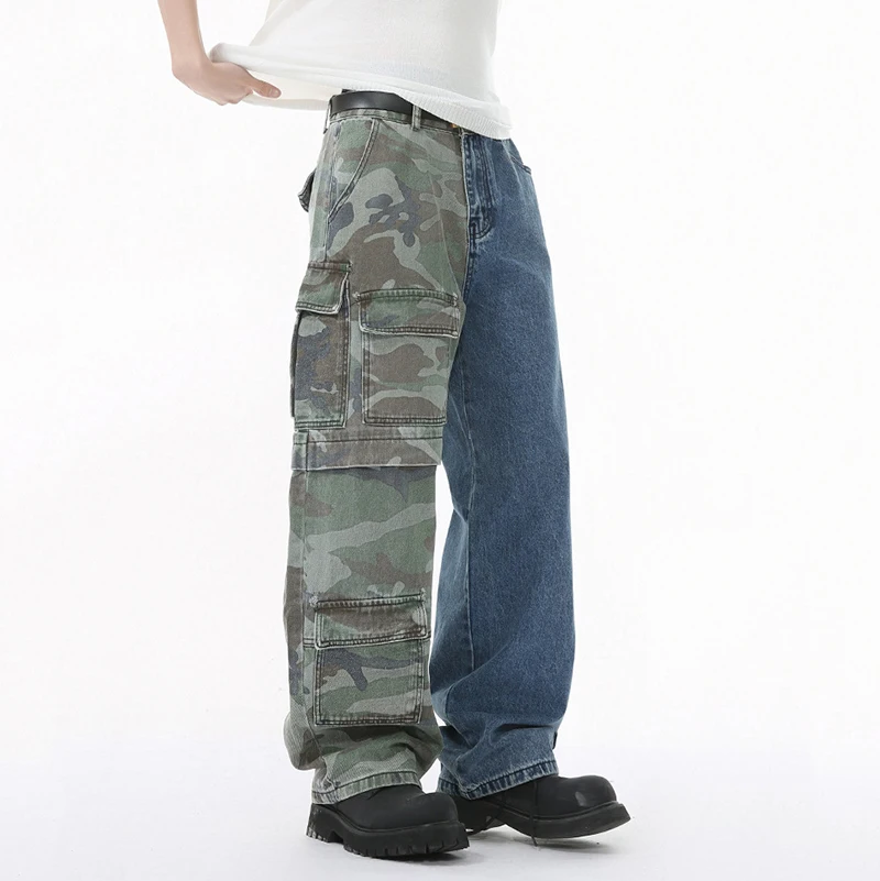 Men Jeans Niche Personalized Camouflage Splicing Two Color Fashion Multi Pockets Loose High Street Denim Pants 9W1679