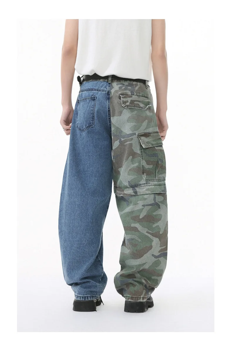 Load image into Gallery viewer, Men Jeans Niche Personalized Camouflage Splicing Two Color Fashion Multi Pockets Loose High Street Denim Pants 9W1679