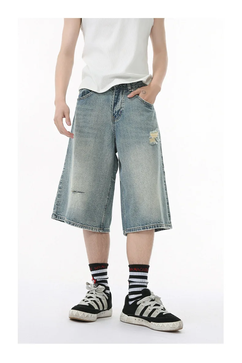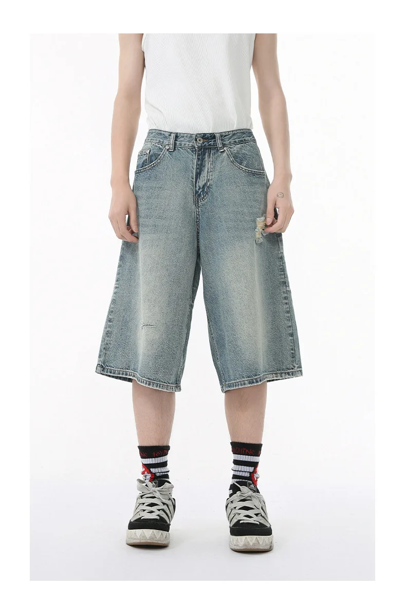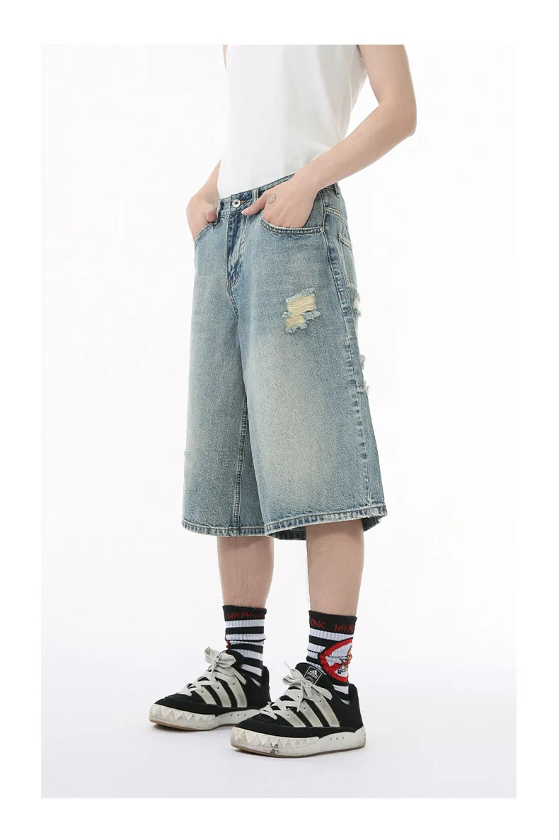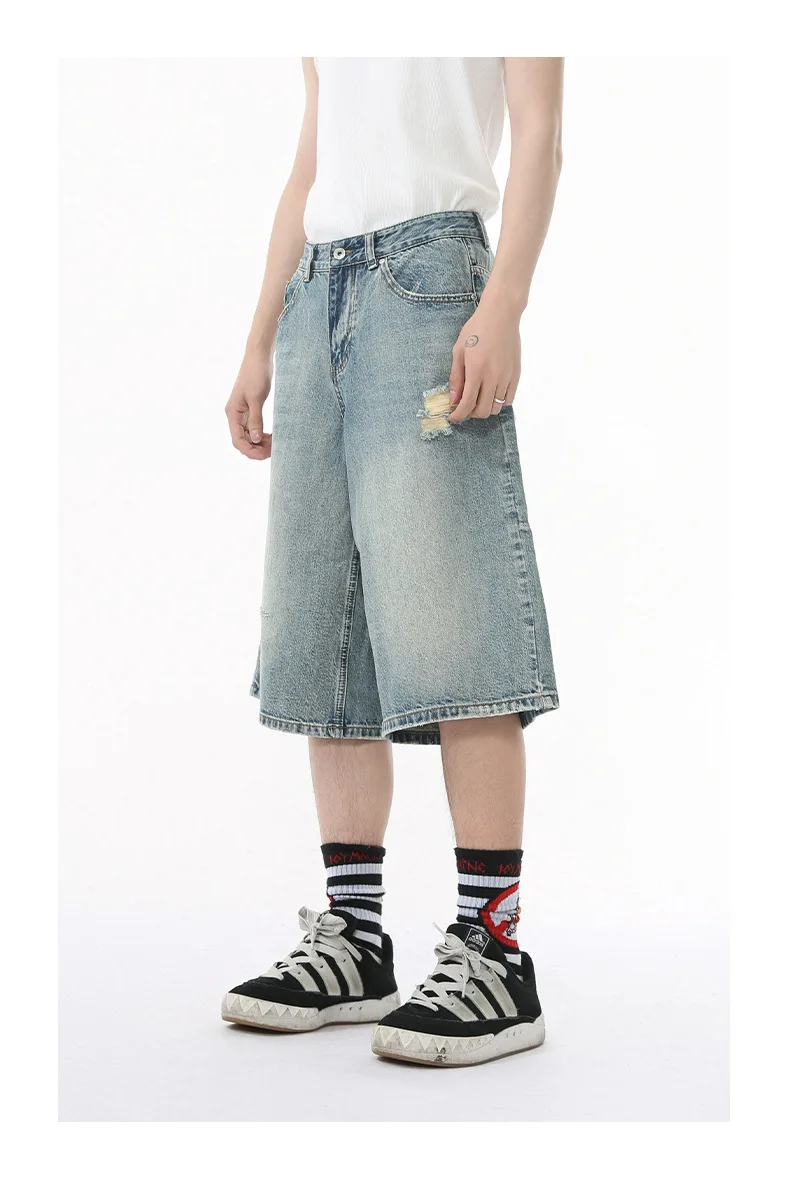 Men's Denim Pants Washed Hole Worn-out Shorts New Fashion American Wide Leg Jeans Stylish Casual Trendy Menwear 9W1588