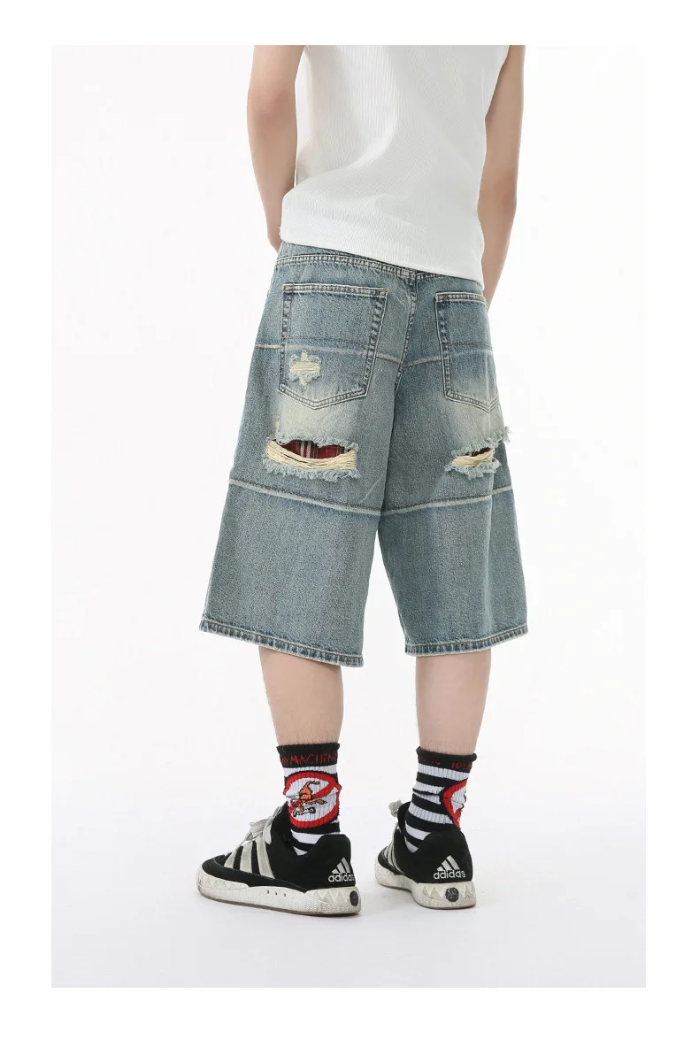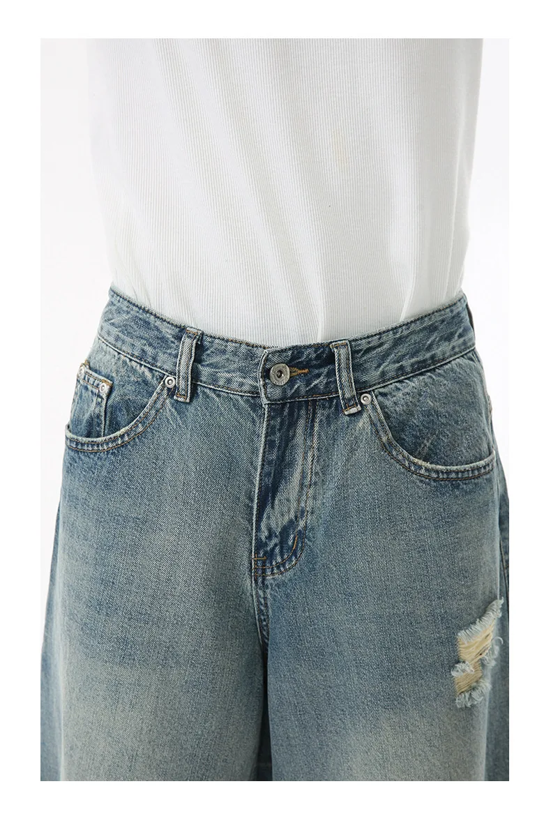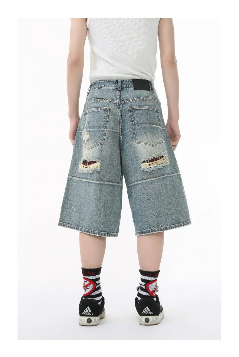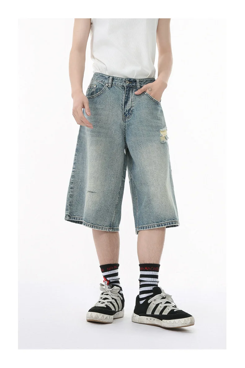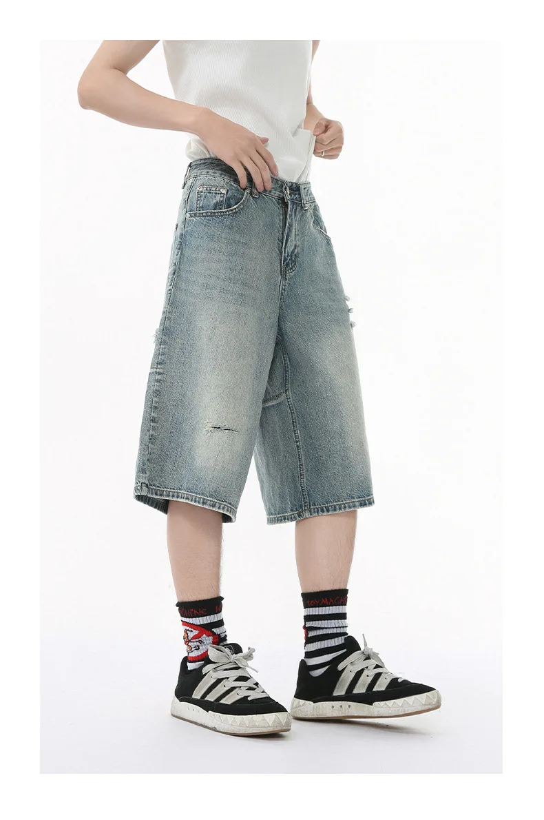 Men's Denim Pants Washed Hole Worn-out Shorts New Fashion American Wide Leg Jeans Stylish Casual Trendy Menwear 9W1588