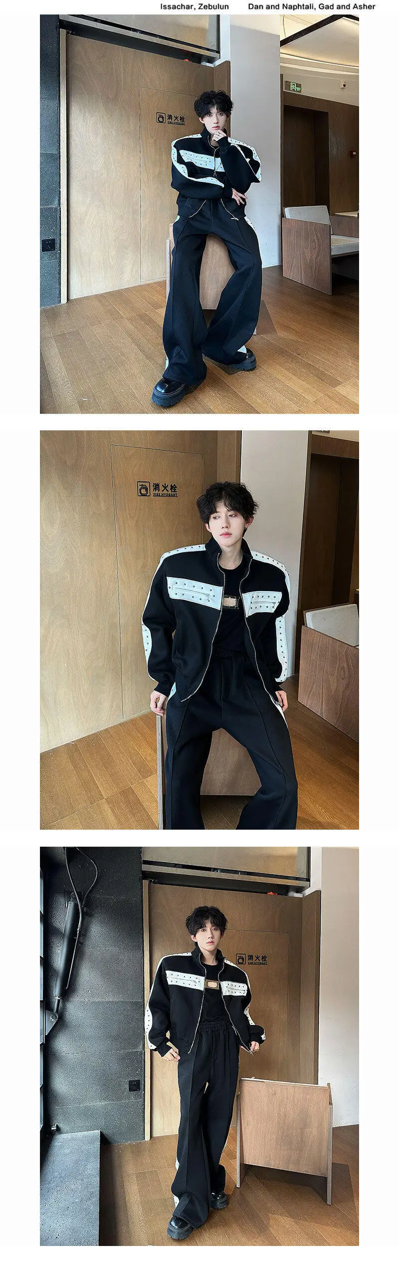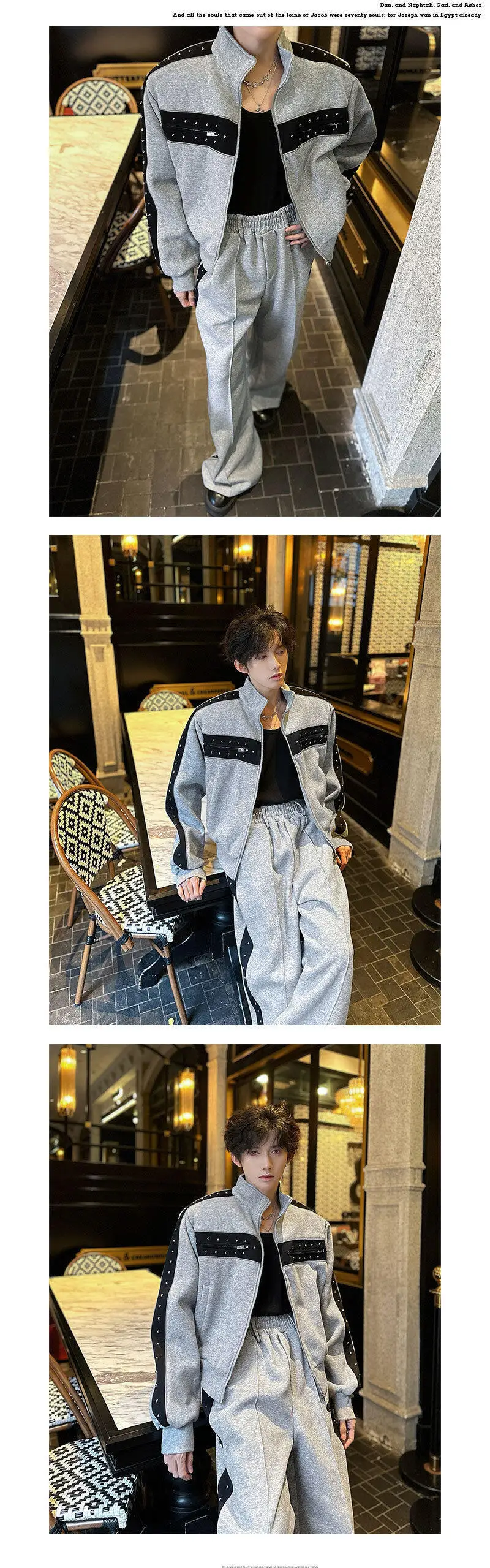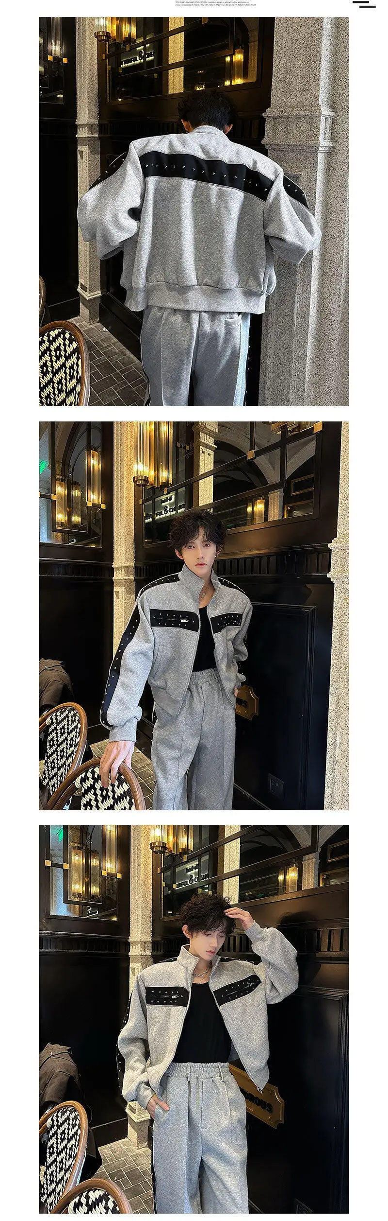 Men's Jacket Rivets Design Contrasting Color Stand Collar New Korean Shoulder Pad Jackets Multi Zippers Spring 2025 9W1344