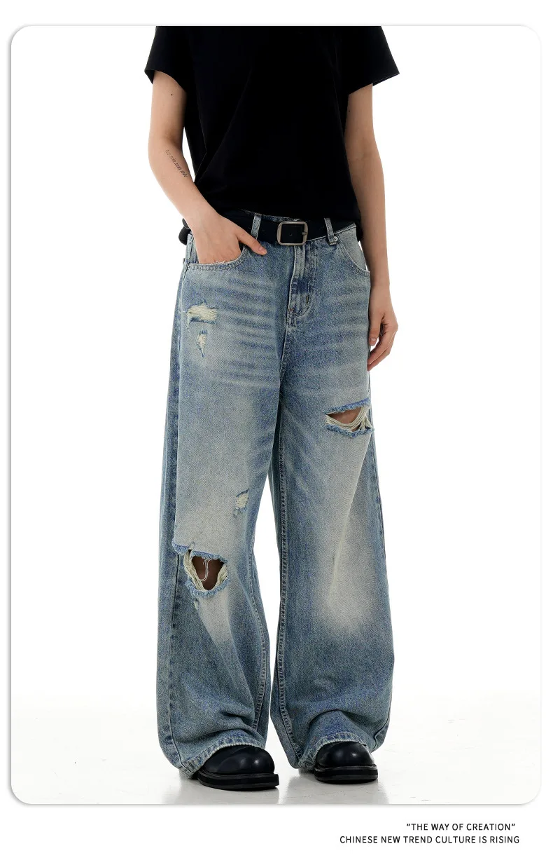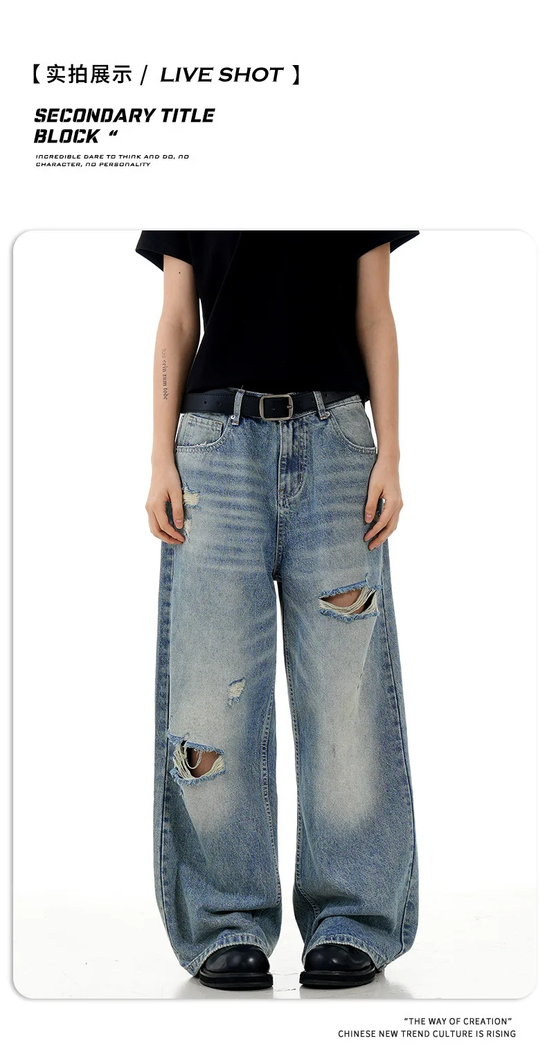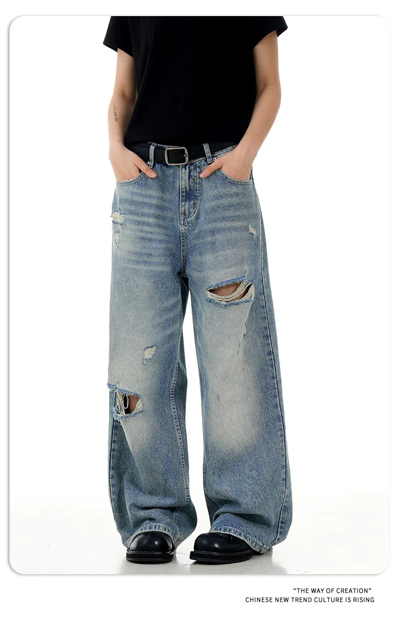 Men's Jeans Cat Whisker Ripped Deisgn Summer Hole Stylish Loose Korean Straight Wide Leg Male Casual Trousers 9W1721