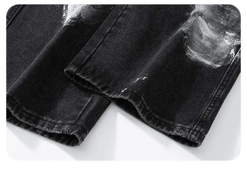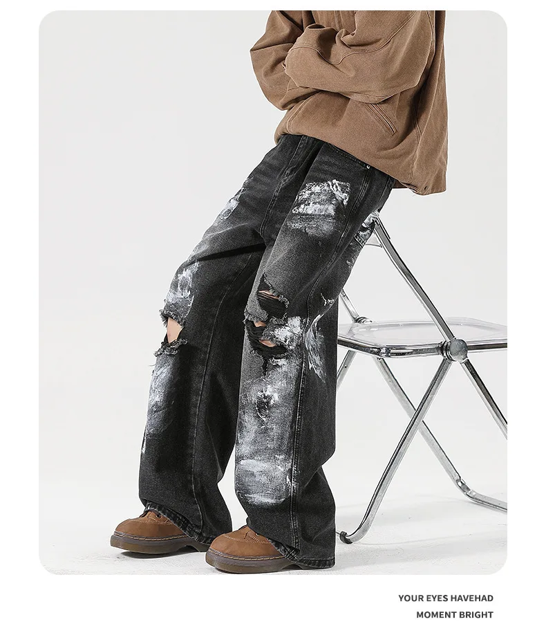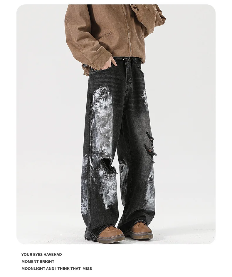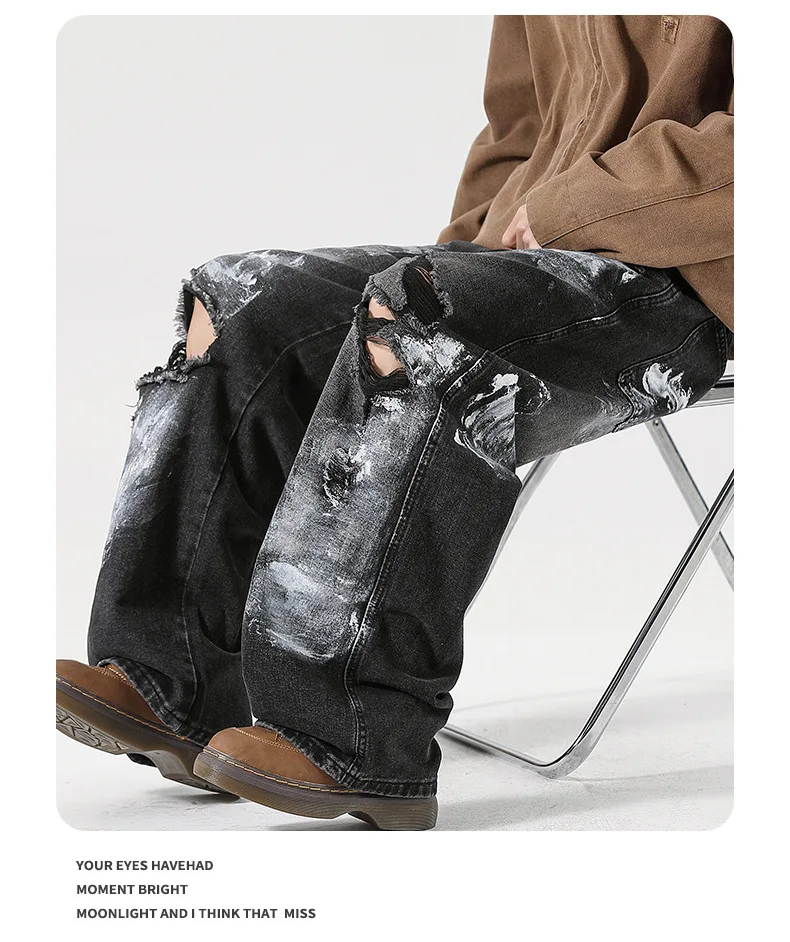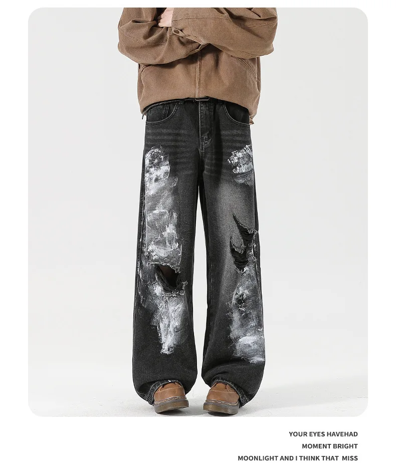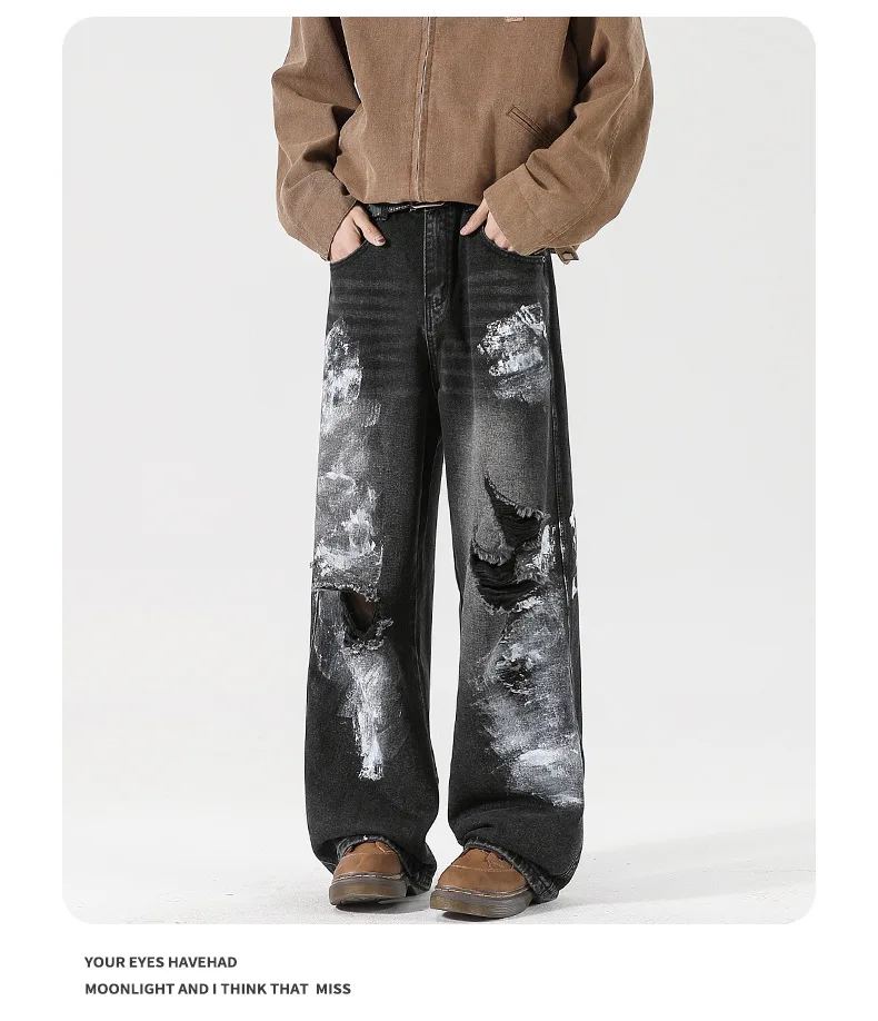 Men's Jeans New American Style Niche Design Graffiti Ripped Design Straight Wide Leg Hole Stylish Male Clothing 9W2023