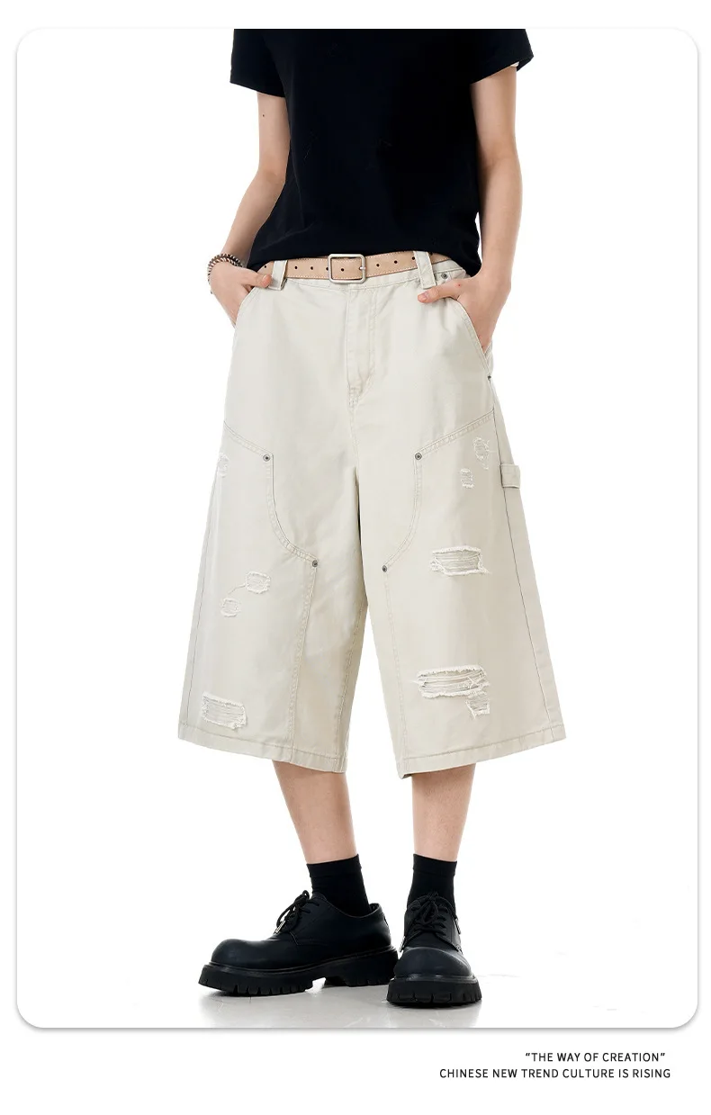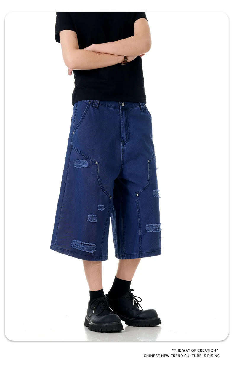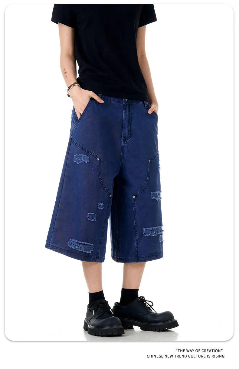 Men's Jeans New American Washed Distressed Denim Shorts High Street Loose Wide Leg Cropped Pants Solid Color Bottoms 9W1715