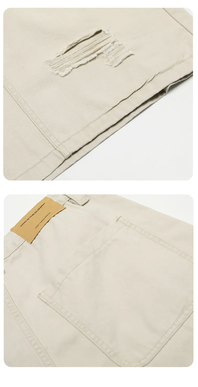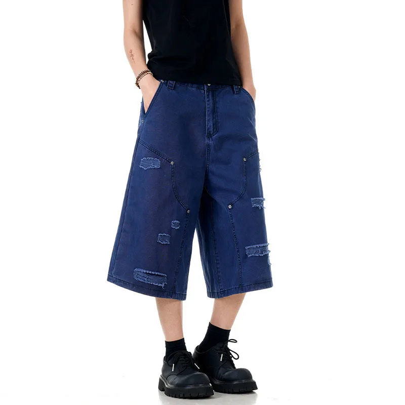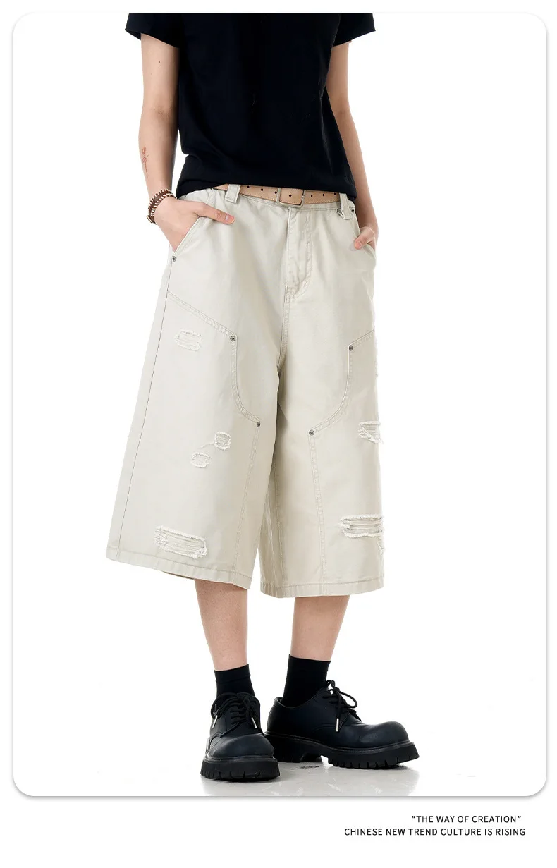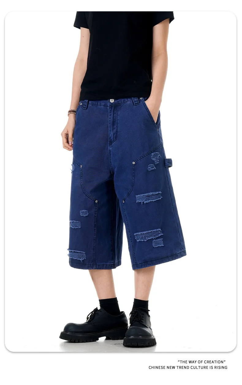 Men's Jeans New American Washed Distressed Denim Shorts High Street Loose Wide Leg Cropped Pants Solid Color Bottoms 9W1715