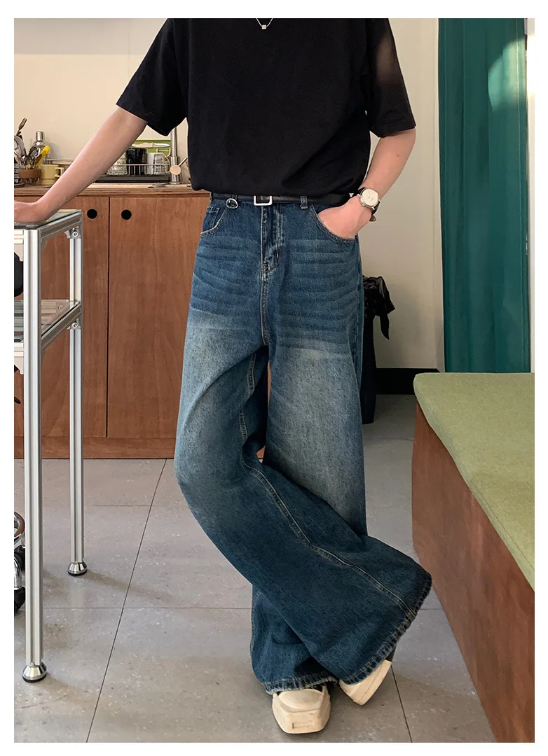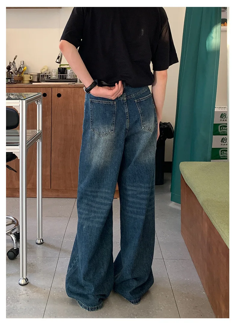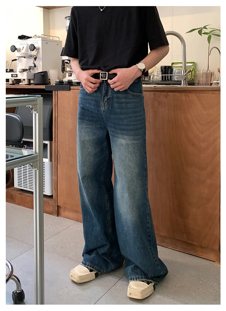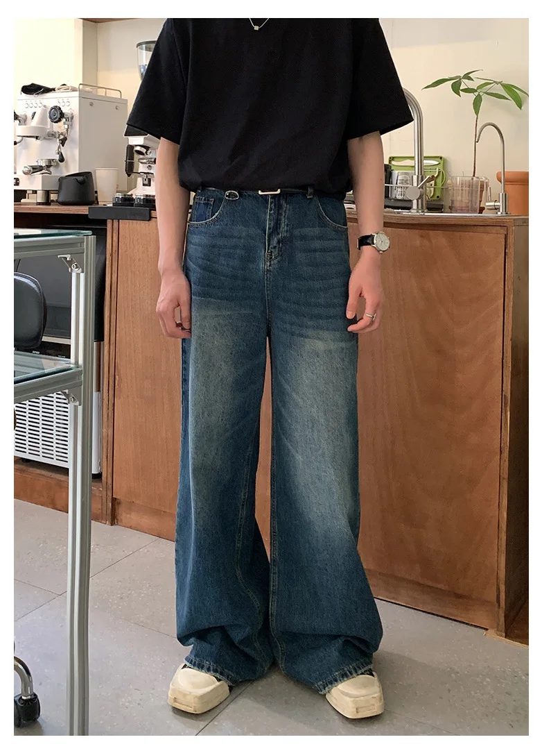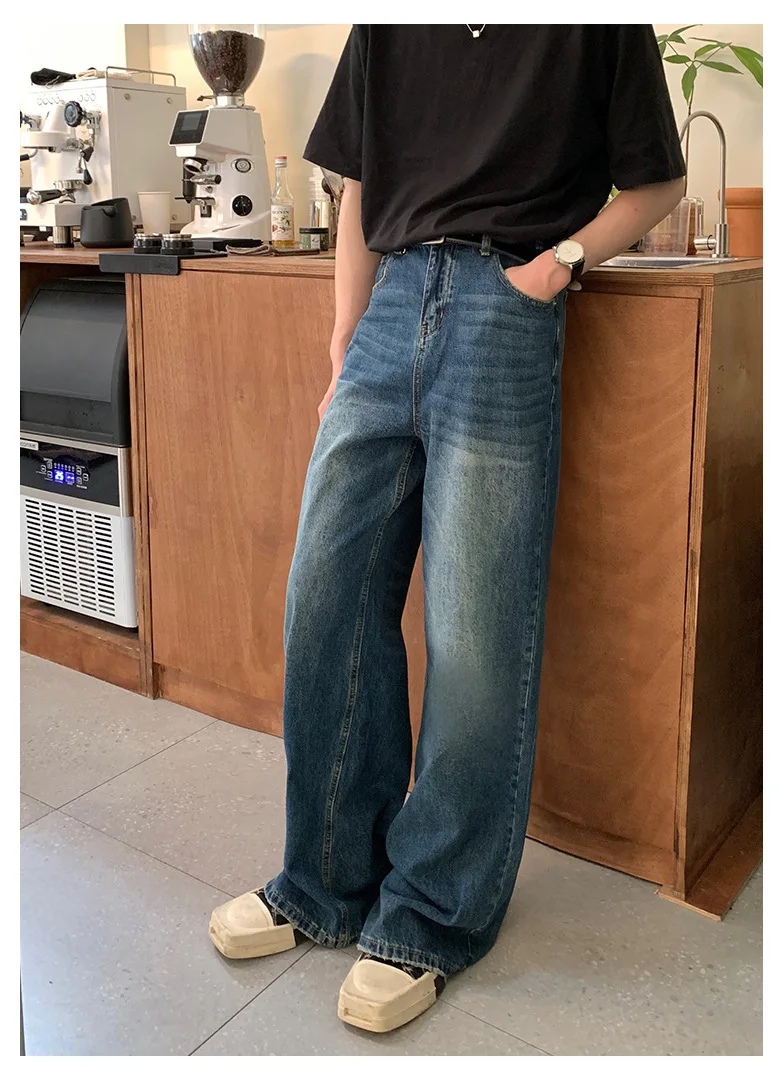 Men's Jeans New Fashion Loose Solid Color Straight Leg Washed Denim Pants Casual Floor Length Trousers Men Clothing 9W1421