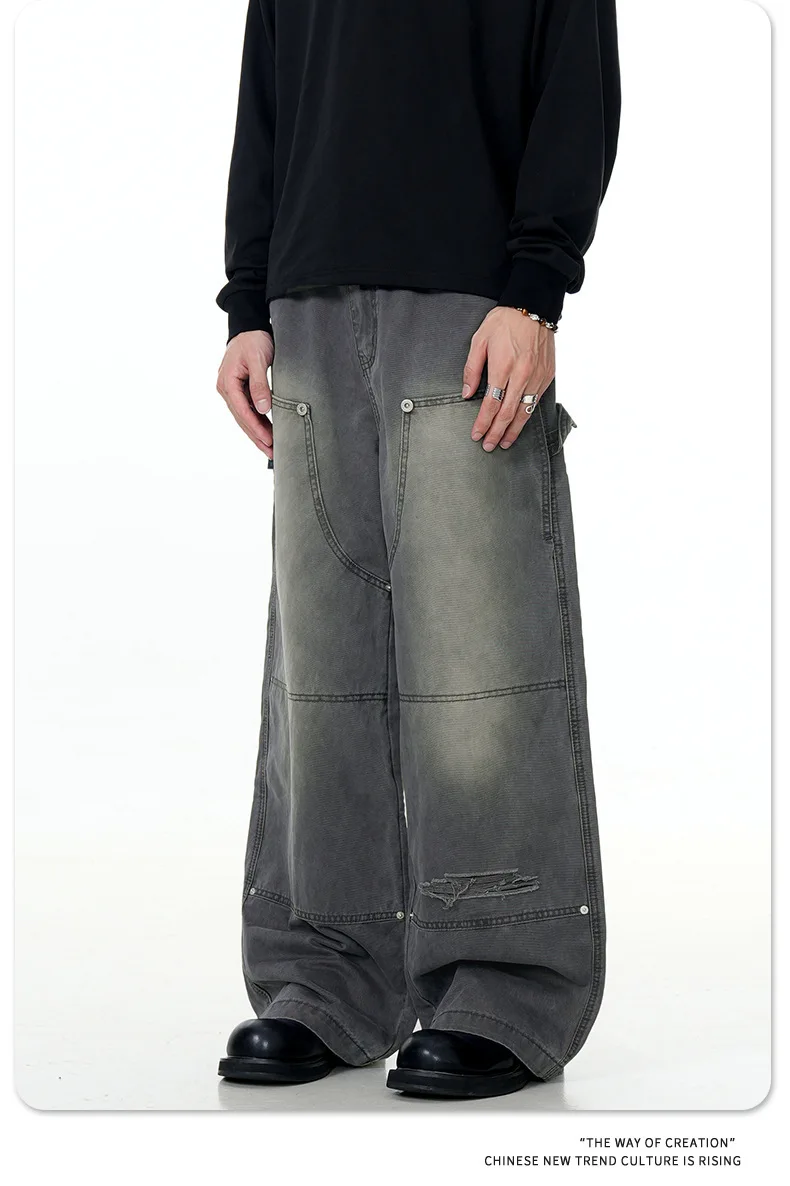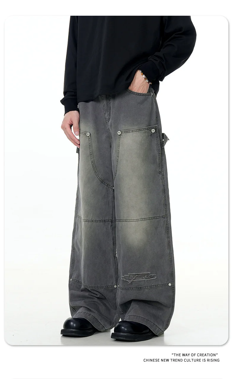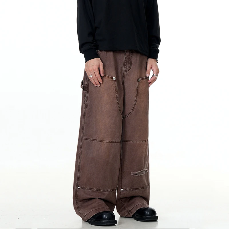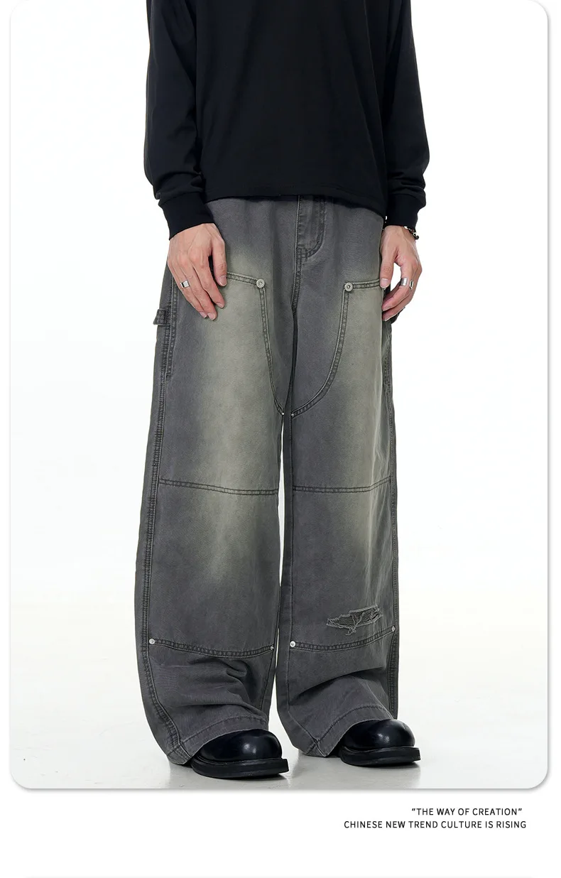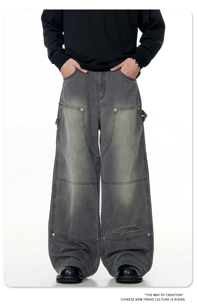 11KN kiểu Mỹ cổ điển mùa thu đông đinh tán nước rửa làm quần jean công nhân cũ rộng thùng thình lau nhà quần dài qua biên giới