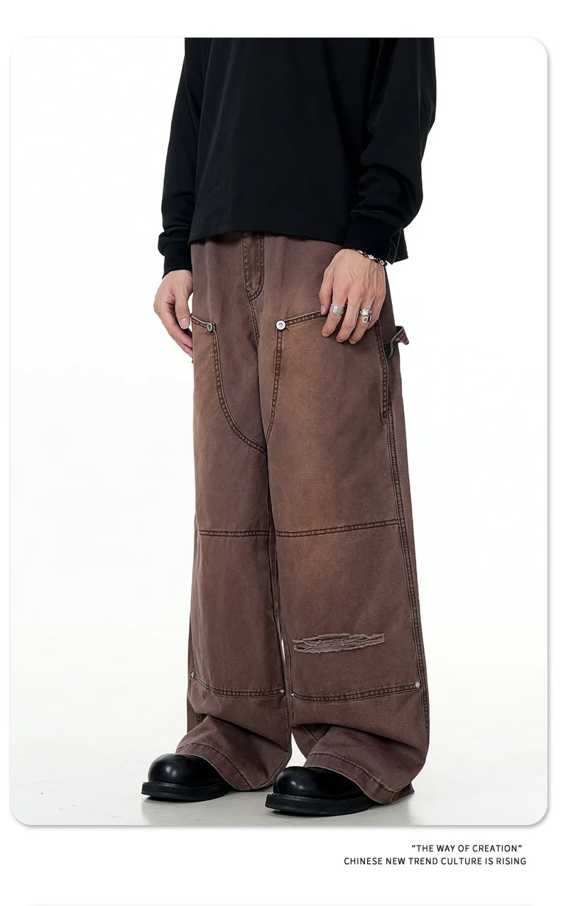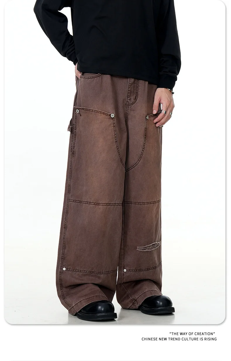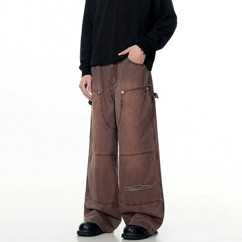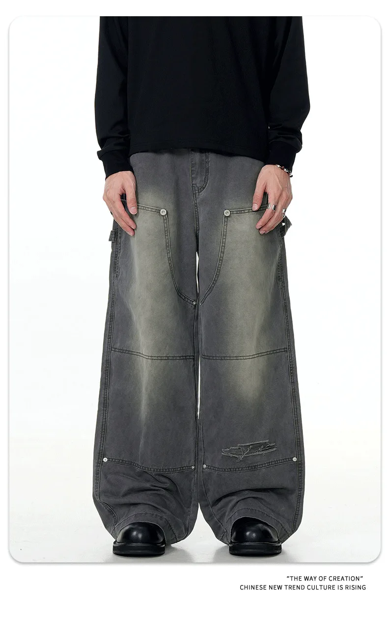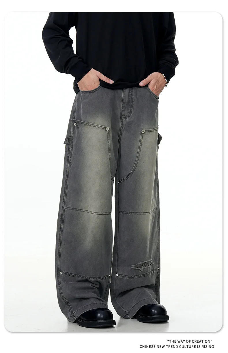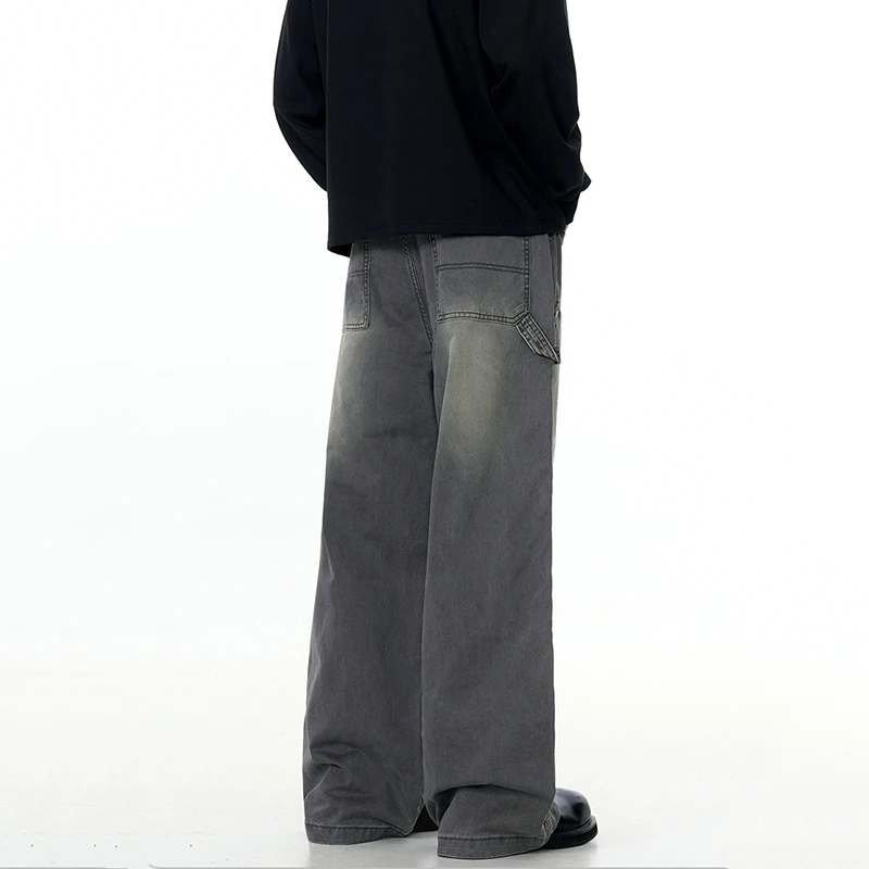 11KN kiểu Mỹ cổ điển mùa thu đông đinh tán nước rửa làm quần jean công nhân cũ rộng thùng thình lau nhà quần dài qua biên giới