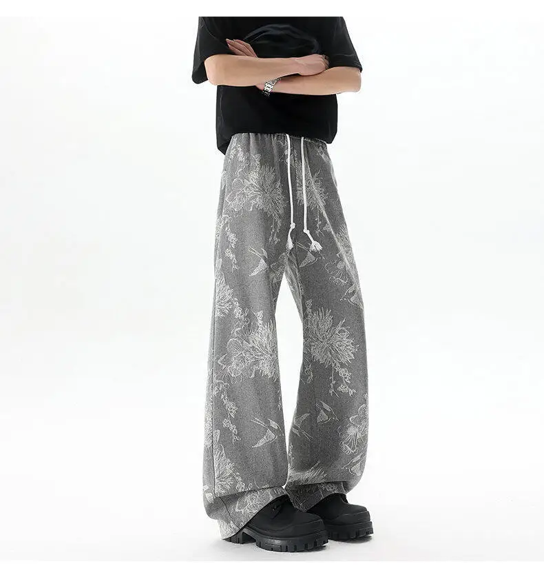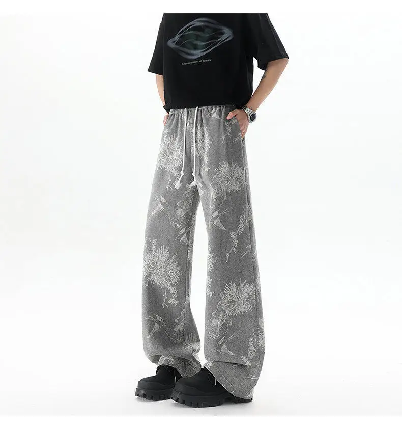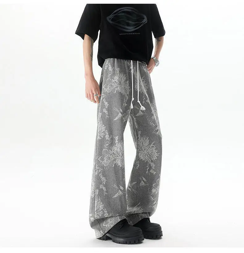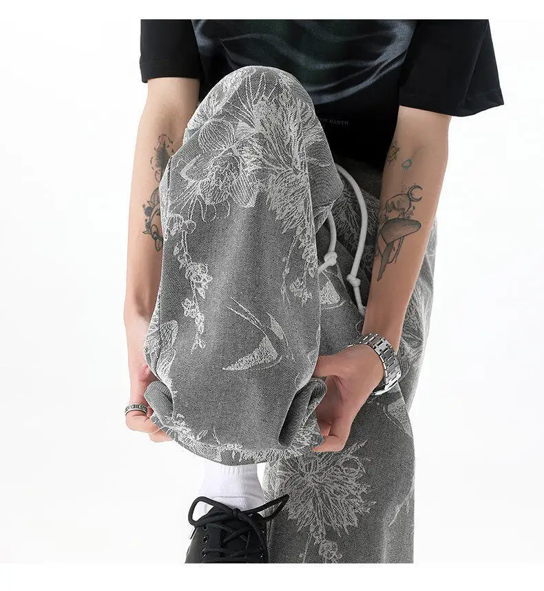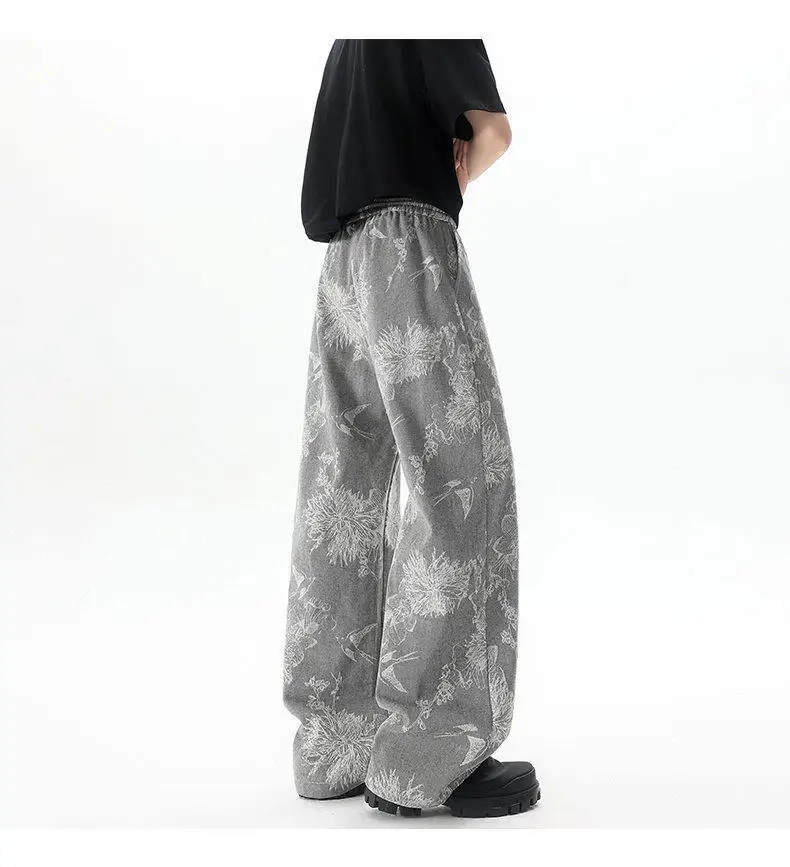Men's Jeans New Summer New Korean Tide Flower Printed Design Loose Personalized Trendy Male Elastic Waist Trousers 9W1643