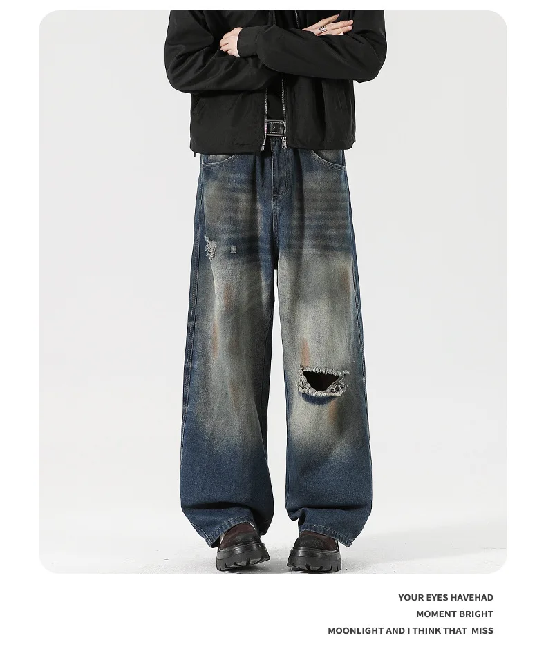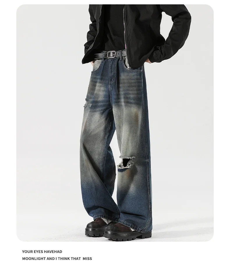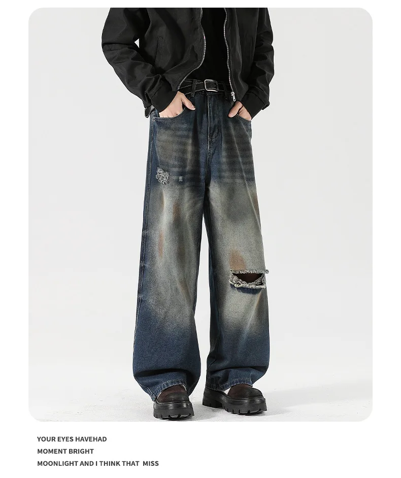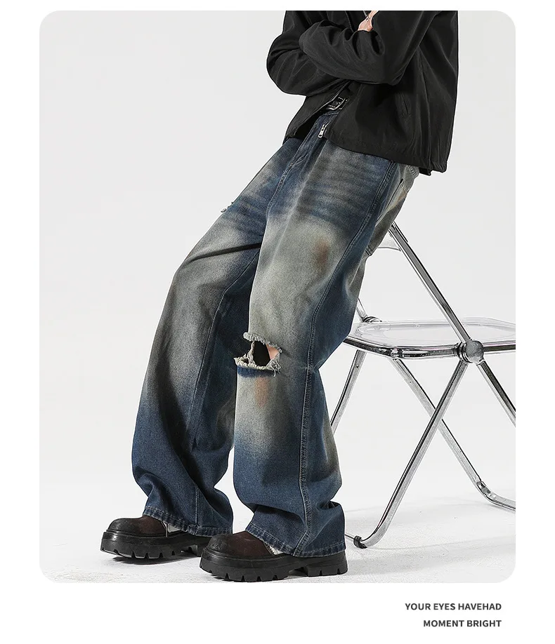 Men's Jeans Washed Dirty Ripped Stylish Hole Worn-out Design High Street Straight Leg Trendy Male Casual Trousers 9W2024