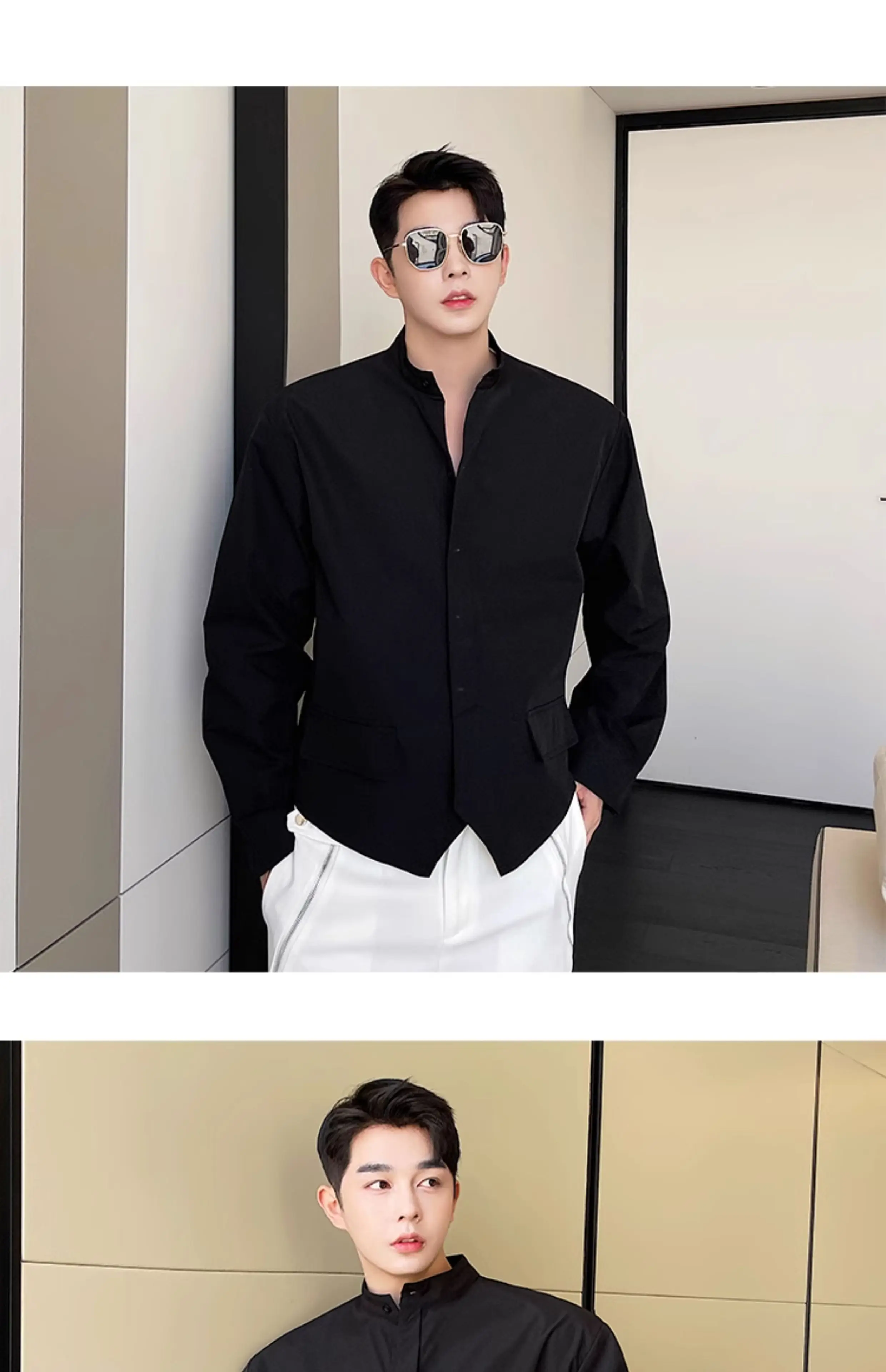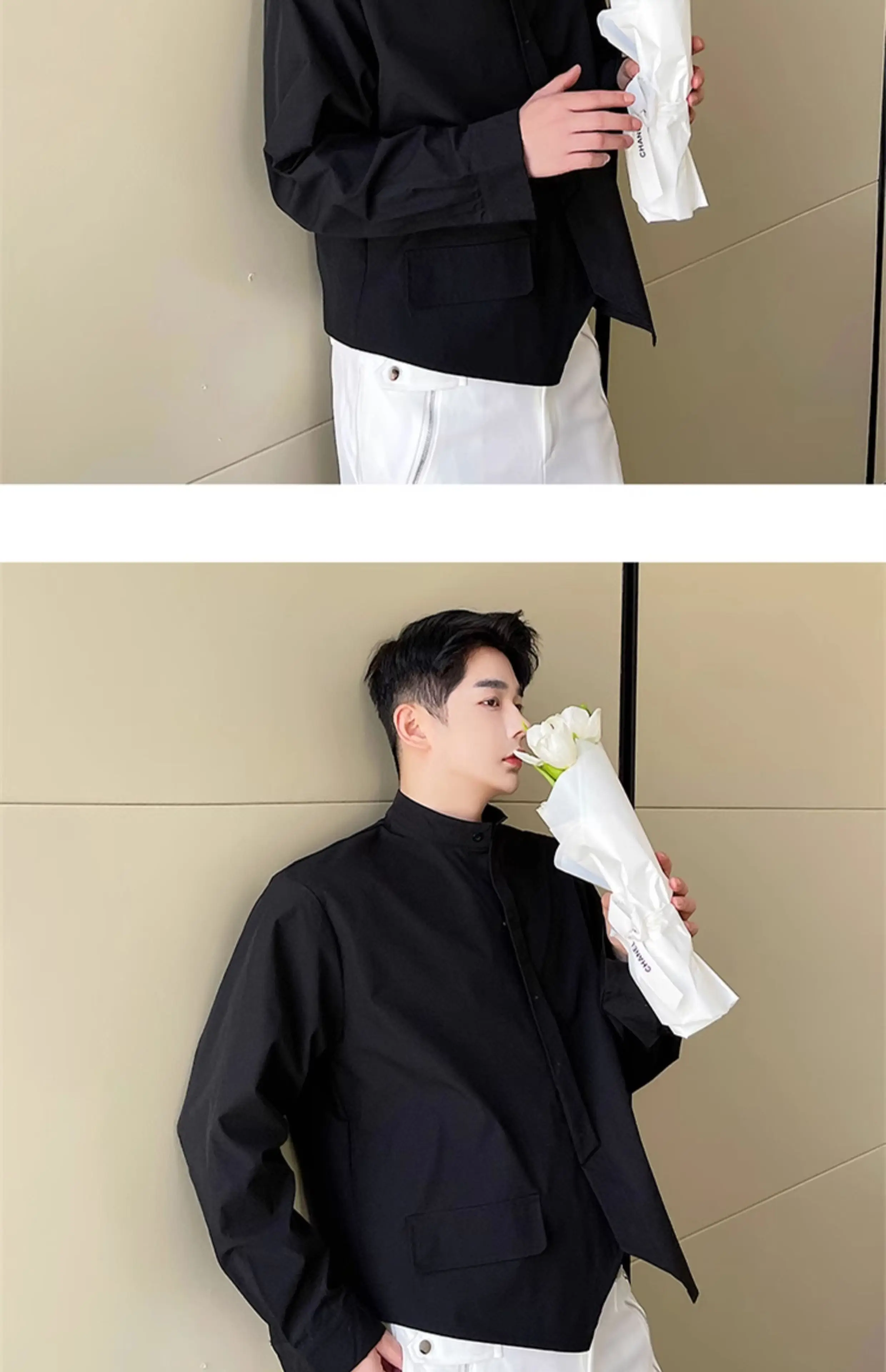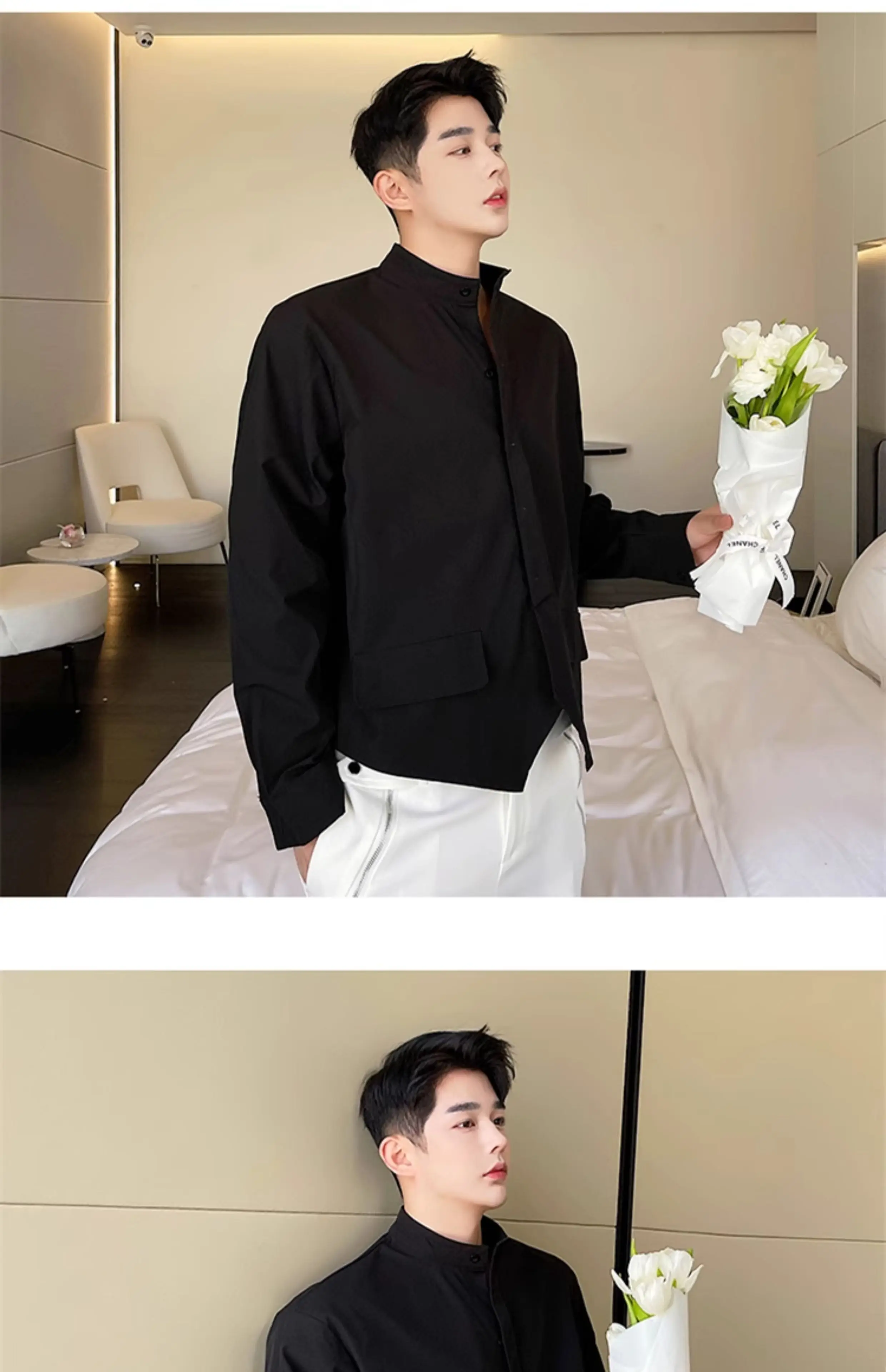 Men's Long Sleeved Shirts New Korean Fashion Solid Color Trend Double Pointed Hem Stand Collar Male Clothing Spring 9W1403