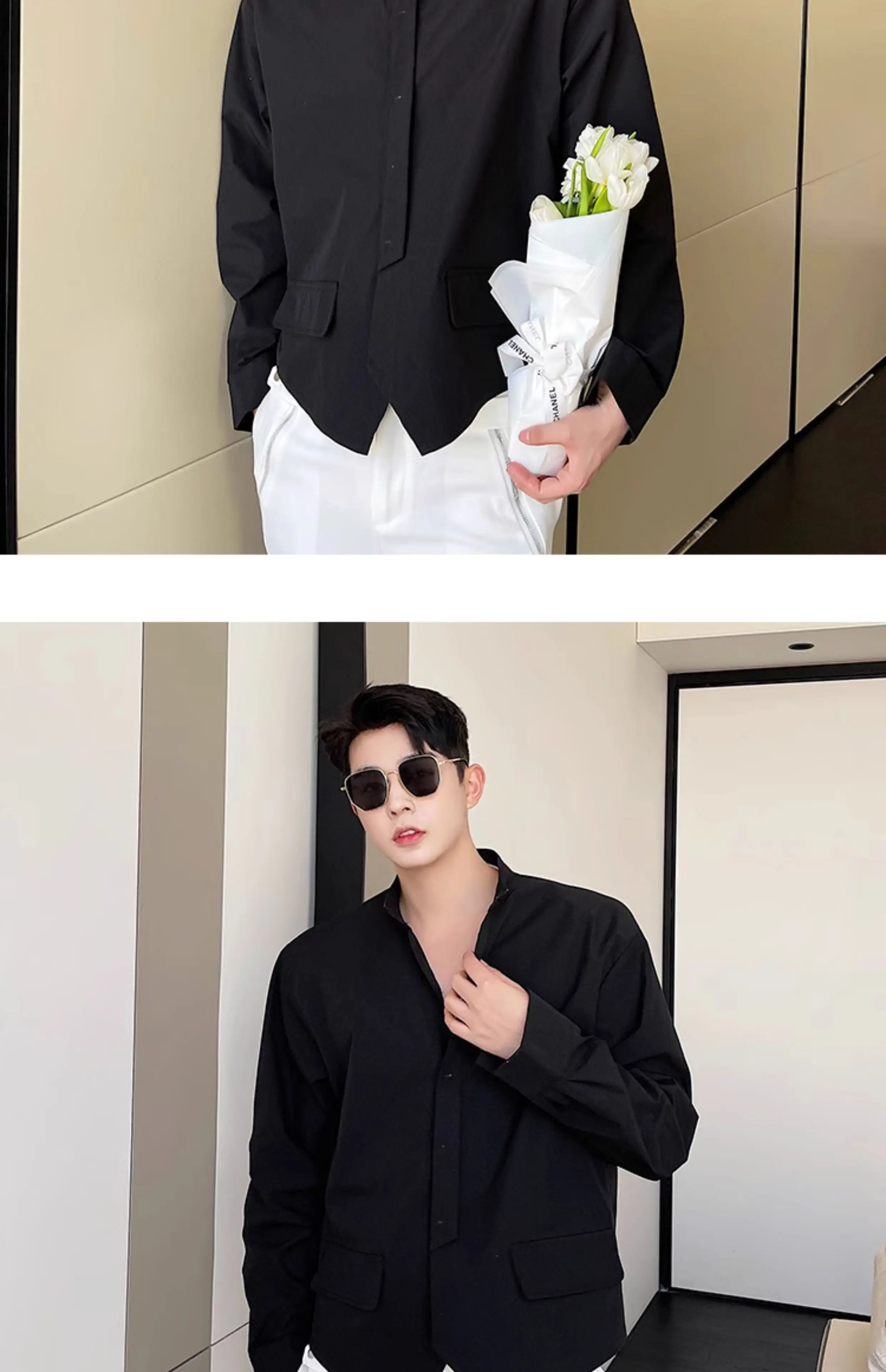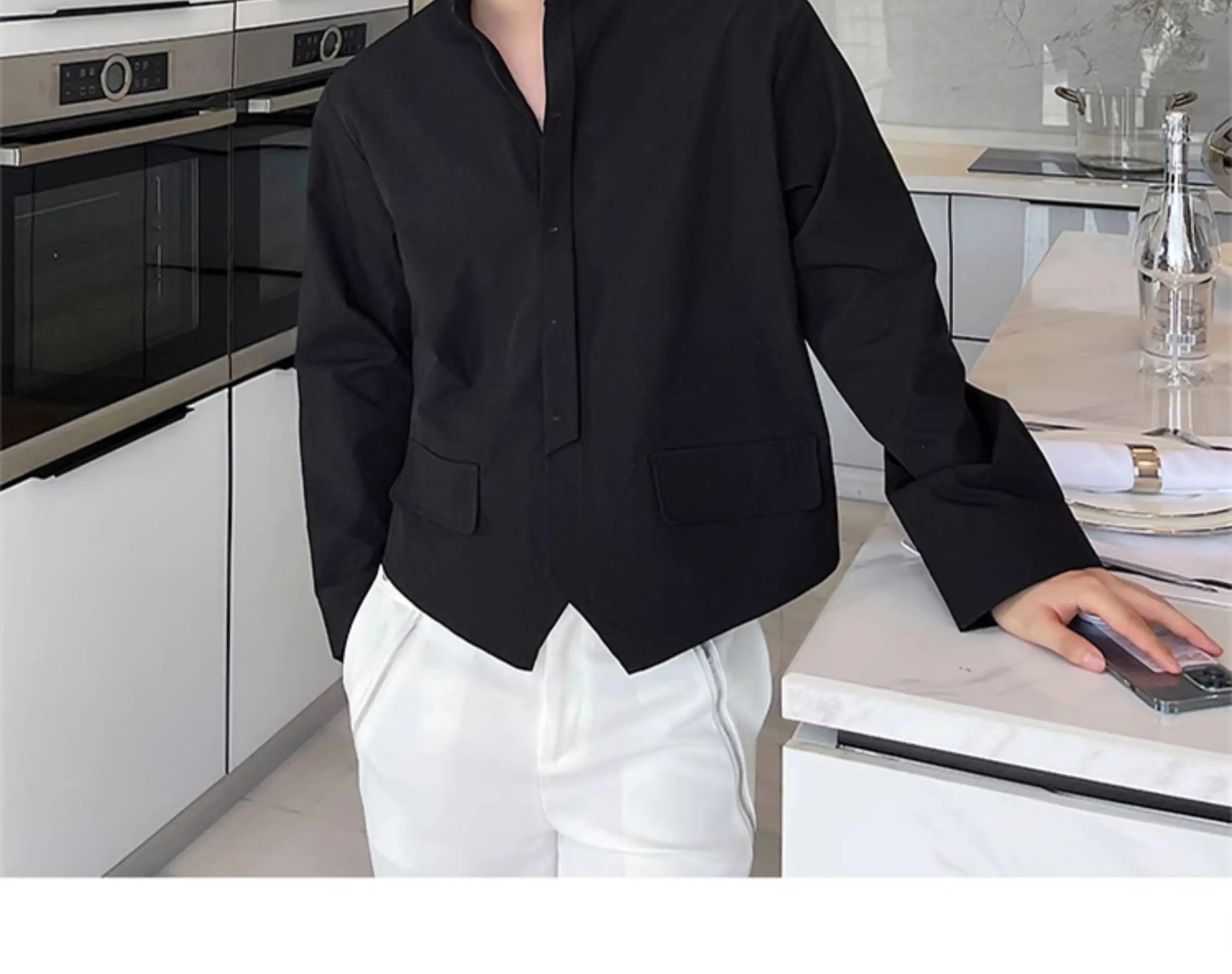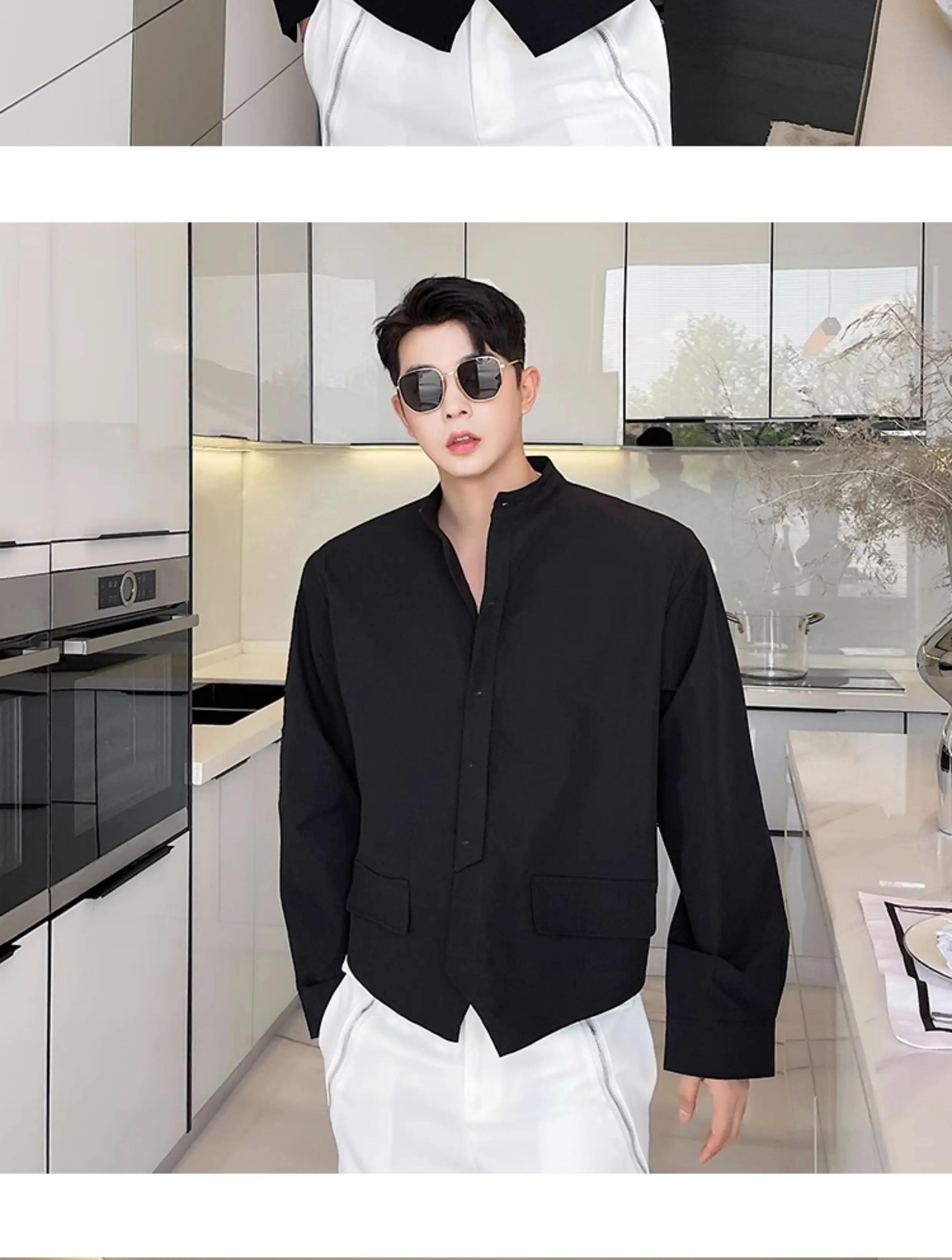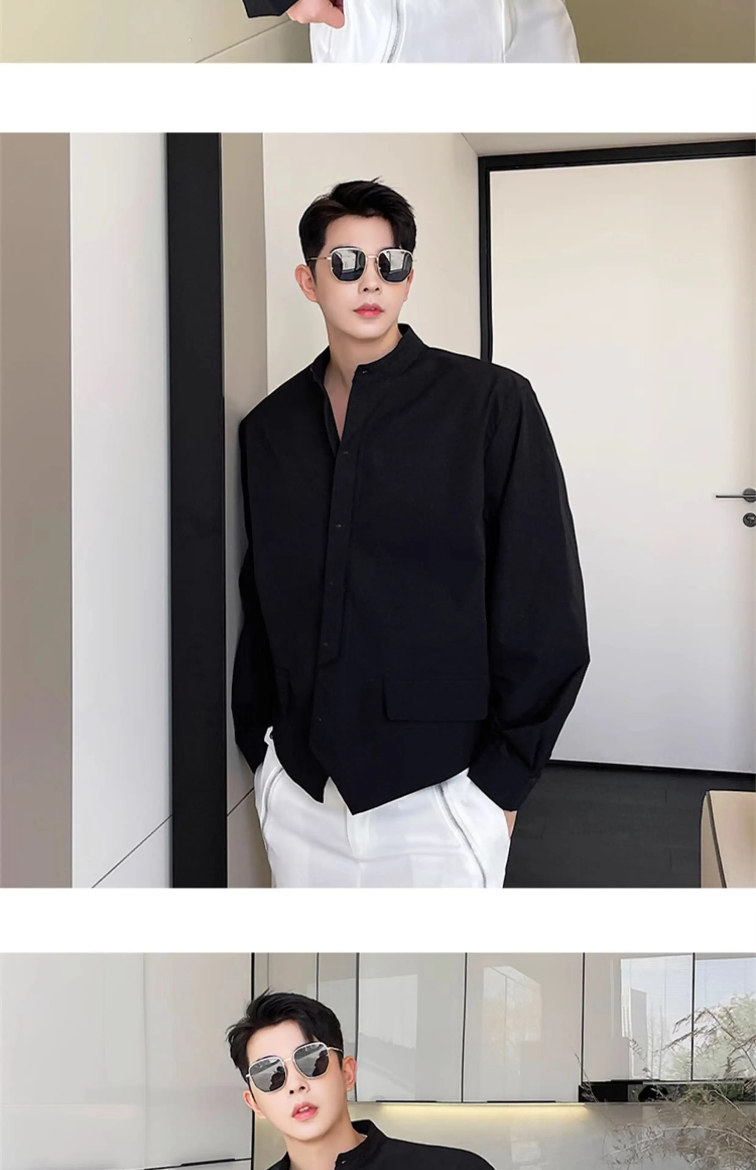 Men's Long Sleeved Shirts New Korean Fashion Solid Color Trend Double Pointed Hem Stand Collar Male Clothing Spring 9W1403