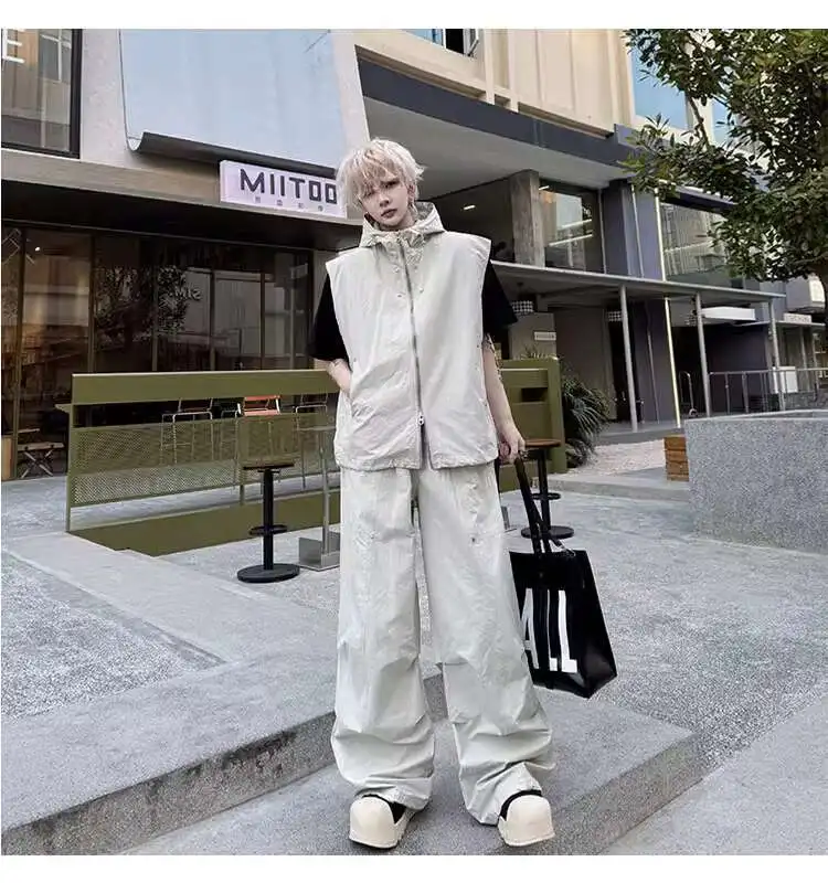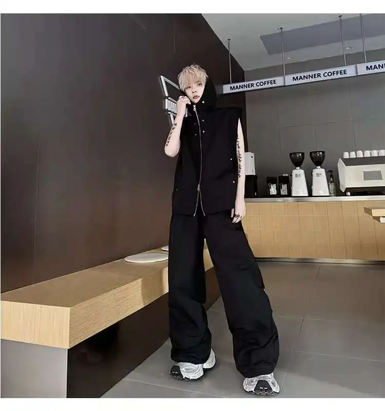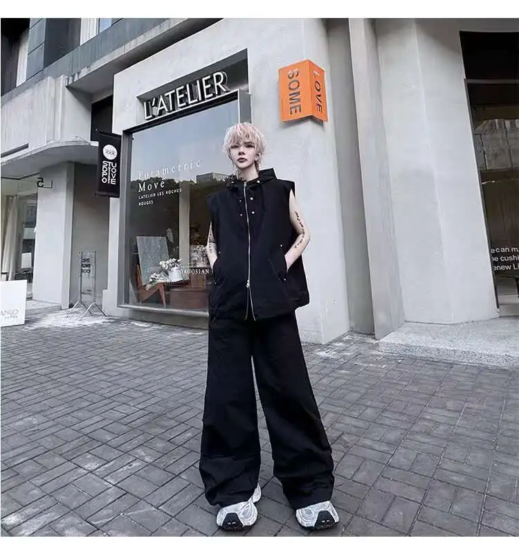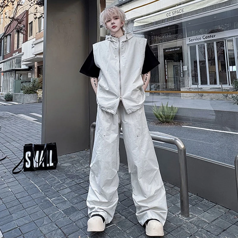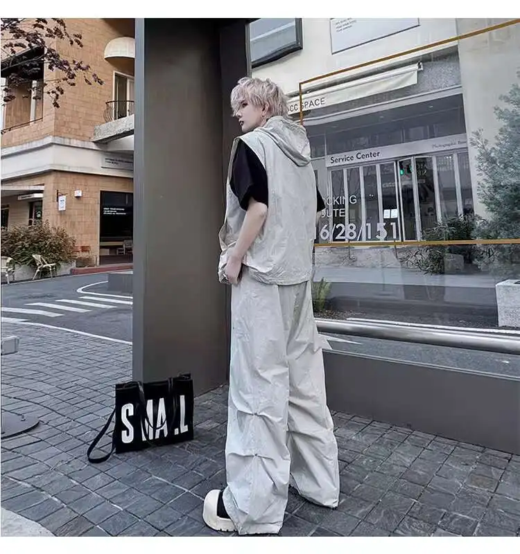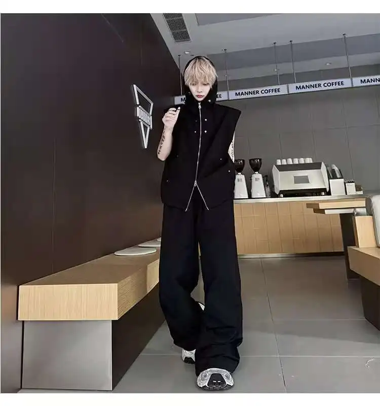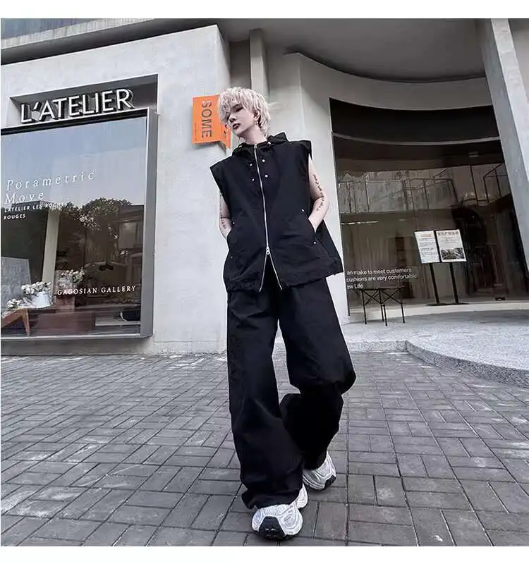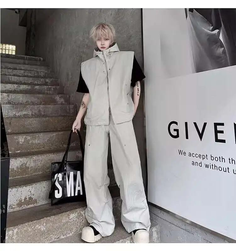 Men's Pants Set New Summer Solid Color Rivet Hooded Trendy Singel Breasted Vest Male Casual Straight Leg Pants 9W1790