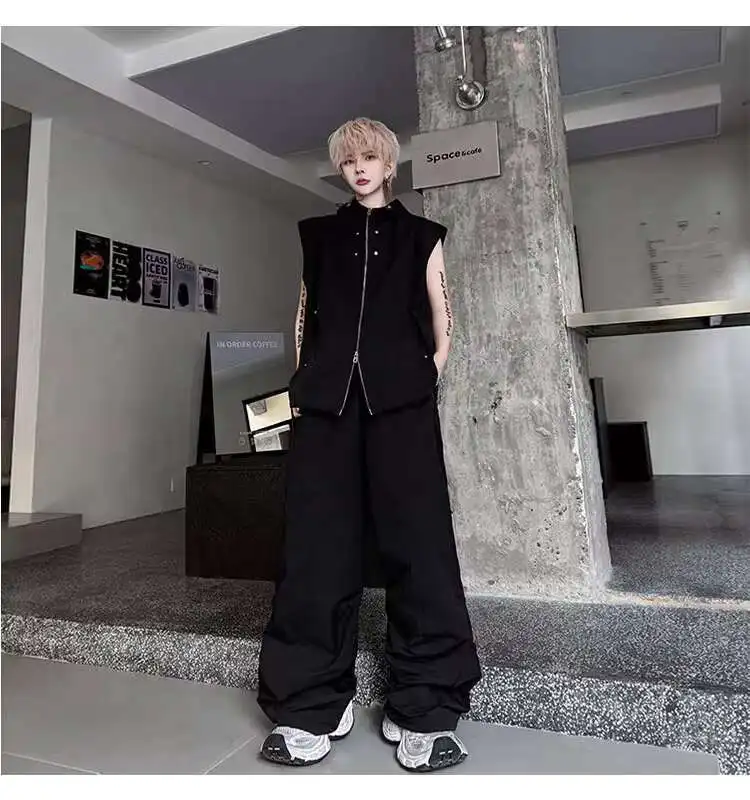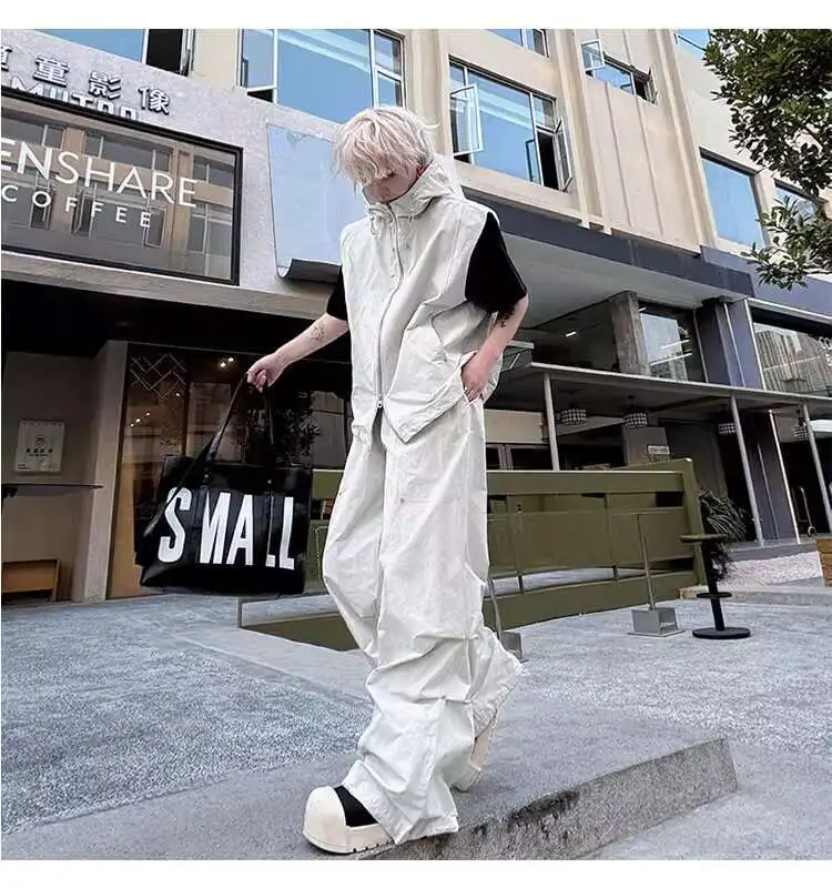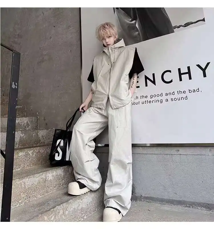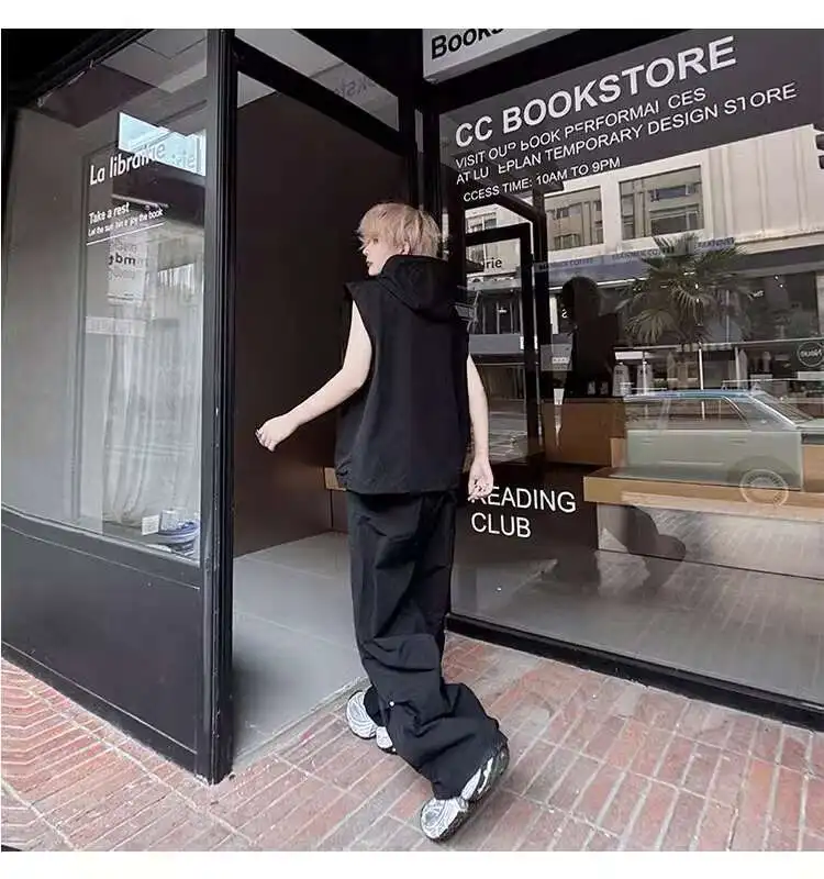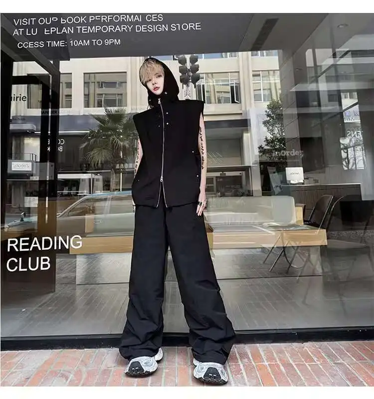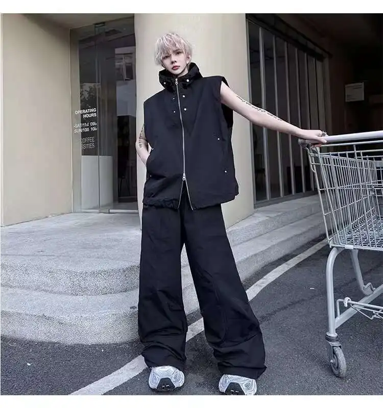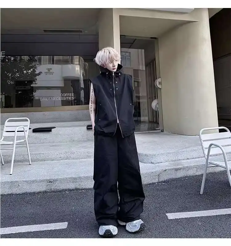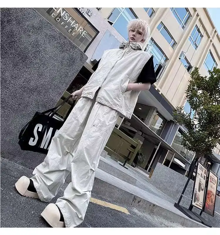 Men's Pants Set New Summer Solid Color Rivet Hooded Trendy Singel Breasted Vest Male Casual Straight Leg Pants 9W1790
