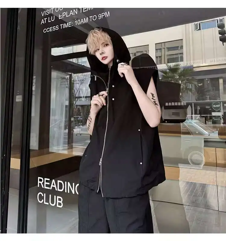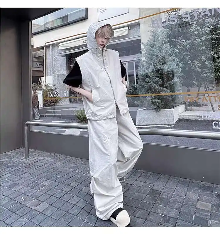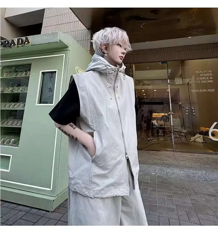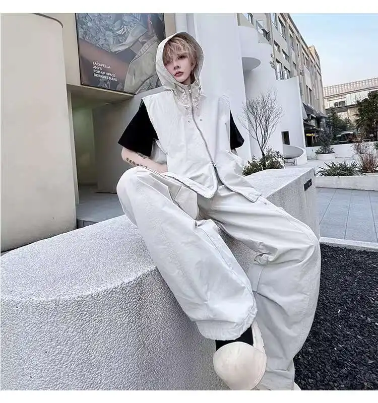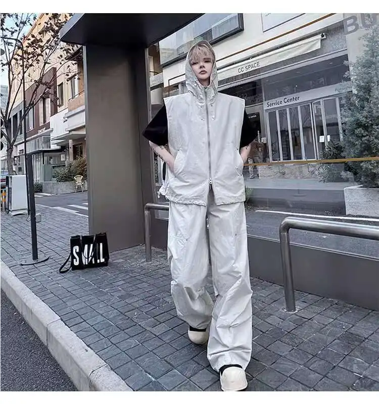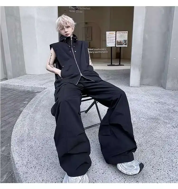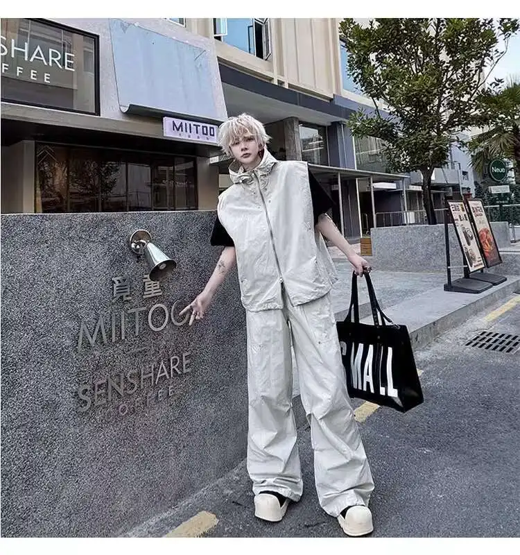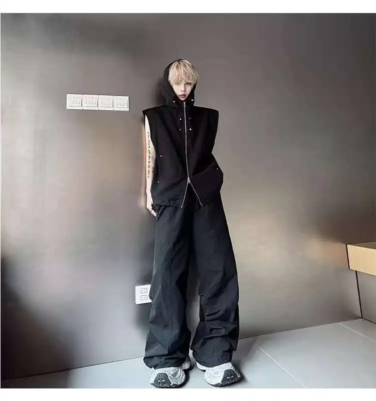 Men's Pants Set New Summer Solid Color Rivet Hooded Trendy Singel Breasted Vest Male Casual Straight Leg Pants 9W1790