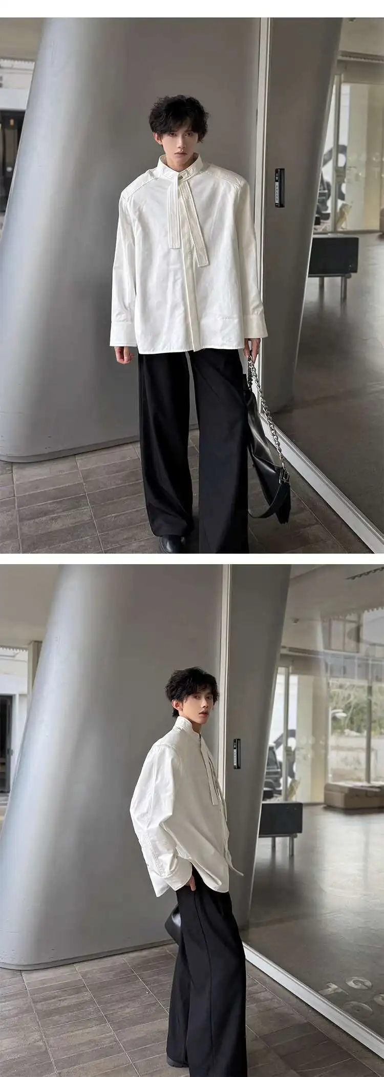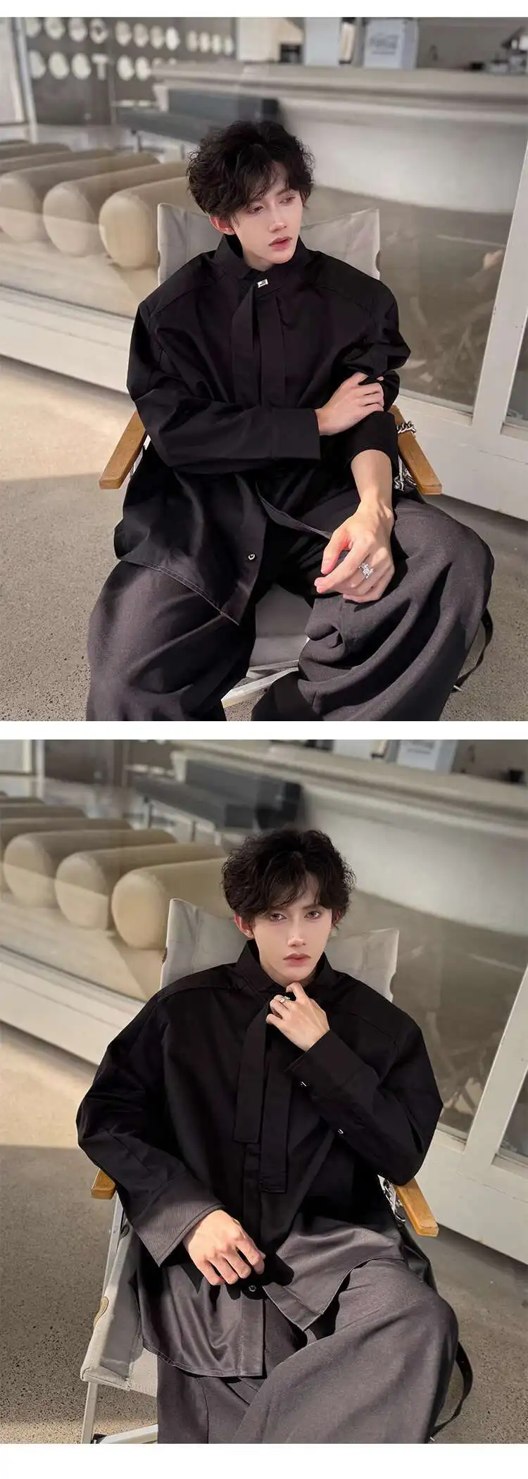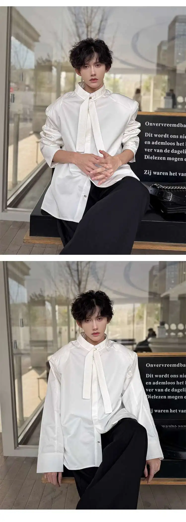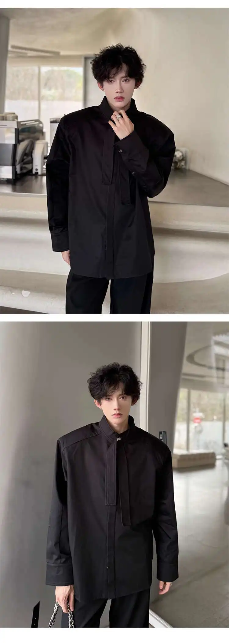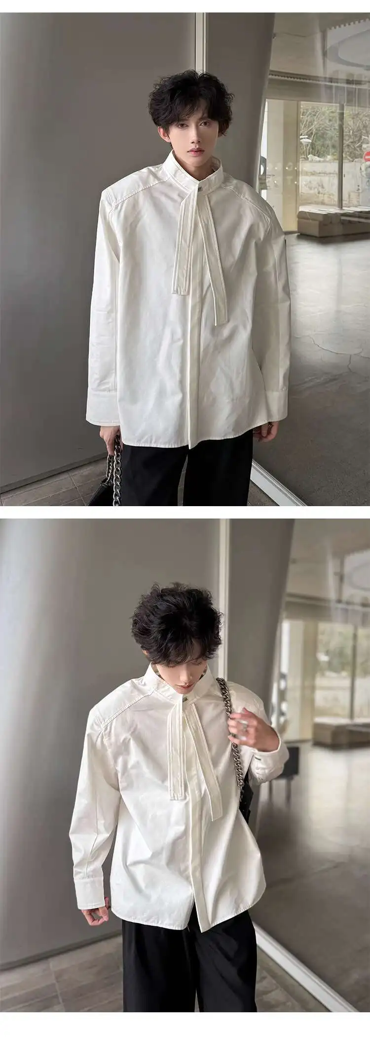 Men's Shirts Long Sleeve New Summer Korean Style Personalized Ribbon Design Turn-down Collar Solid Color Male Top 9W1753