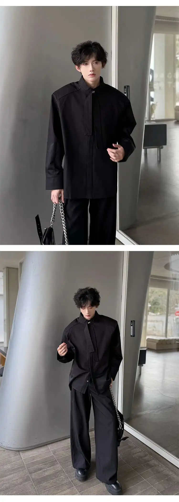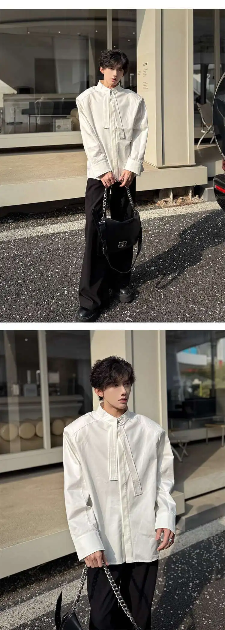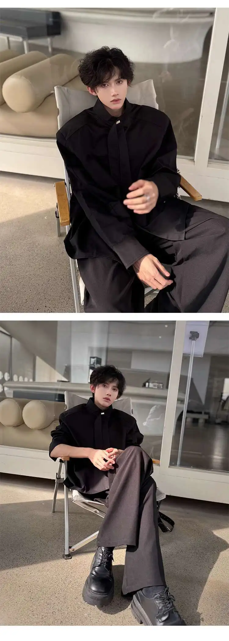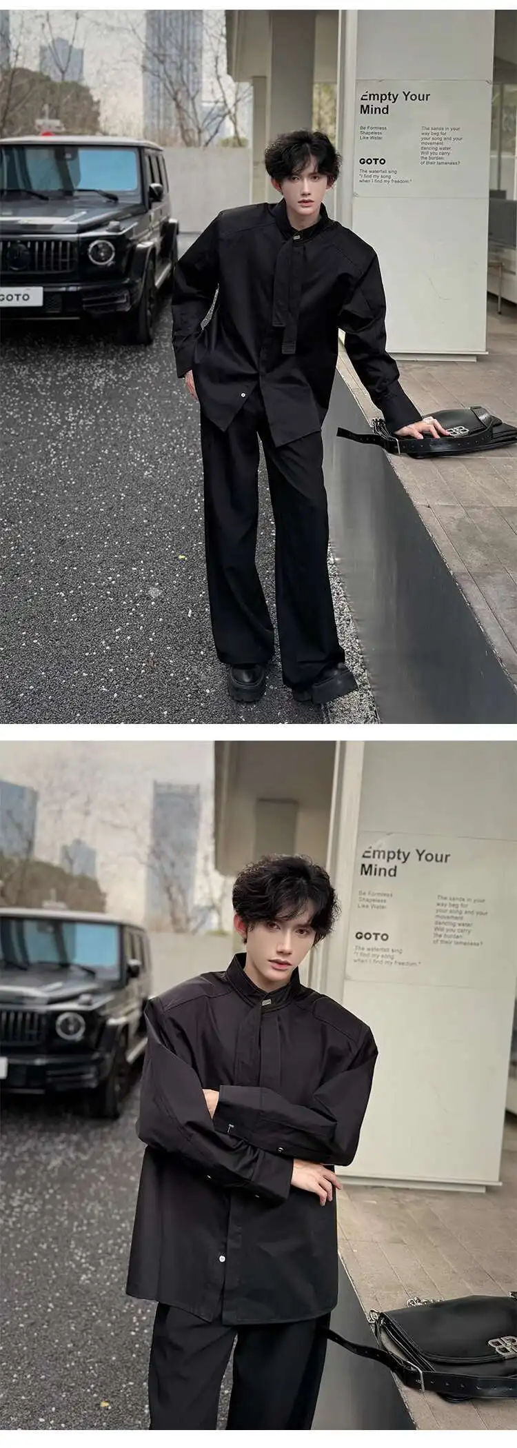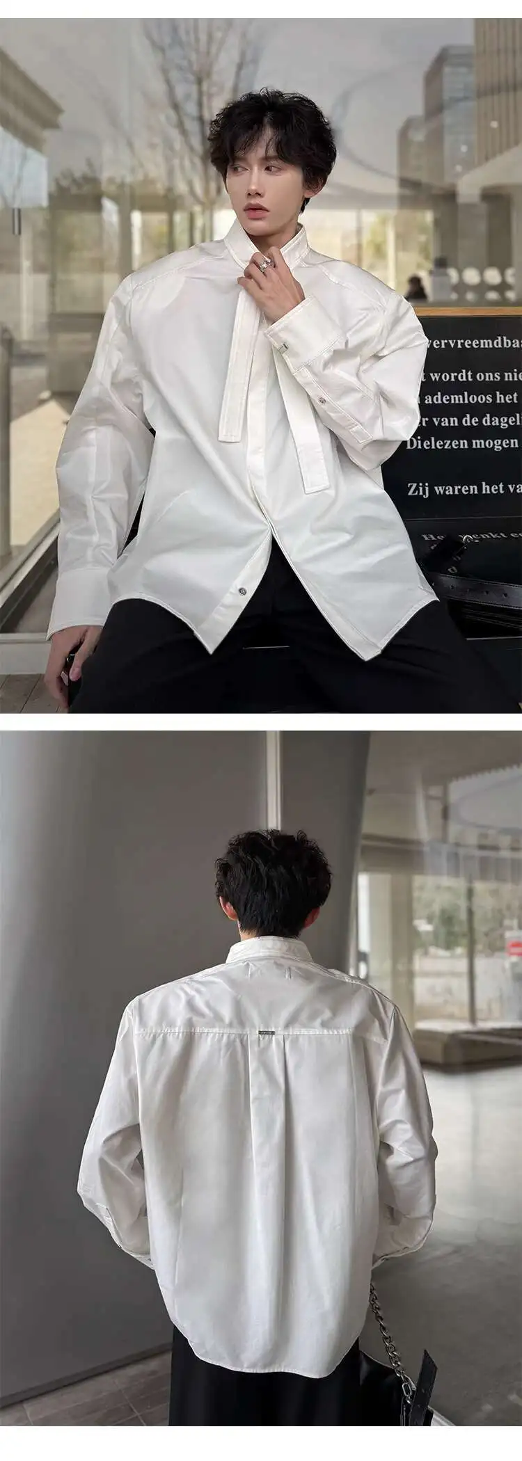 Men's Shirts Long Sleeve New Summer Korean Style Personalized Ribbon Design Turn-down Collar Solid Color Male Top 9W1753